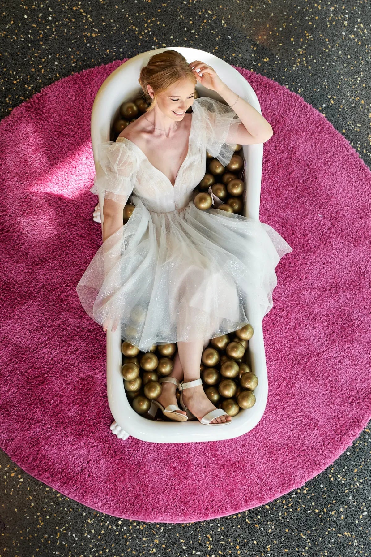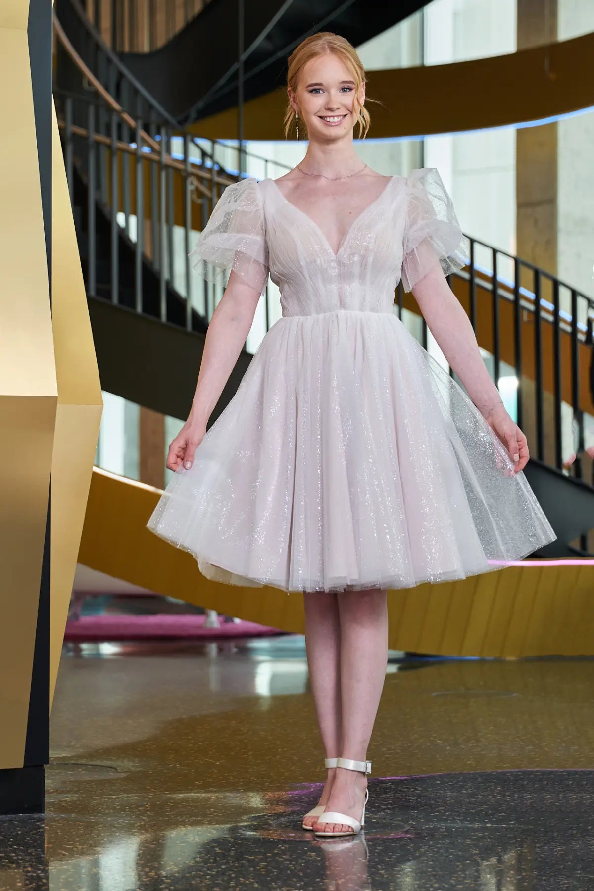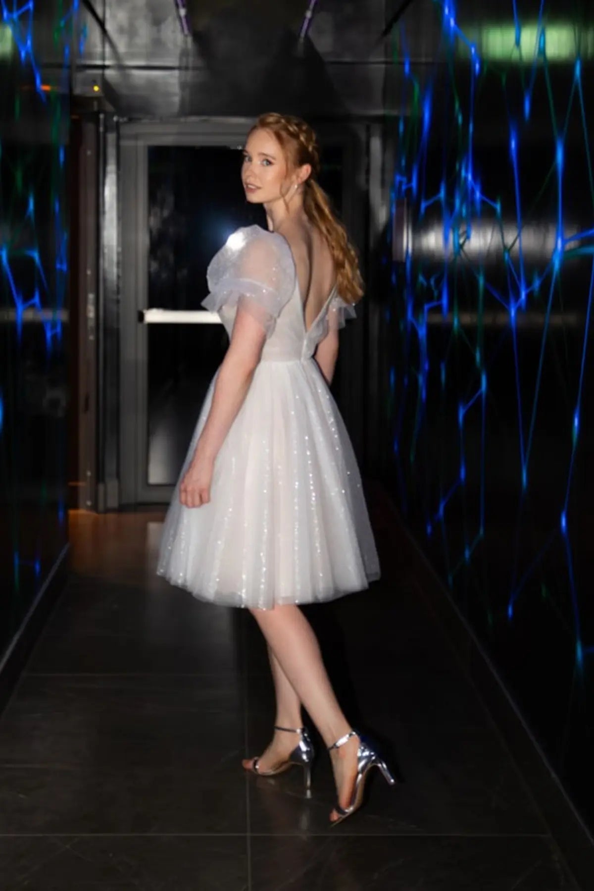 Sag "Ja" zum Bridonista Spark24-13! Dieses lustige Partykleid ist perfekt für einen märchenhaften Hochzeitslook! Mit dem V-Ausschnitt, der A-Linien-Silhouette, dem glitzernden Material aus Tüll und den niedlichen Puffärmeln wirst du definitiv die Ballkönigin sein. Und mit den Rüschen in der Corsage bist du bereit, dich auf dem Standesamt zu drehen. Verpasse nicht die Chance zu glänzen!