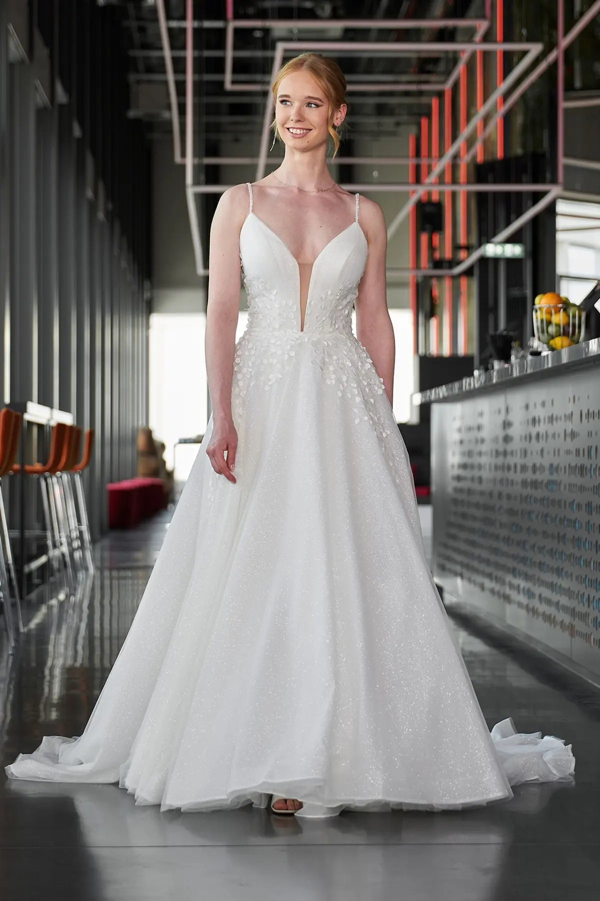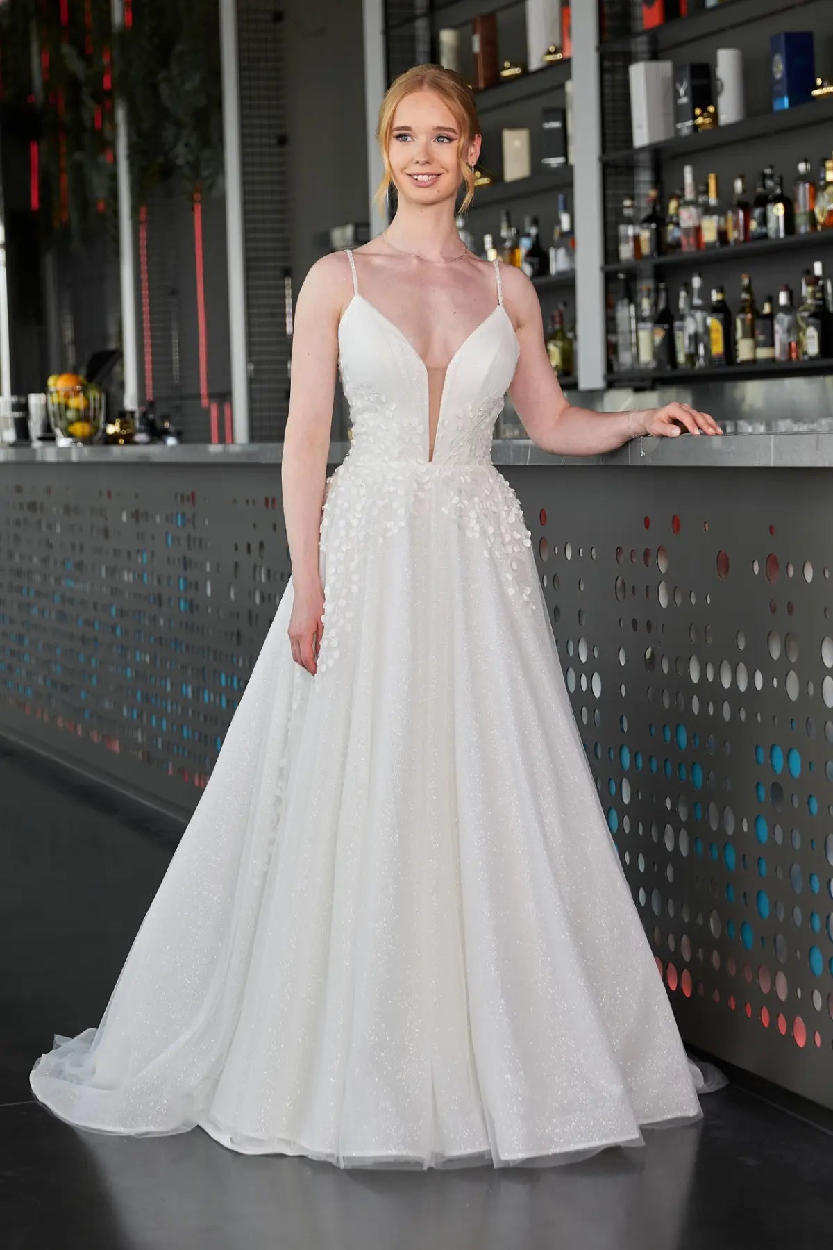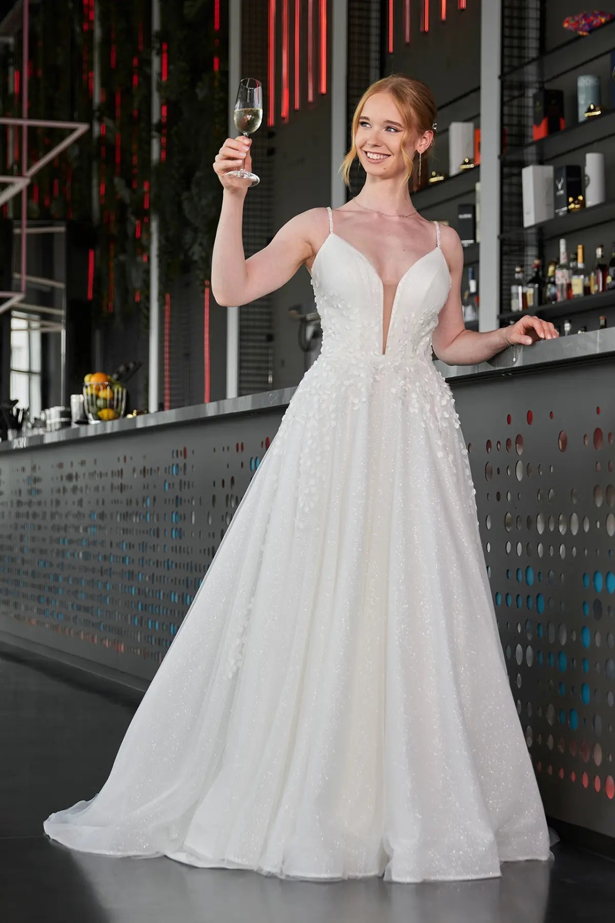 Heirate in Bridonistas Spark24-14! Dieses einzigartige Hochzeitskleid verleiht dir mit seinem glitzernden V-Ausschnitt, den funkelnden Spaghetti-Trägern und der glamourösen 3D-Spitze einen romantischen Prinzessinnen-Look. Außerdem sorgen die modernen Ausschnitte und die lange Schleppe für einen Hauch von Aschenputtel-Charme, während die A-Linien-Silhouette und das Ballkleid-Styling dafür sorgen, dass dieses Kleid wirklich einer Königin würdig ist. Lass deinen Stil an deinem besonderen Tag erstrahlen mit dem Spark24-14 aus der Sparkle Collection. #SayYesToTheDress!