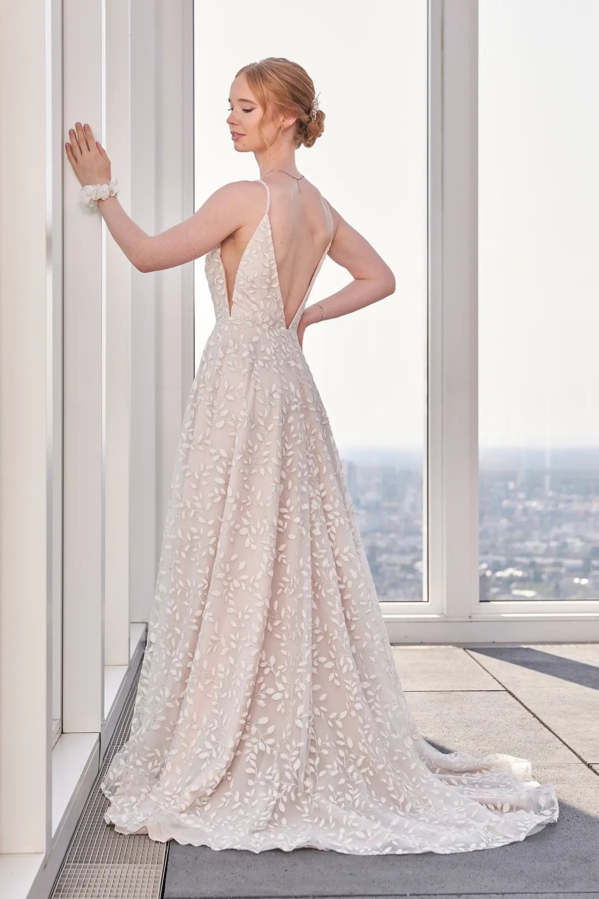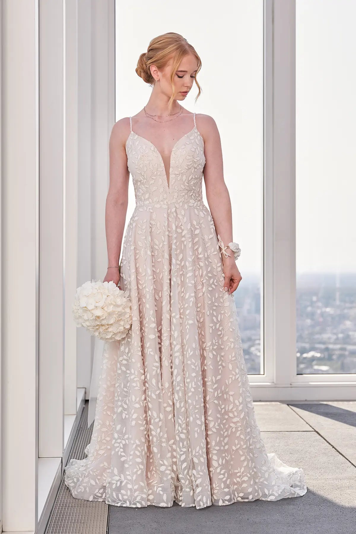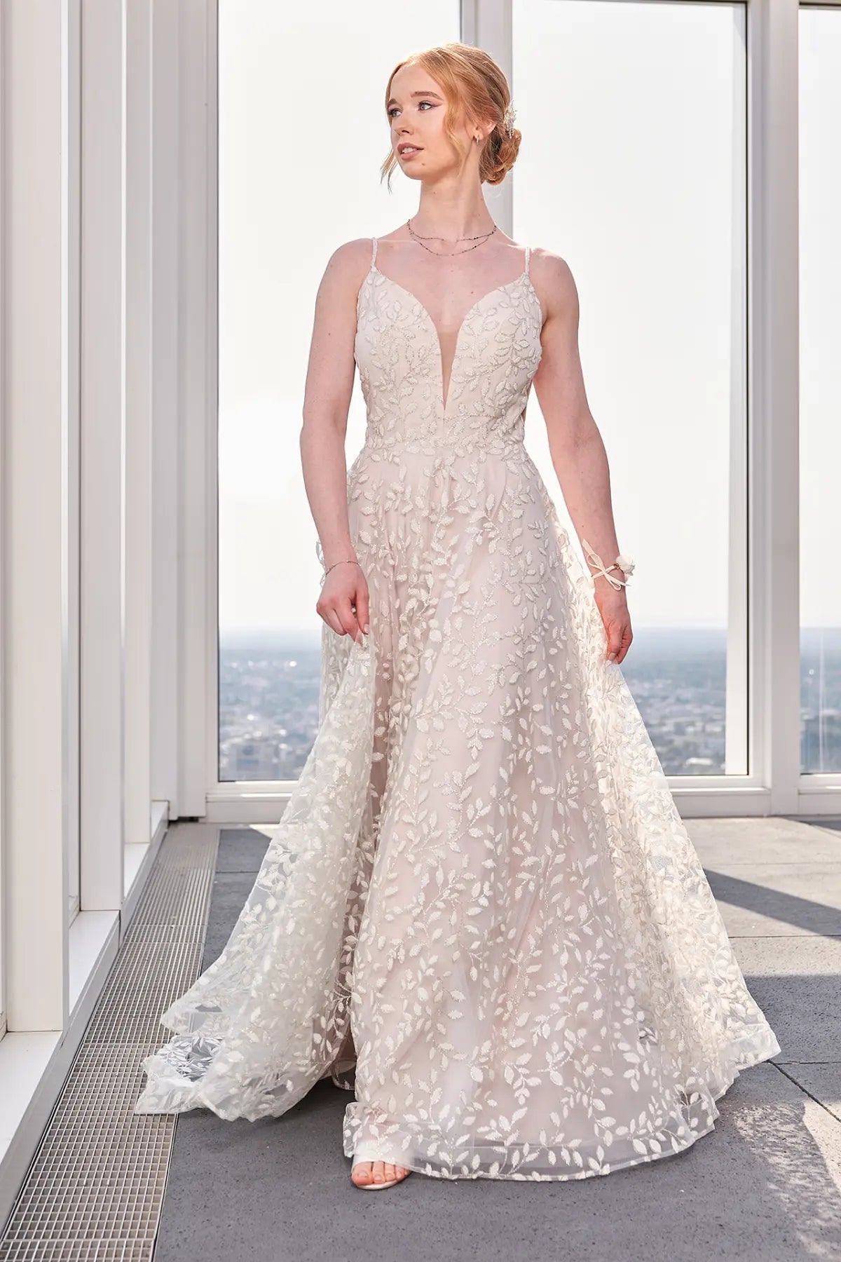 Lass die Party beginnen! In diesem glitzernden, modernen und glamourösen Spark24-16 Hochzeitskleid bist du der Mittelpunkt der Feier. Mit seinem fabelhaften V-Ausschnitt, den Spaghetti-Trägern und den Cinderella-Ausschnitten ist dieses Kleid ein wahres Schmuckstück! Ganz zu schweigen von der Blattspitze, den glitzernden Details und der feinen kurzen Schleppe, die dafür sorgt, dass du heller leuchtest als jeder andere Stern. Glänze weiter und trage Spark24-16 mit Stil!