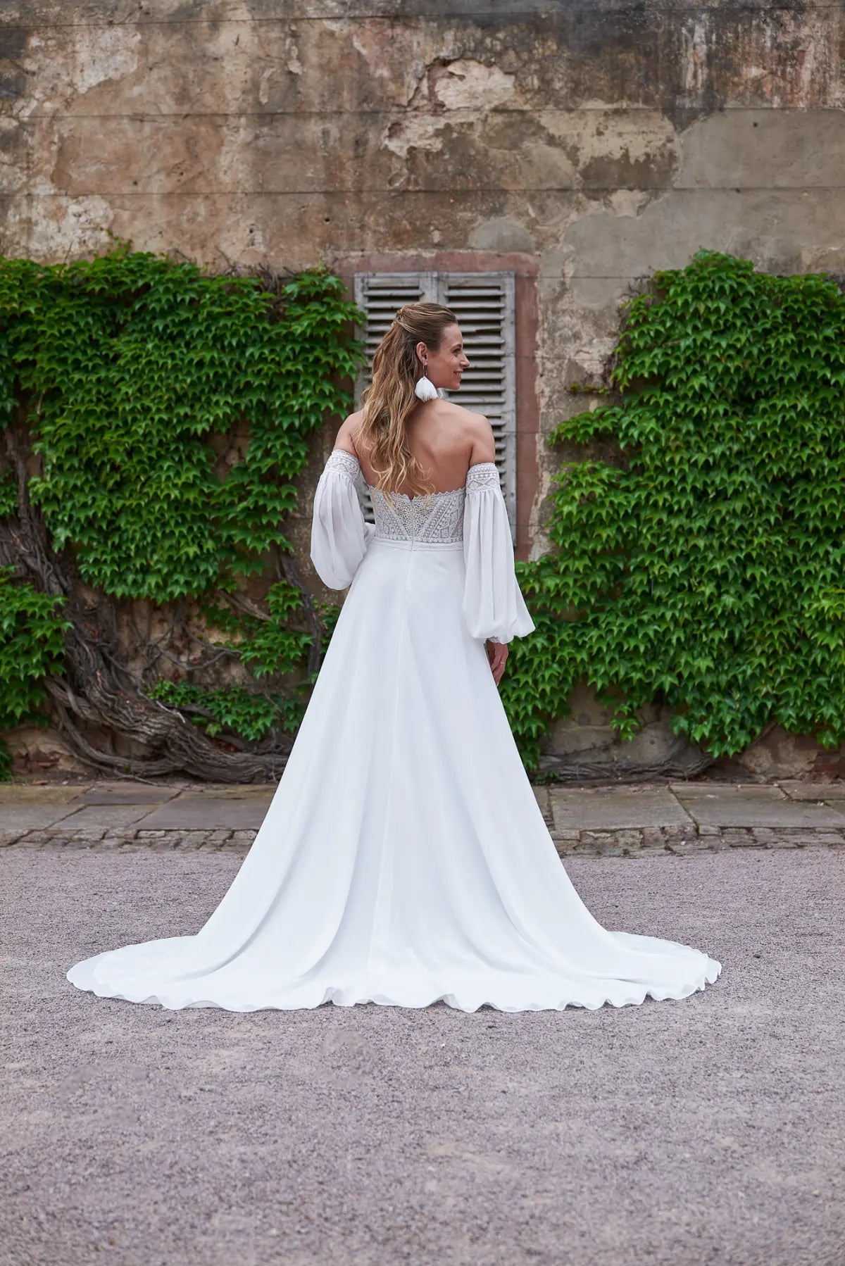 Der klassische Herzchen-Ausschnitt betont die Schultern und das Dekolleté und unterstreicht deine natürliche Schönheit ohne Glitzer und Pailletten. Die ungewöhnliche geometrische Spitze lenkt den Blick auf ein Herz in der Corsage und betont optisch deine Taille. Für einen perfekten Sitz an deinem großen Tag verfügt dieses Bridonista-Design außerdem über eine starke Corsage und Push-up-Cups, damit du dich bequem und selbstbewusst fühlen kannst. Das Highlight des Looks sind die femininen Blousonärmel aus Chiffon mit eleganten Spitzendetails. Der feine Chiffonrock schmeichelt jeder Größe und sorgt für Leichtigkeit und maximalen Komfort. Wir lieben den modernen Beinschlitz, der die klassischen Vintage-Elemente aufbricht und diesem Traumkleid einen gewagten Hauch von Raffinesse verleiht.