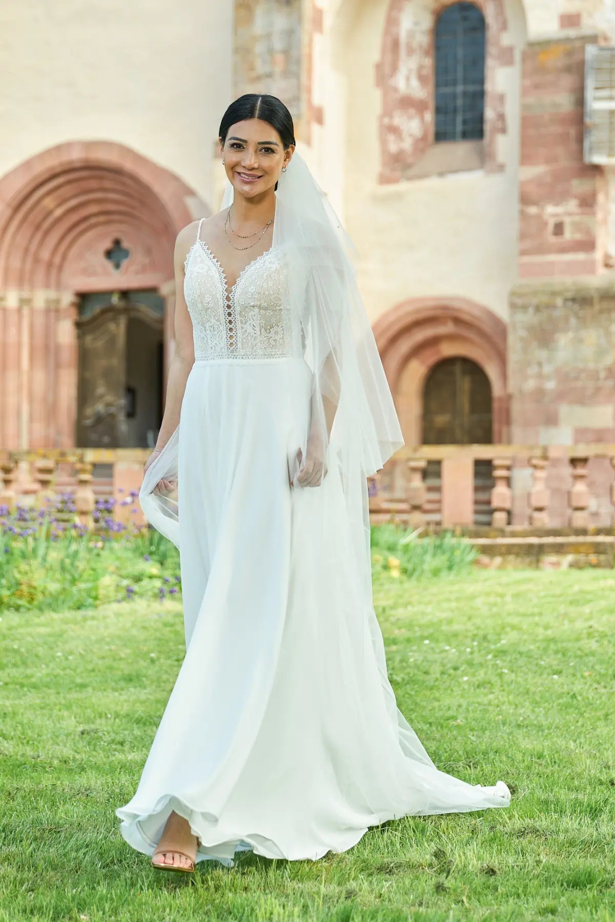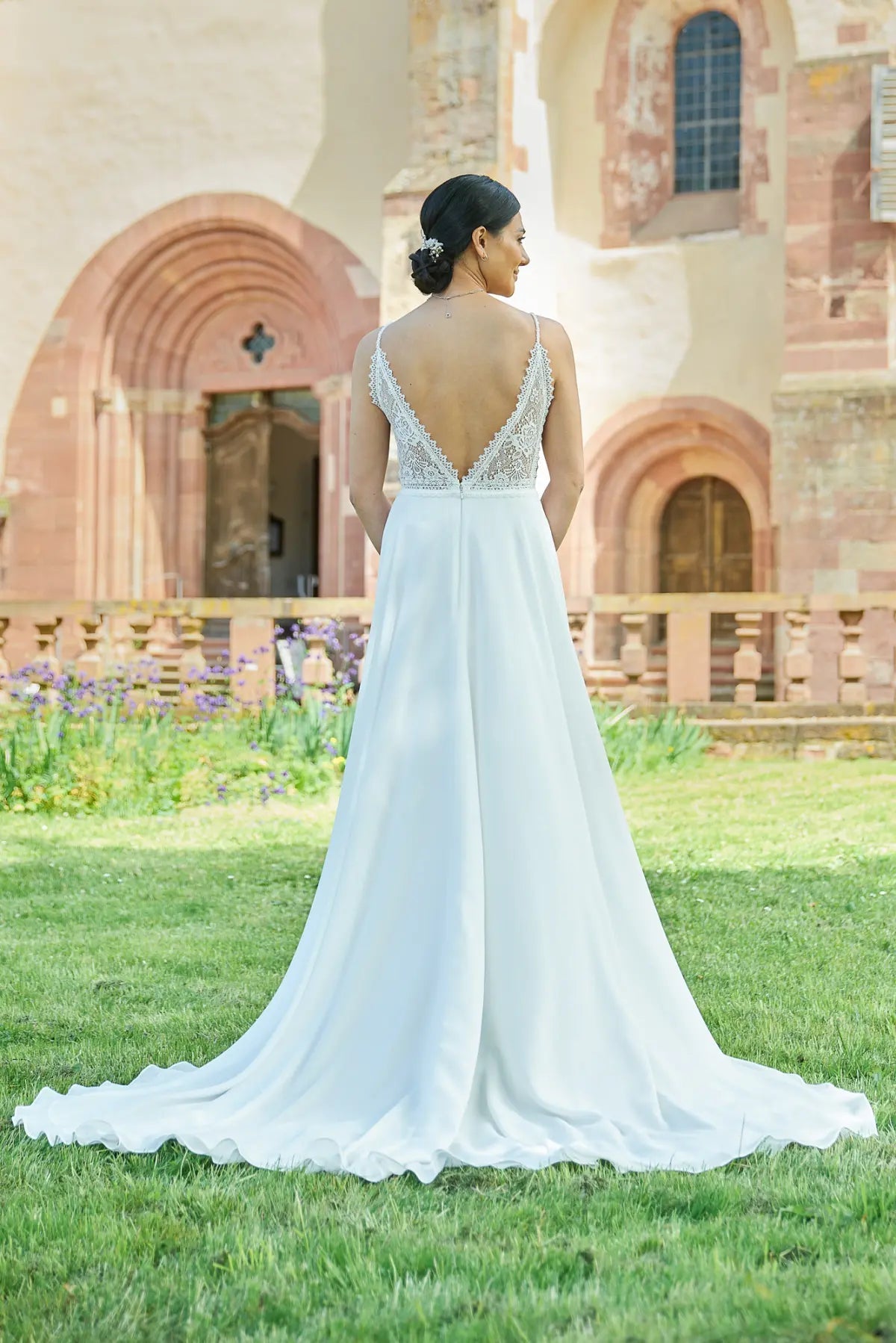 Für die Corsage wurde Vintage-Spitze mit Rosendruck gewählt und mit feinen Spitzenbändern in einem modernen V-Ausschnitt eingerahmt. Der tiefe Ausschnitt am Dekolleté streckt den Oberkörper optisch und sorgt für unvergessliche WOW-Momente aus jeder Perspektive. Der hintere Ausschnitt ist harmonisch in einem V gearbeitet. Die Vorderseite der Corsage ist mit blickdichtem Material gefüttert, während die Rückseite transparent ist. Die Spaghetti-Träger sind von Hand mit Perlen bestickt und verleihen dem verspielten Brautlook einen neuen Schimmer von Eleganz. Für den perfekten Sitz verfügt dieses Bridonista-Design außerdem über eine starke Corsage und Push-up-Cups, damit du dich an deinem großen Tag selbstbewusst und wunderschön fühlen kannst. Ein weiteres wunderschönes Detail ist das Taillenband, das deine weiblichen Kurven akzentuiert und das Design perfekt abrundet. Der kreisförmige Rock ist aus feinem Chiffon geschneidert, überrascht mit einem Beinschlitz und unterstreicht mit seiner Schlichtheit die aufregenden Details der Corsage.