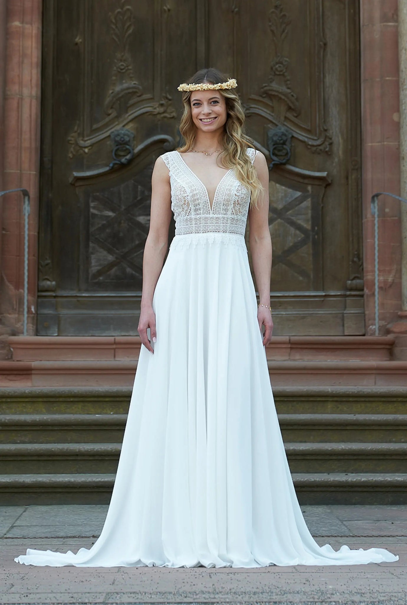 Dieses Hochzeitskleid ist mit haut-/ oder elfenbeinfarbenem Tüll in der Corsage erhältlich, der Rock ist aus elfenbeinfarbenem Chiffon und gefüttertem Material.