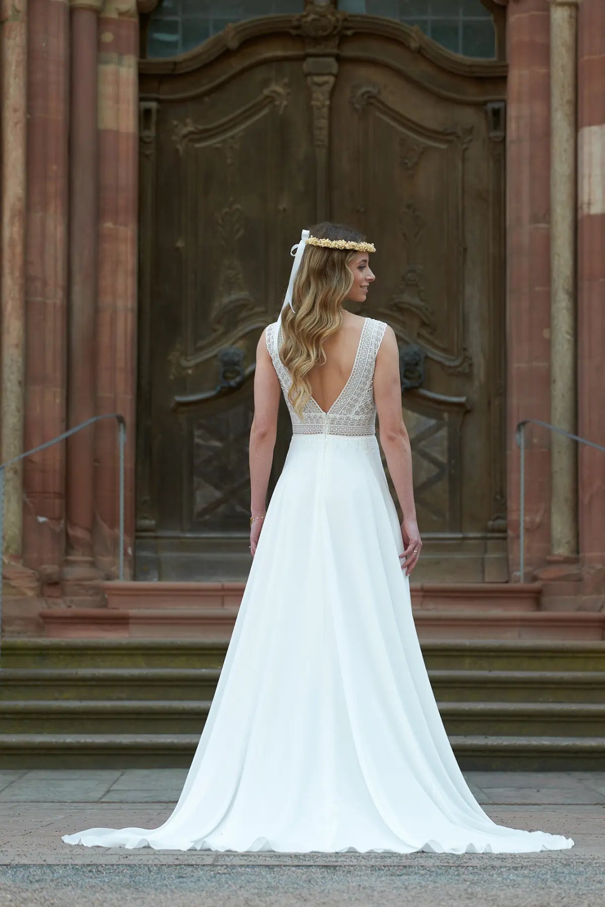 Die Vintage-Kollektion ist nicht nur verspielten Looks gewidmet, sondern zelebriert auch geradlinige Schneiderkunst. Der V-Ausschnitt aus geometrischer Makramee-Spitze zaubert ein feminines Dekolleté und setzt jede Oberweite und Form in ein schmeichelhaftes Licht. Die verschiedenen Muster der Spitze sind kreativ angeordnet und bilden eine ausgewogene Struktur. Der hintere Ausschnitt ist ebenfalls in V-Form gestaltet und fügt sich mühelos in das Zusammenspiel von geometrischen und floralen Formen ein. Für den perfekten Sitz verfügt dieses Bridonista-Design außerdem über eine starke Corsage und Push-up-Cups, damit du dich an deinem großen Tag selbstbewusst und wunderschön fühlen kannst. Der kreisförmige Rock ist in ein breites Taillenband eingefasst, das deine Taille betont und ein Gegengewicht zu dem feinen Chiffonrock bildet.