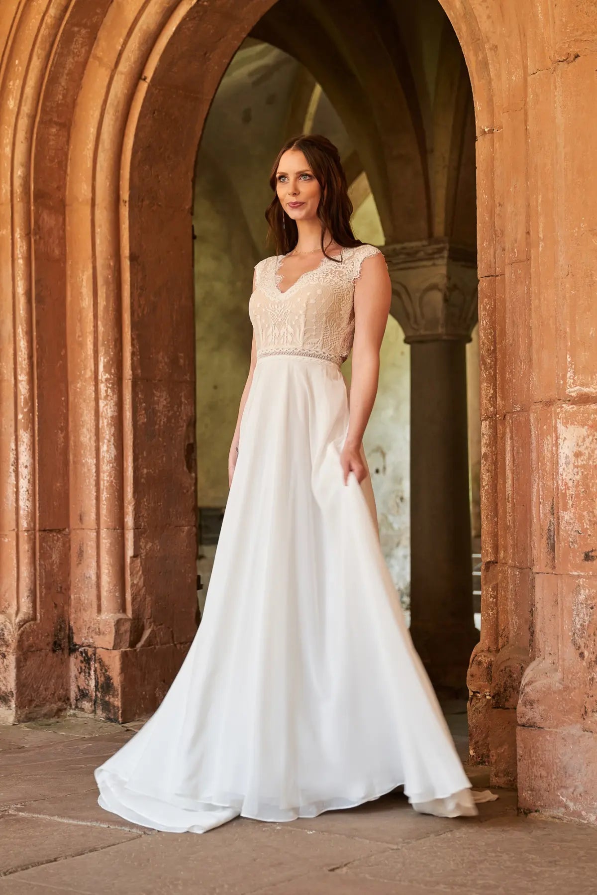 Dieses Hochzeitskleid ist mit haut- oder elfenbeinfarbenem Tüll in der Corsage erhältlich, der Rock ist aus elfenbeinfarbenem Chiffon und gefüttert.