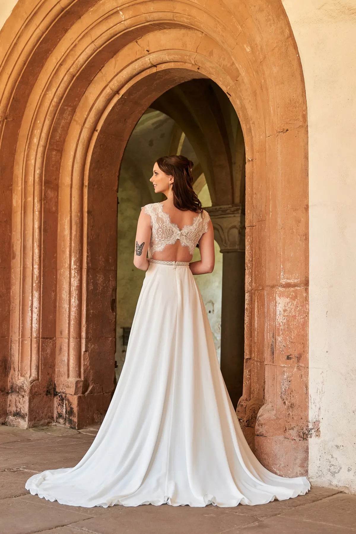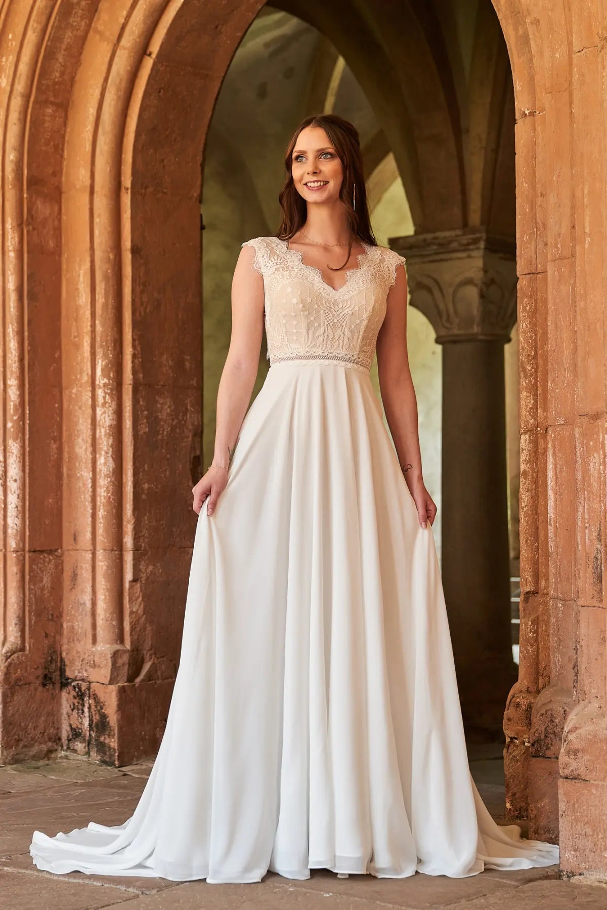Die feine Chantilly-Spitze mit Wimpernspitze rahmt den V-Ausschnitt traditionell ein, was sich in den modernen Seitenausschnitten mit Illusionstüll widerspiegelt. Vorne ist die Corsage mit Futterstoff unterlegt, an den Schultern und im Rücken schimmert deine Haut durch die transparente Chantilly-Spitze und unterstreicht deine natürliche Schönheit. Die Flügelärmel geben diesem Traumkleid einen verspielten und doch konservativen Tenor. Das Spitzenband an der Taille akzentuiert den weiblichen Körper und greift die runden Formen der Spitze harmonisch auf. Für den perfekten Sitz verfügt dieses Bridonista-Design außerdem über eine starke Corsage und Push-up-Cups, damit du dich an deinem großen Tag selbstbewusst und wunderschön fühlen kannst. Ein schickes Schlüsselloch im Rücken setzt ein weiteres Highlight und sorgt für einen unvergesslichen WOW-Moment bei deiner Hochzeit. Der leichte Chiffonrock verleiht diesem Stil einen verspielten und doch edlen Touch. Die kurze Schleppe ist unkompliziert und pflegeleicht, verleiht dir aber trotzdem einen Hauch von Braut.