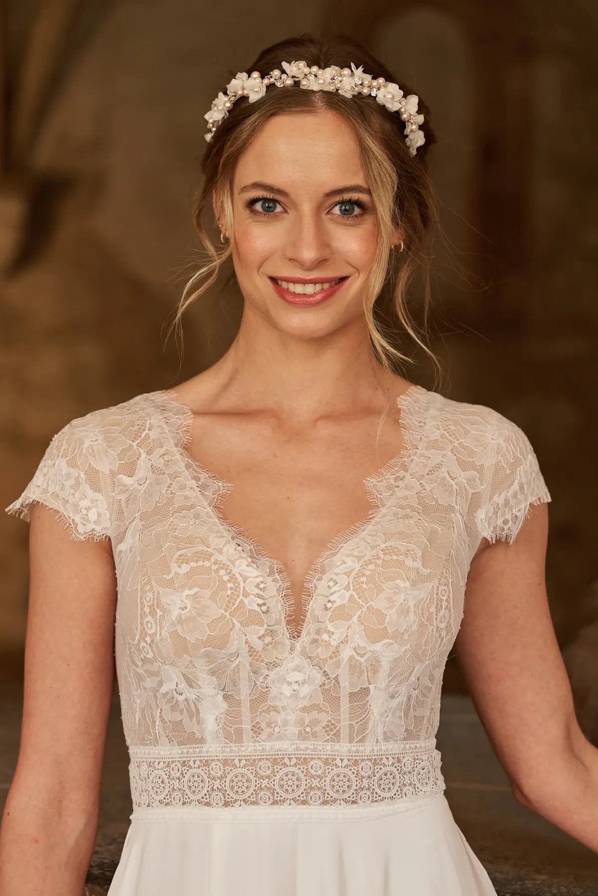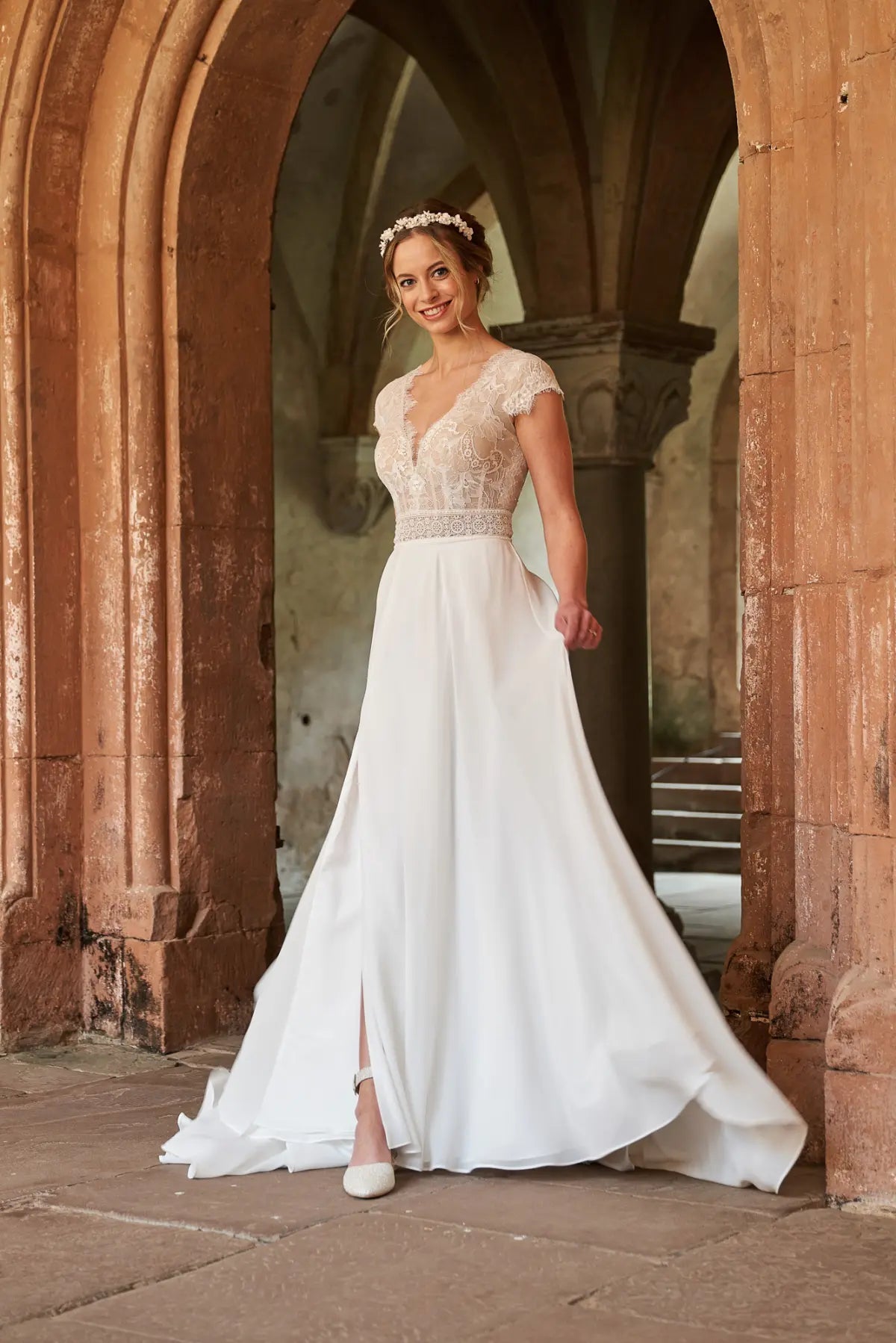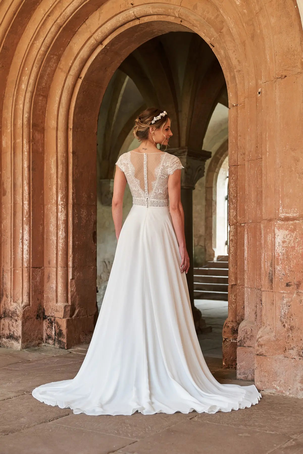 Die Corsage besticht durch ihre Zartheit und kombiniert eine feine Chantilly-Spitze im floralen Design mit einem ornamentalen Spitzenband an der Taille. Dieser Kontrast wird durch eine feminine Transparenz und eine feine Wimpernkante am V-Ausschnitt abgemildert. Bridonista ist eine detailverliebte Designerin, daher findet sich die Wimpernkante auch an den Flügelärmeln wieder. Für den perfekten Sitz verfügt dieses Bridonista-Design außerdem über eine starke Corsage und Push-up-Cups, damit du dich an deinem großen Tag selbstbewusst und wunderschön fühlen kannst. Ein besonderes Designelement ist die lange Knopfleiste, eingebettet in einen exquisiten gepunkteten Tüll, am Rücken. Die vielseitige Komposition aus verschiedenen Materialien im Rückenbereich sorgt dafür, dass Style V24-07 ein absolutes Vintage-Mode-It-Piece ist. Der Tellerrock in A-Linienform ist aus einem hochwertigen Chiffon geschneidert und spiegelt die Leichtigkeit der Corsage wider.