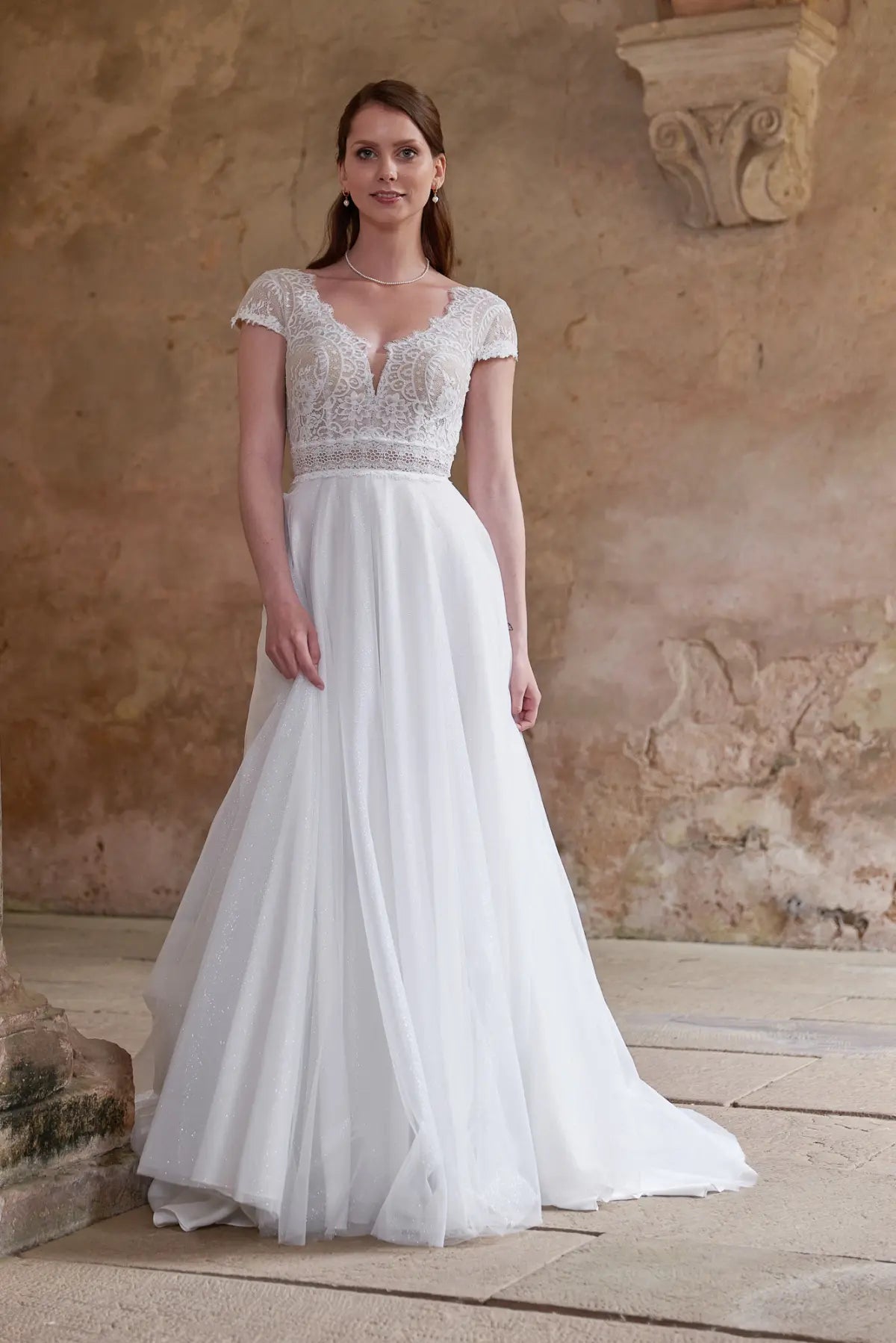 Style V24-08 zieht dich mit einem Stilbruch in seinen Bann. Diese A-Linie kombiniert ein feines Vintage-Top mit einem Cinderella-Tüllrock. Neugierig? Buche jetzt deine Beratung bei einem Bridonista-Händler und finde dein Traumkleid.