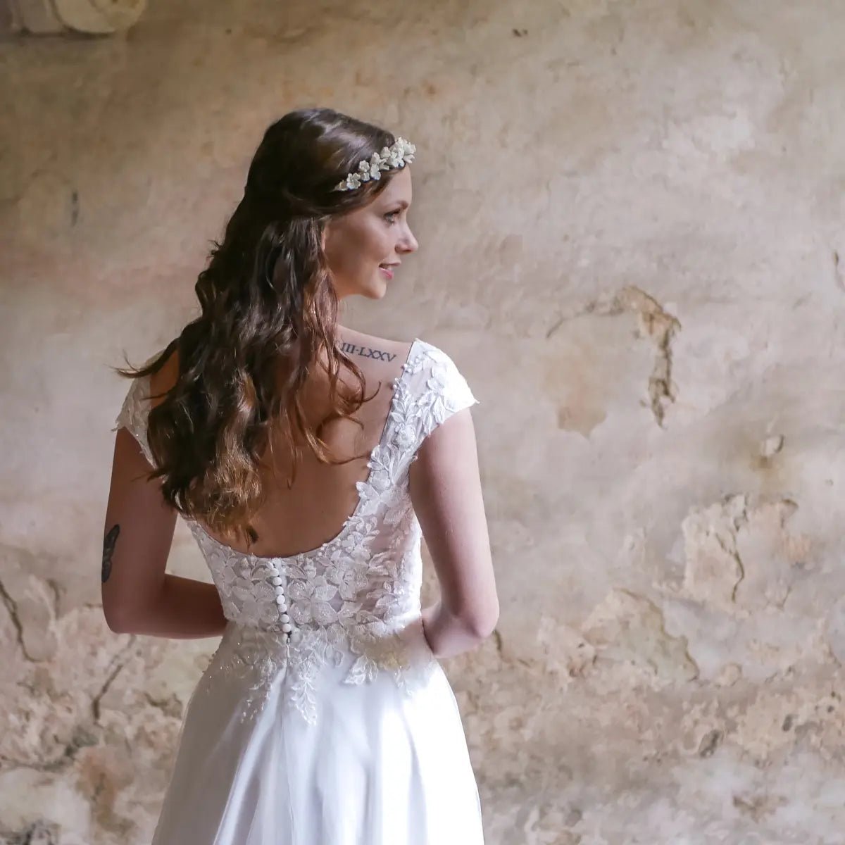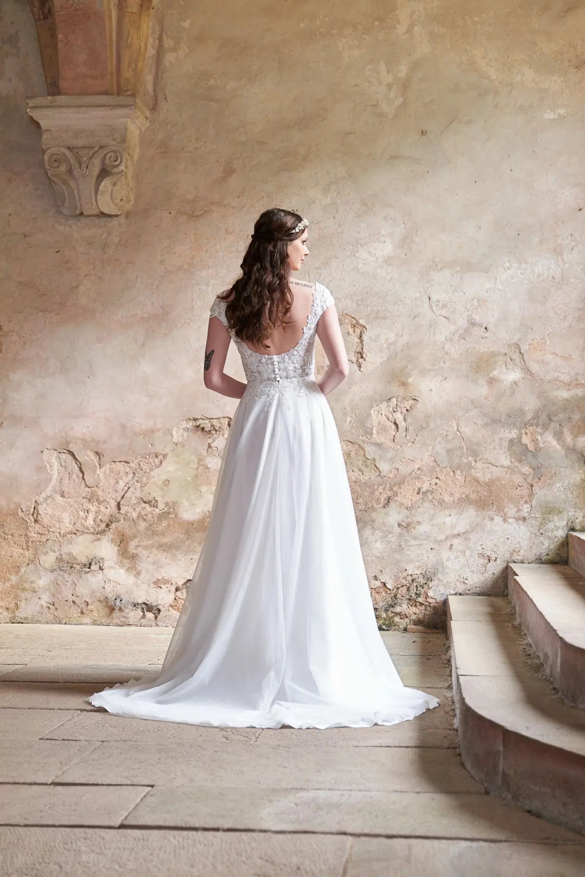 Du heiratest in der Kirche und möchtest Schultern und Ausschnitt angemessen bedecken, aber nicht auf ein modernes Design mit einem femininen Hauch von Transparenz verzichten? Liebe zukünftige Braut, das Modell V24-12 aus der Bridonista Vintage Collection wird dich verzaubern.