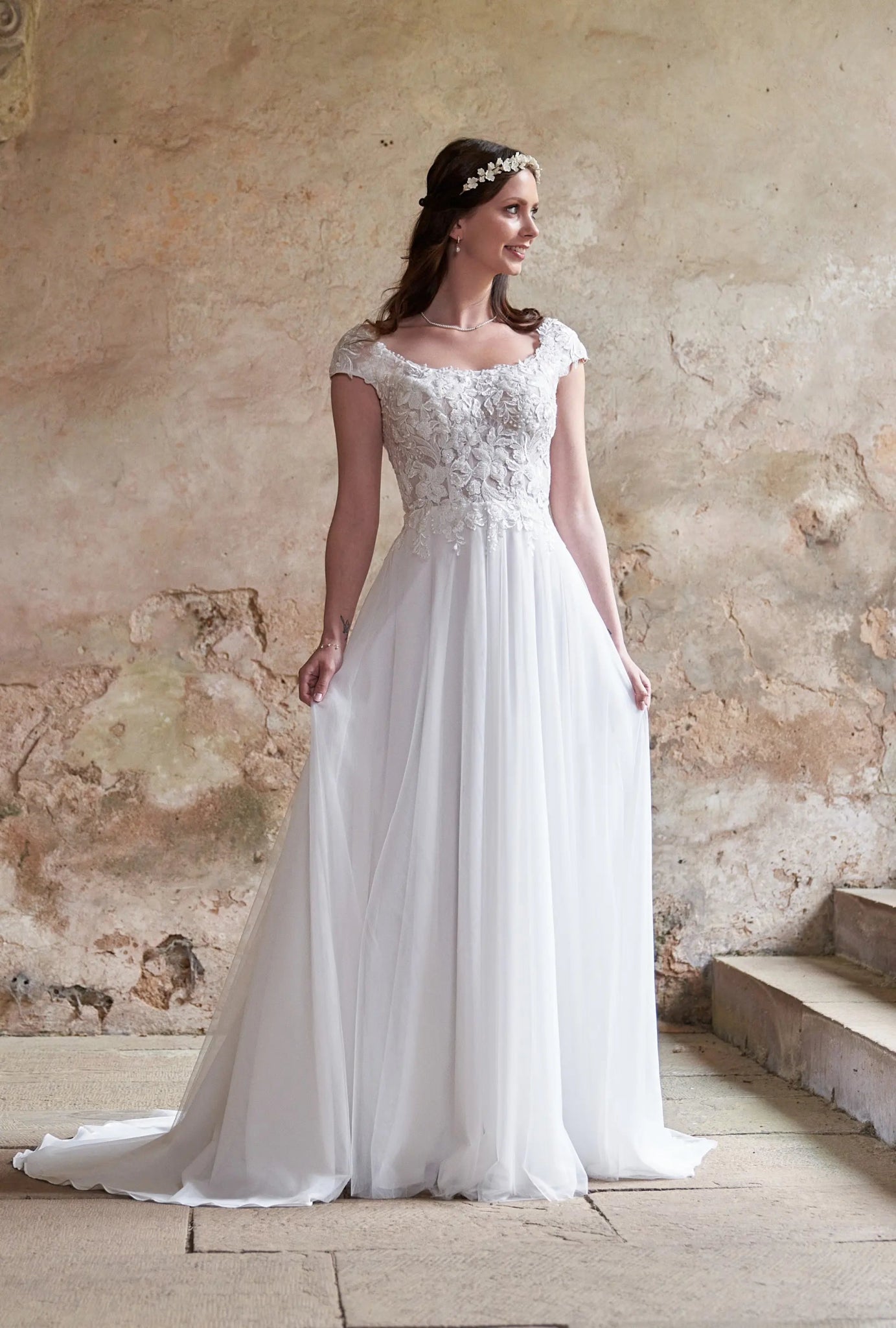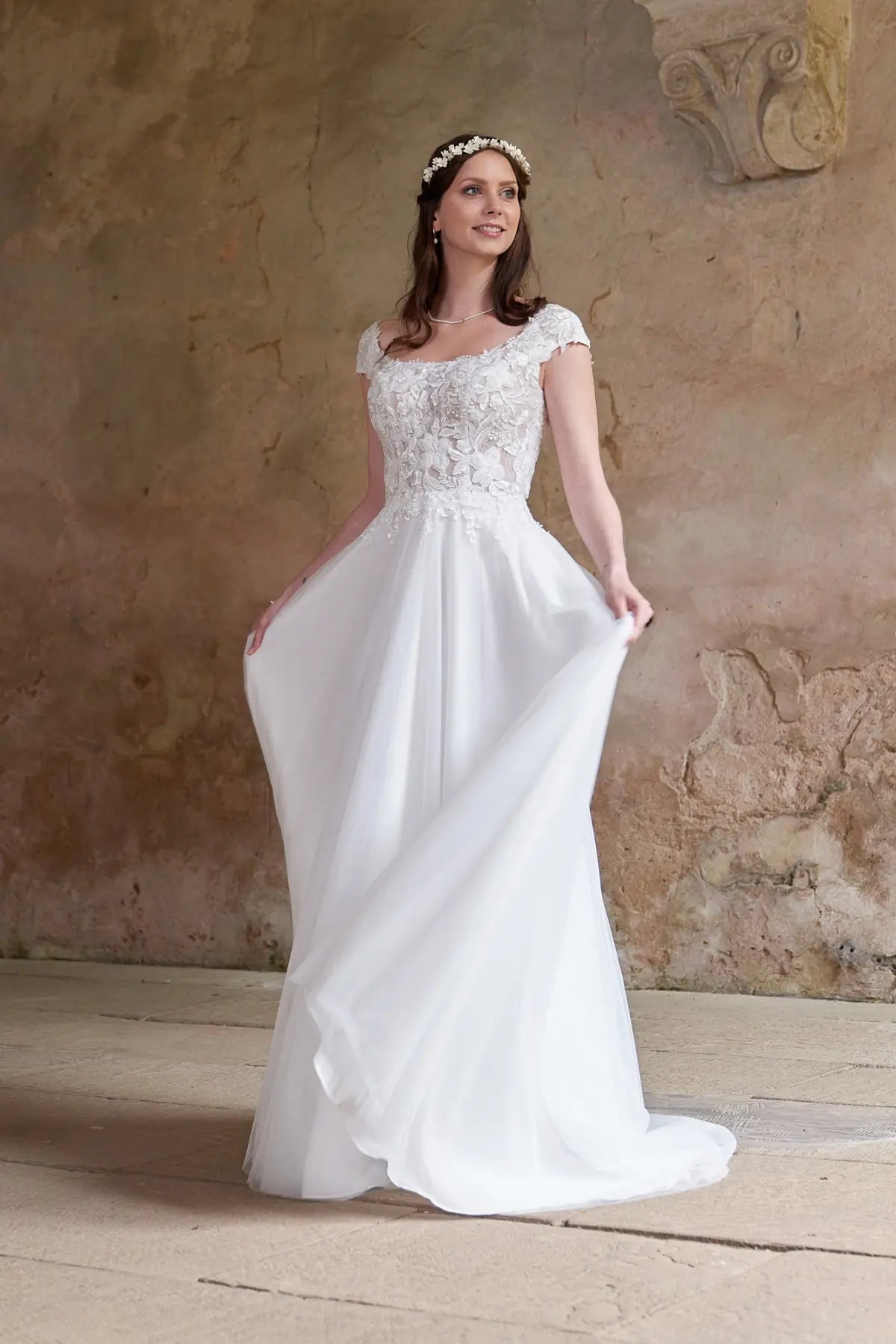 Der abgerundete Carrée-Ausschnitt mit Cap-Ärmeln betont deine femininen Kurven und kleidet Frauen in allen Konfektionsgrößen vorteilhaft. Diese Ausschnittform wird durch eine starke Corsage und Push-up-Cups unterstützt, damit du dich an deinem großen Tag selbstbewusst und wunderschön fühlen kannst. Der hintere Ausschnitt ist ebenfalls als abgerundetes Carrée gestaltet und fügt sich harmonisch in das Design ein. Die florale Spitze besteht aus kleinen und größeren Blumen und ist von Hand mit feinen Pailletten und Kristallen bestickt. Wie in einem Garten ranken sich die Blumen und Blätter über die Corsage in die Taille und den Rock. Bewusst tritt der schlichte Tüllrock in den Hintergrund und überlässt die Bühne der aufwändig gearbeiteten Corsage.