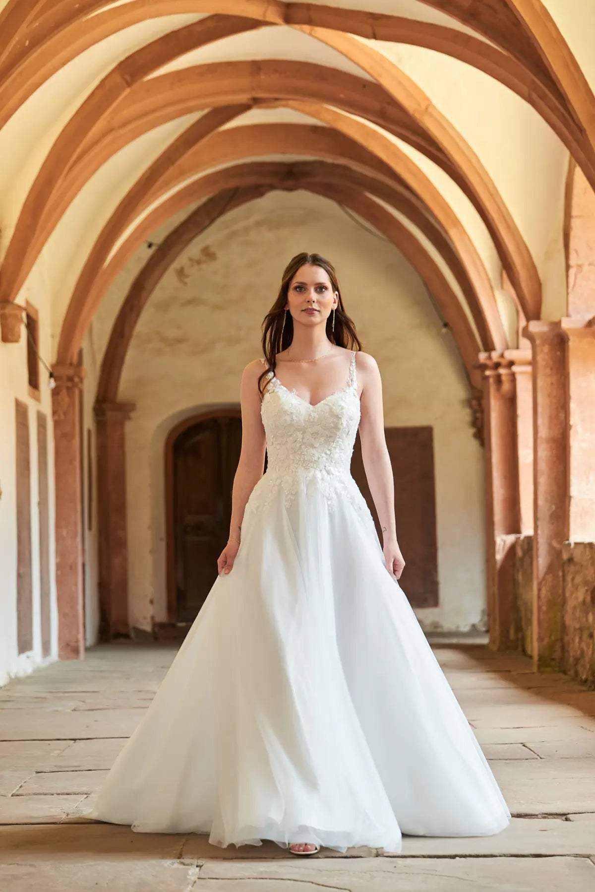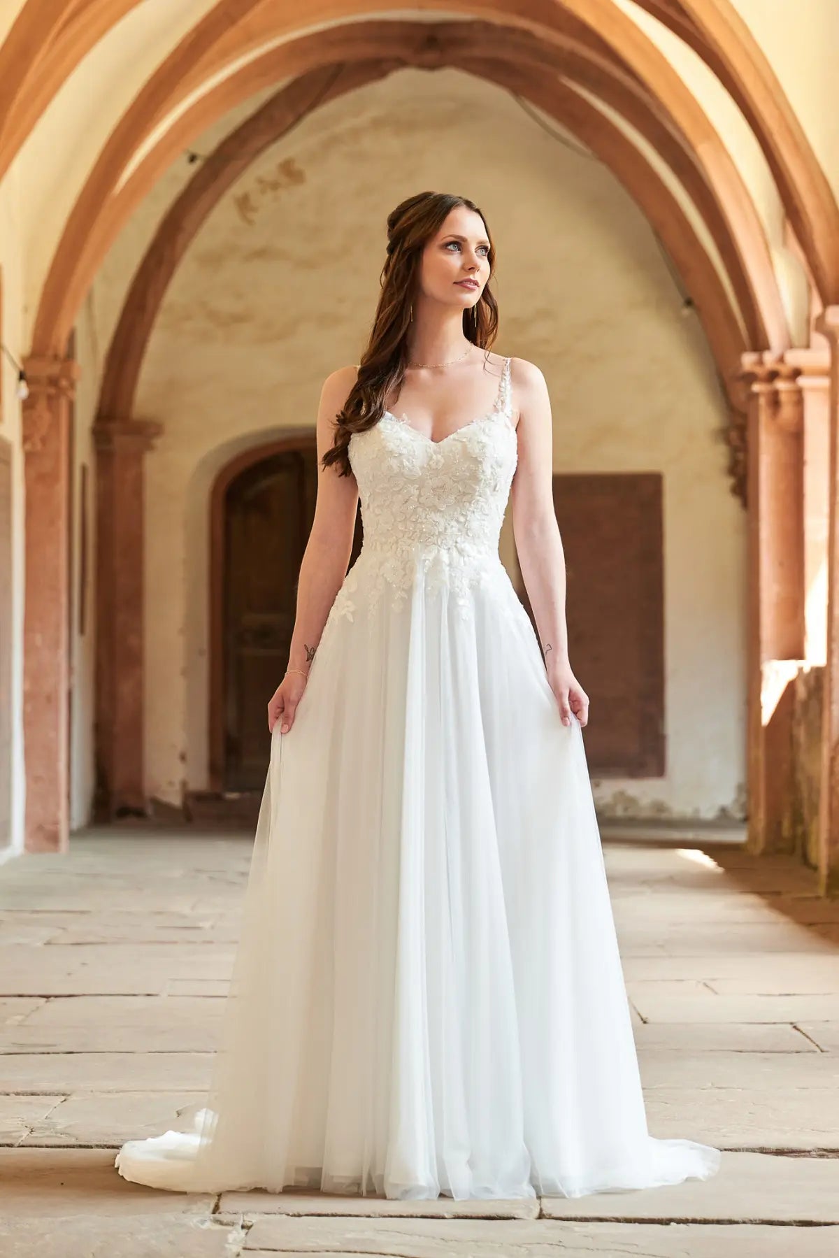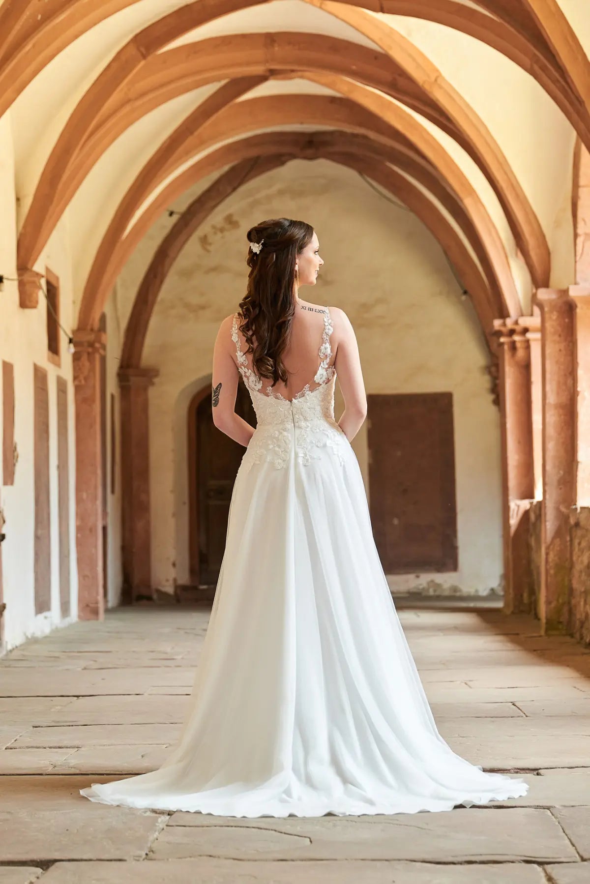 Nicht jede Braut möchte eine durchsichtige Corsage, deshalb gibt es in allen Bridonista-Kollektionen auch blickdichte Corsagen. Zum Beispiel das Modell V24-15, eine aufwendig gearbeitete A-Linie, die als Vintage-Glam-Traumkleid bezeichnet werden kann.