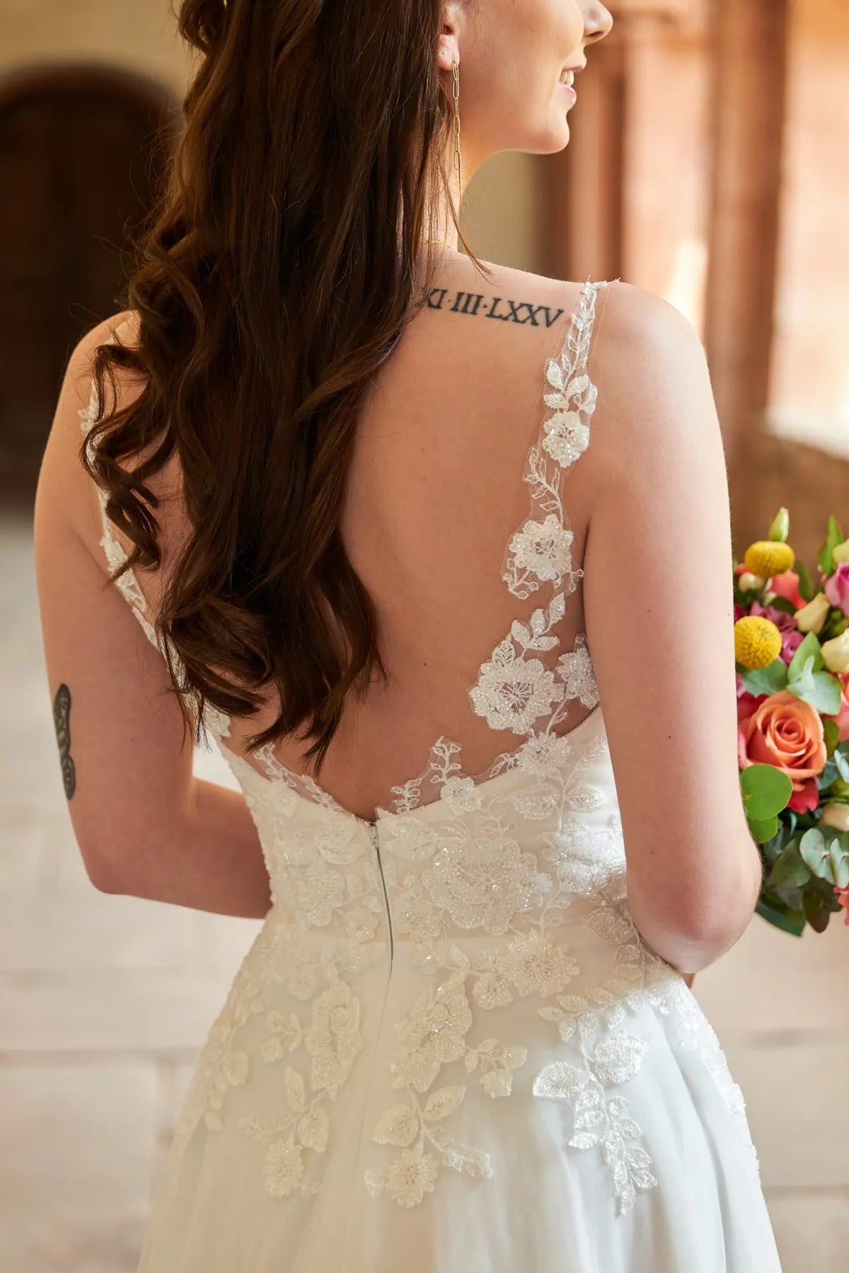 Die klassische Herzcorsage ist mit floraler Spitze besetzt, die von Hand mit Kristallen, Pailletten und feinen Perlen bestickt ist. Die Stickerei verleiht dem Stil einen glamourösen Glanz und hebt sich von den oft matten Vintage-Looks ab. Die Spitze verlauft organisch in den transparenten Trägern mit Tattoo-Effekt und vermittelt elfenhafte Leichtigkeit. Für den perfekten Sitz verfügt dieses Bridonista-Design außerdem über eine starke Corsage und Push-up-Cups und ist außerdem vorne und hinten mit Futterstoff gefüttert; so kannst du dich an deinem großen Tag selbstbewusst und wunderschön fühlen. Die Schichtung der verschiedenen Materialien sorgt für einen weichen, mehrfarbigen Effekt, der jedem Hauttyp schmeichelt und dafür sorgt, dass das Kleid im Licht schillert. Der Tüllrock lenkt nicht von der aufwendigen Corsage ab und ist mit einer kurzen Schleppe schlicht gehalten, was für unkomplizierte Brautstimmung sorgt.