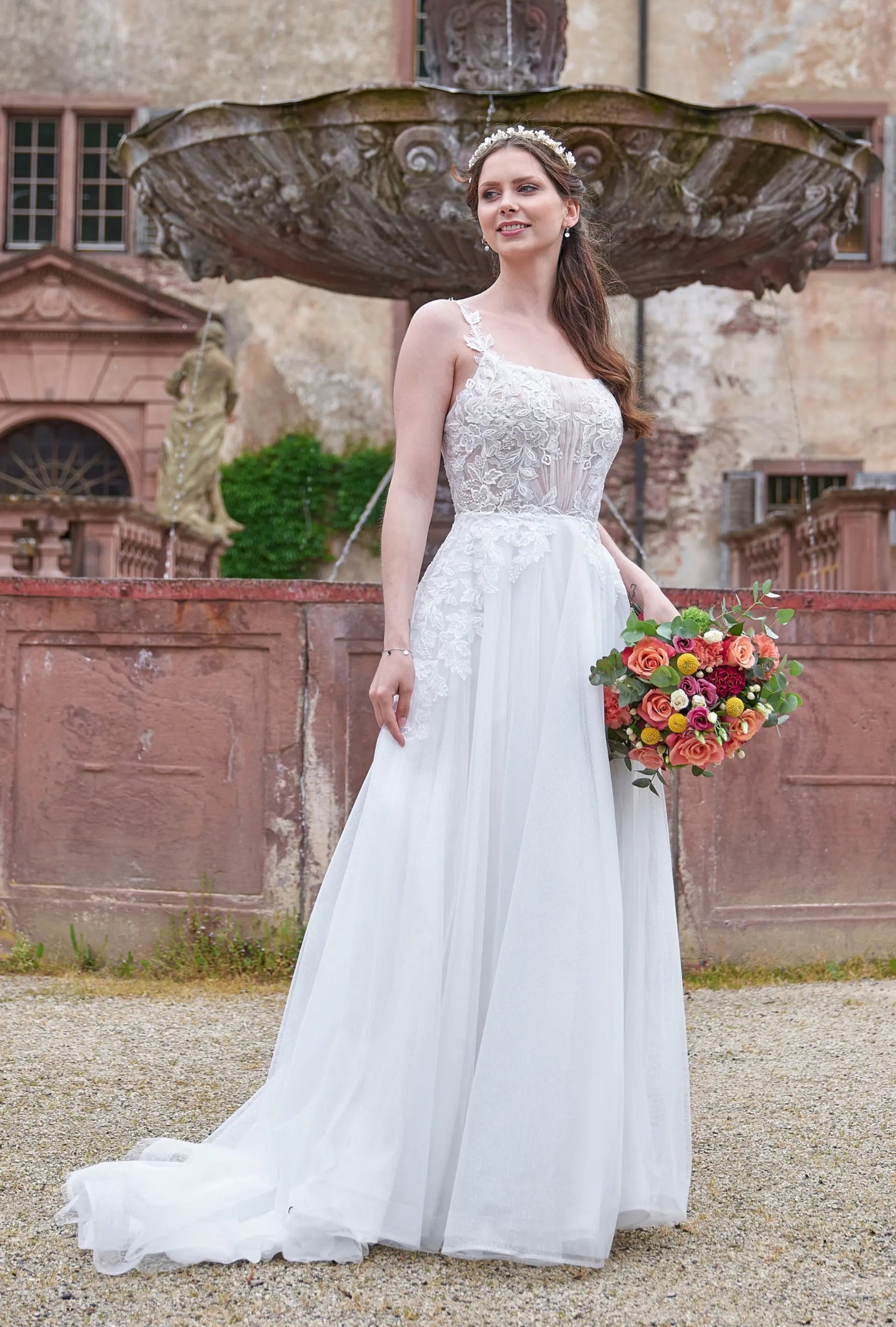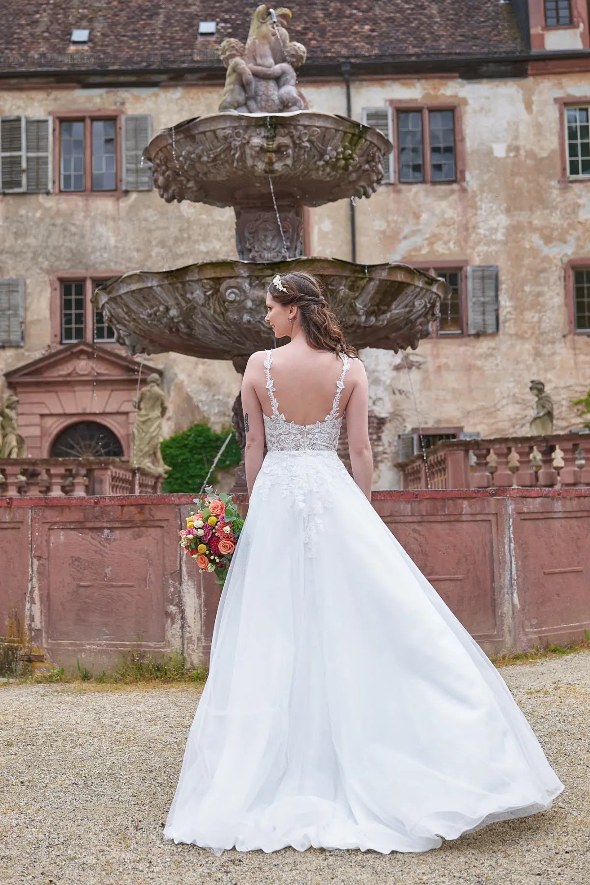 Der abgerundete Carrée-Ausschnitt wurde für dieses Design neu interpretiert und mit feinen Spaghetti-Trägern aus Blättern und Tüllrüschen am Ausschnitt versehen. Diese Komposition vermittelt Modernität und Weiblichkeit in einem Atemzug mit Elementen des Vintage Stils. Optisch geben sich Rüschen und Spitze die Hand und bedecken die weiblichen Kurven in einem ausgewogenen Wechselspiel aus Transparenz und Semitransparenz. Für den perfekten Sitz verfügt dieses Bridonista-Design außerdem über eine starke Corsage und Push-up-Cups, damit du dich an deinem großen Tag selbstbewusst und wunderschön fühlen kannst. Der hintere Ausschnitt ist in einem tiefen V gearbeitet und bricht alle anderen Designkonventionen auf charmante Weise. Wie in einem Garten ranken sich die Blumen und Blätter über die Corsage in die Taille und den Rock. Der schlichte Tüllrock tritt bewusst in den Hintergrund und überlässt der aufwändig gearbeiteten Corsage die Bühne.