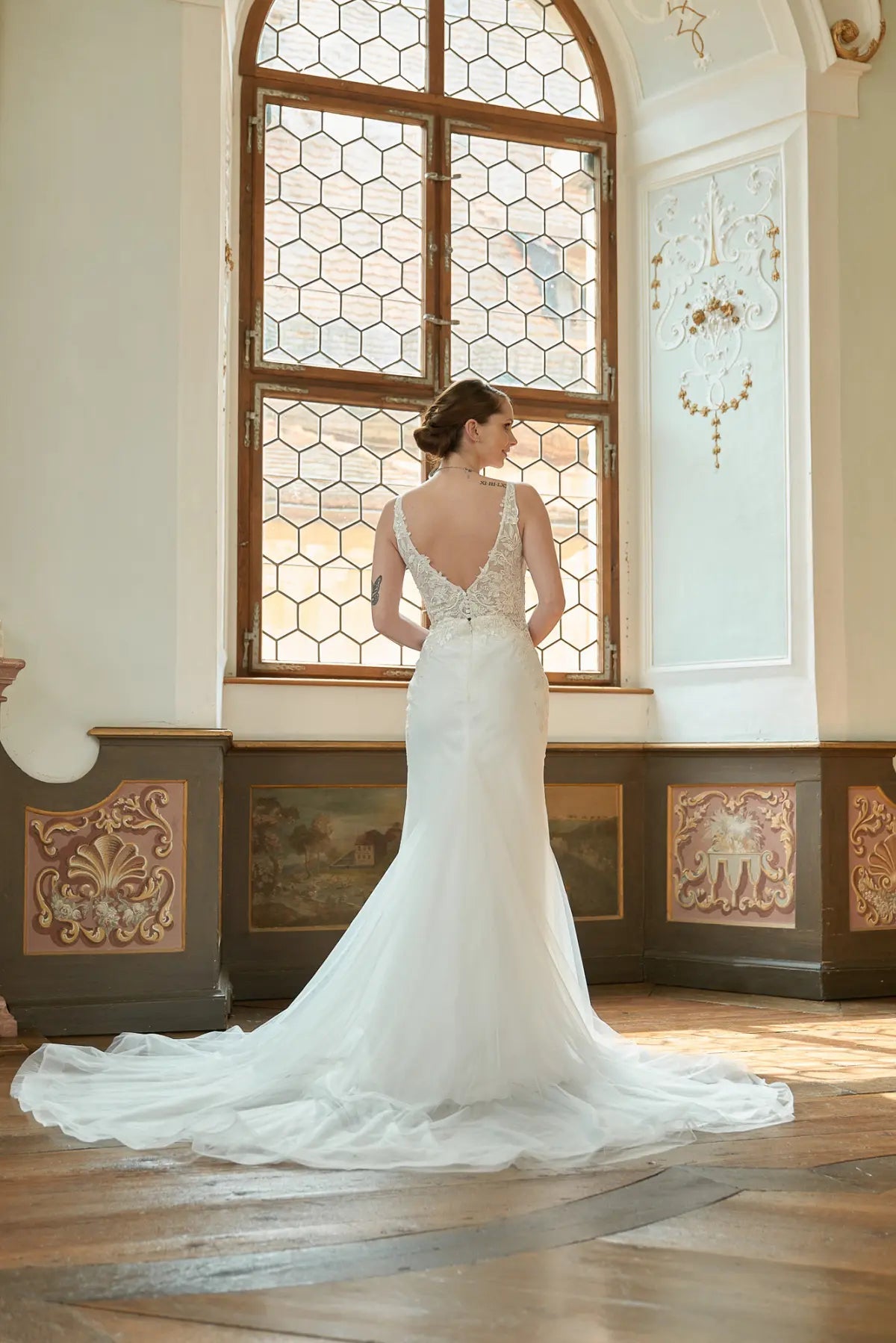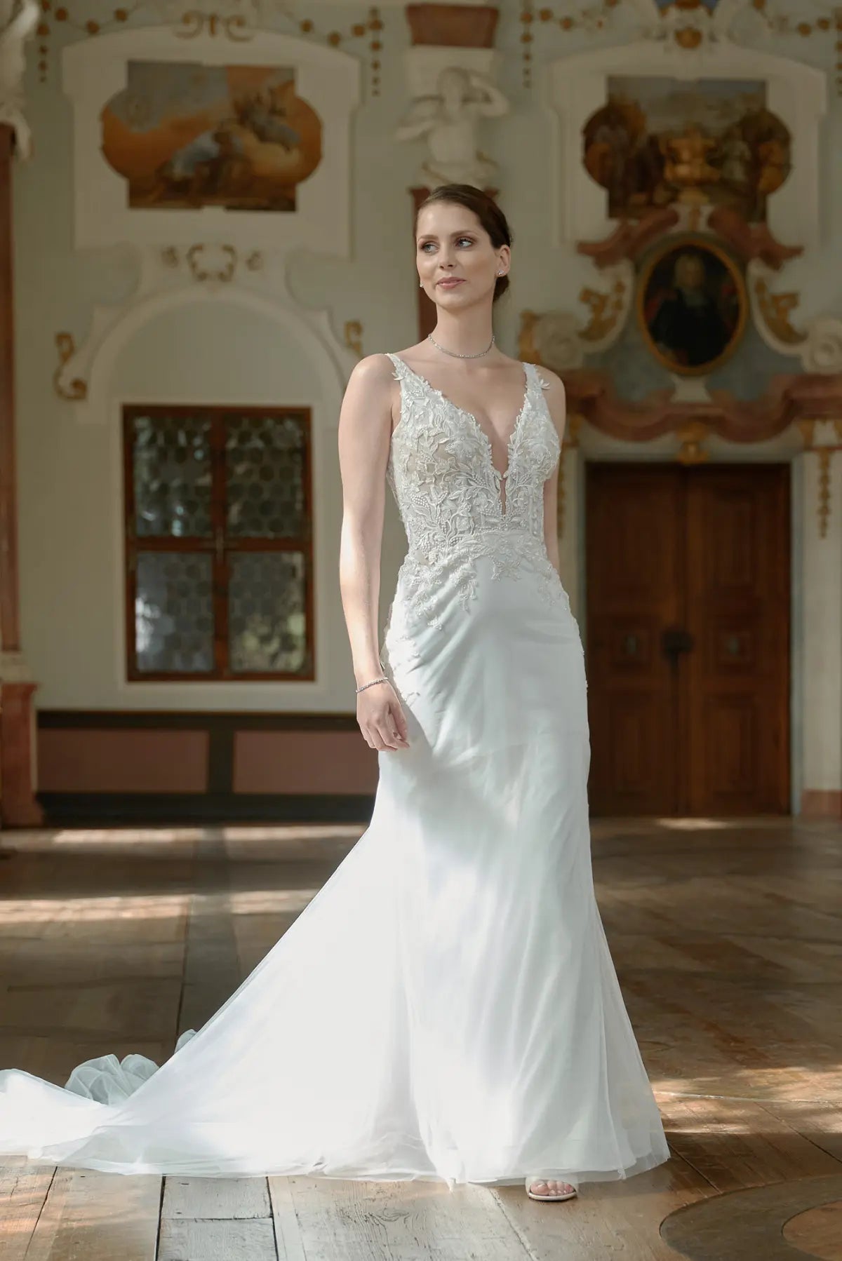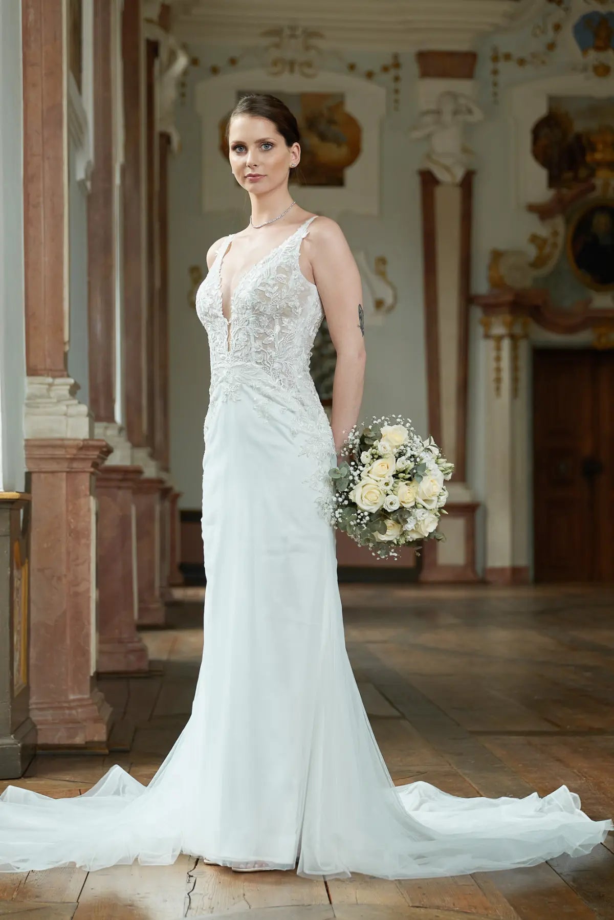 Der klassische V-Ausschnitt betont nicht nur das weibliche Dekolleté, sondern ist durch den verwendeten Illusionstüll auch für jede Brustform und -größe geeignet. Die feinen Spitzenornamente sind unbestickt und bilden ein organisches Muster, das über die Träger, den Ausschnitt, in die Taille und die Hüften verläuft. Blickfang sind die tiefen seitlichen Ausschnitte, die deiner Figur schmeicheln und diesem Vintage-Design einen Hauch von Lingerie-Look verleihen. Die Schichtung der verschiedenen Materialien sorgt für einen weichen, mehrfarbigen Effekt, der jedem Hauttyp schmeichelt und dafür sorgt, dass das Kleid im Licht schillert. Für den perfekten Sitz verfügt dieses Bridonista-Design außerdem über eine starke Corsage und Push-up-Cups, damit du dich an deinem großen Tag selbstbewusst und wunderschön fühlen kannst. Der figurbetonte Rock ist schlicht gehalten und wird durch eine Höckerkante abgerundet.