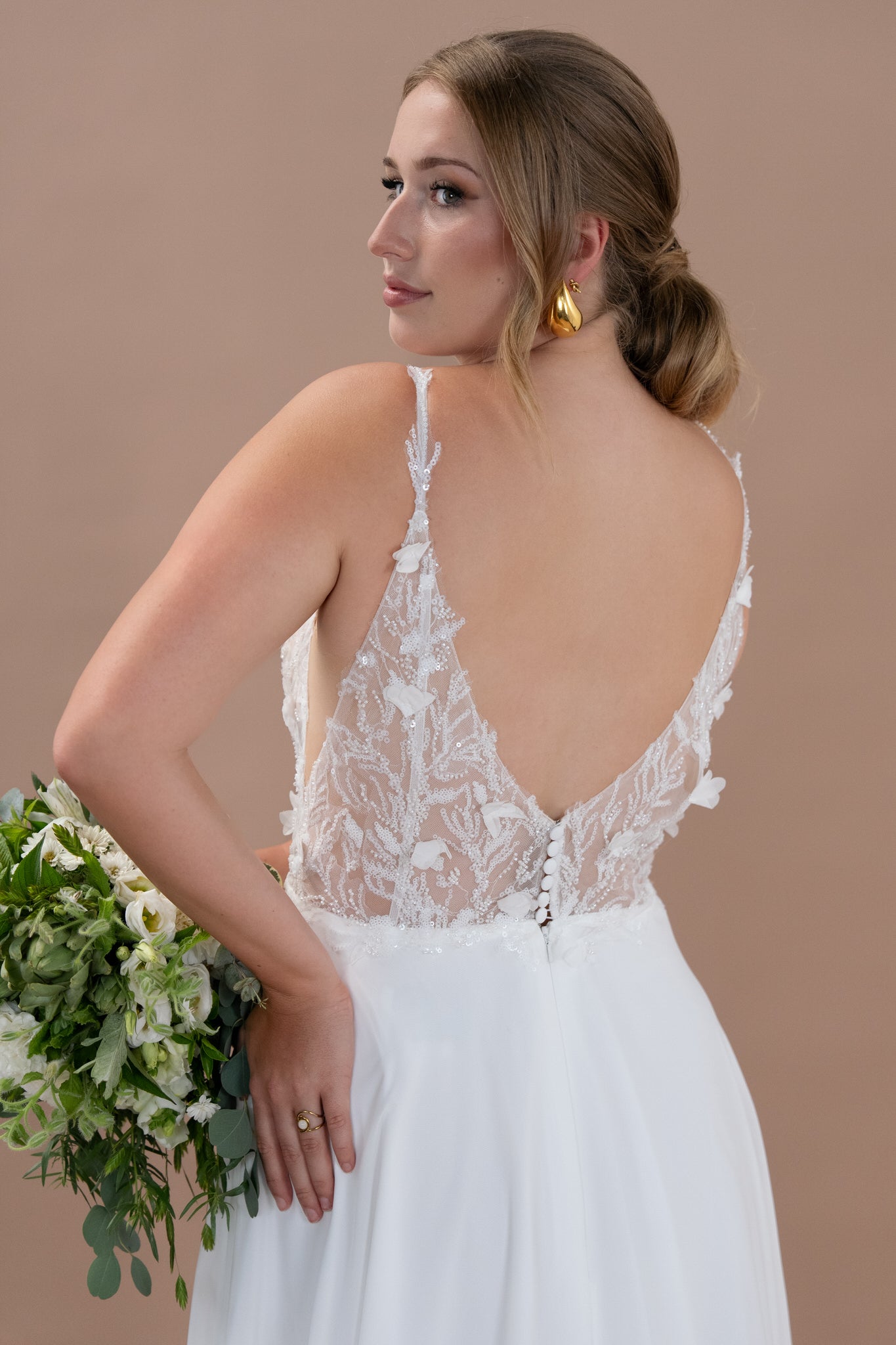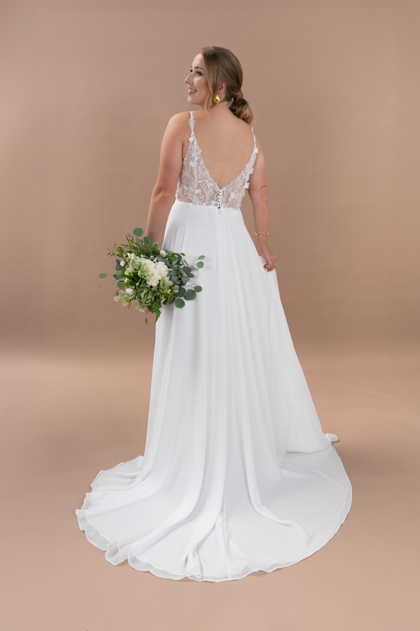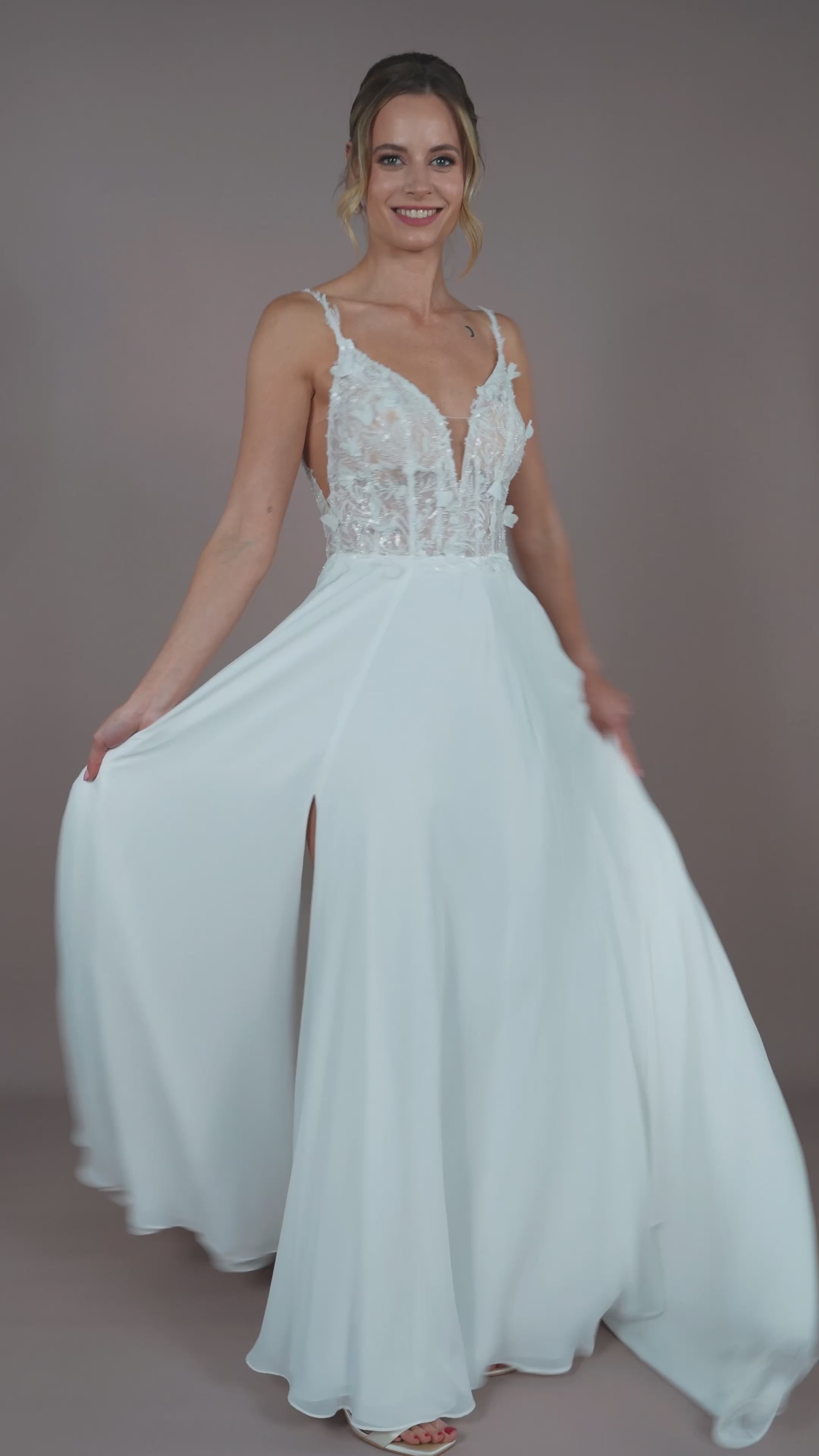 Der V-Ausschnitt und die wunderschönen Cutouts am Rücken sorgen für einen Hauch von Sinnlichkeit, ohne dabei die anmutige Ausstrahlung zu verlieren. Die feinen Spaghetti-Träger und der tief ausgeschnittene Rücken geben dem Kleid eine feminine Note, während der illusionäre Tüll und das luftige Chiffon die perfekte Kombination aus schwereloser Leichtigkeit und edlem Stil bieten.