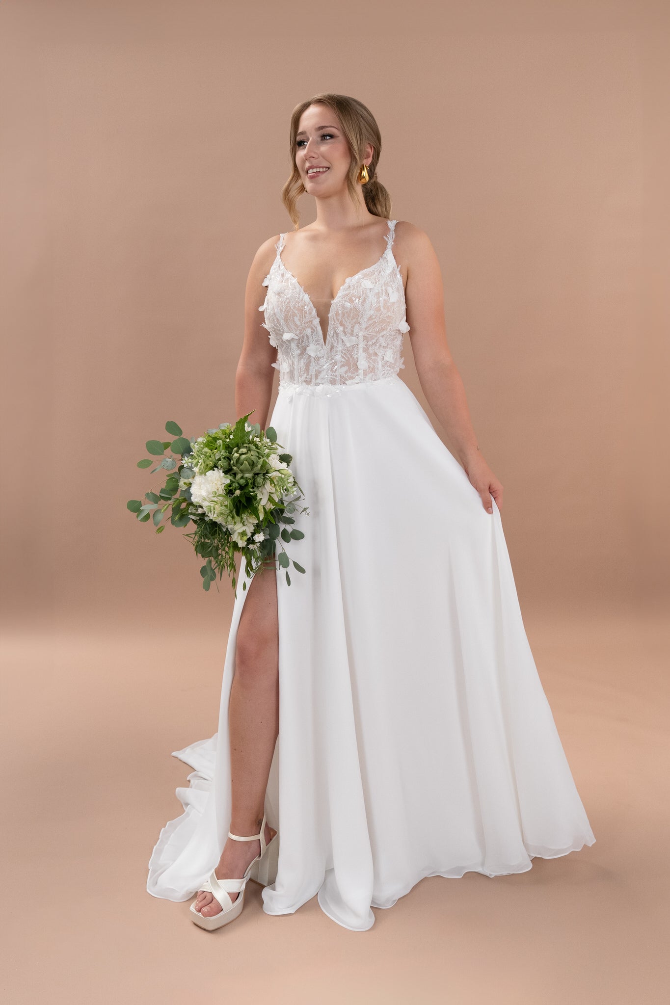 Mit seinen sanften Linien, dem zauberhaften Chantilly-Spitzenstoff und den filigranen Details ist das Bridonista V25-04 nicht nur ein Kleid, sondern ein einzigartiges Statement für deine Liebe. Ein Kleidungsstück, das nicht nur für einen Tag, sondern für all die Erinnerungen steht, die du mit deinem Partner teilen wirst.