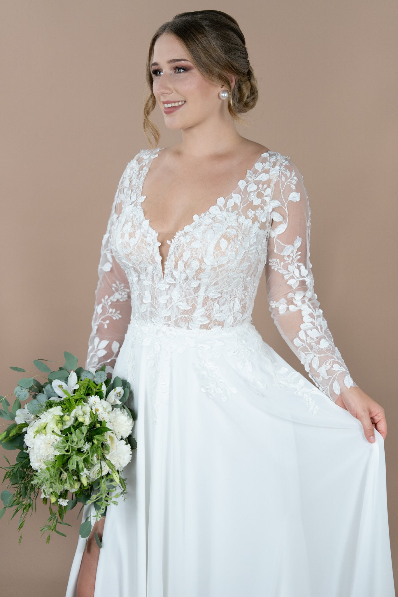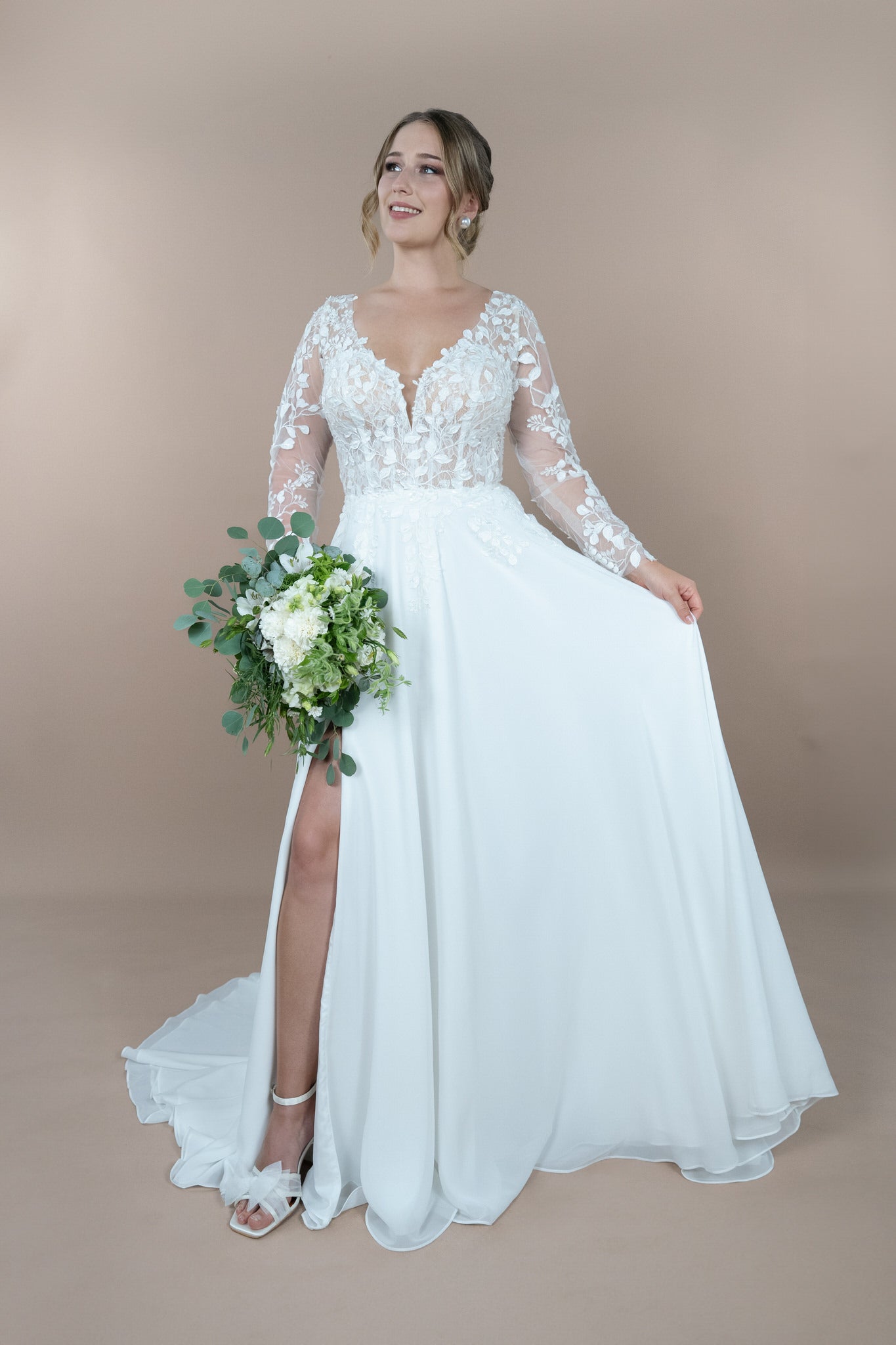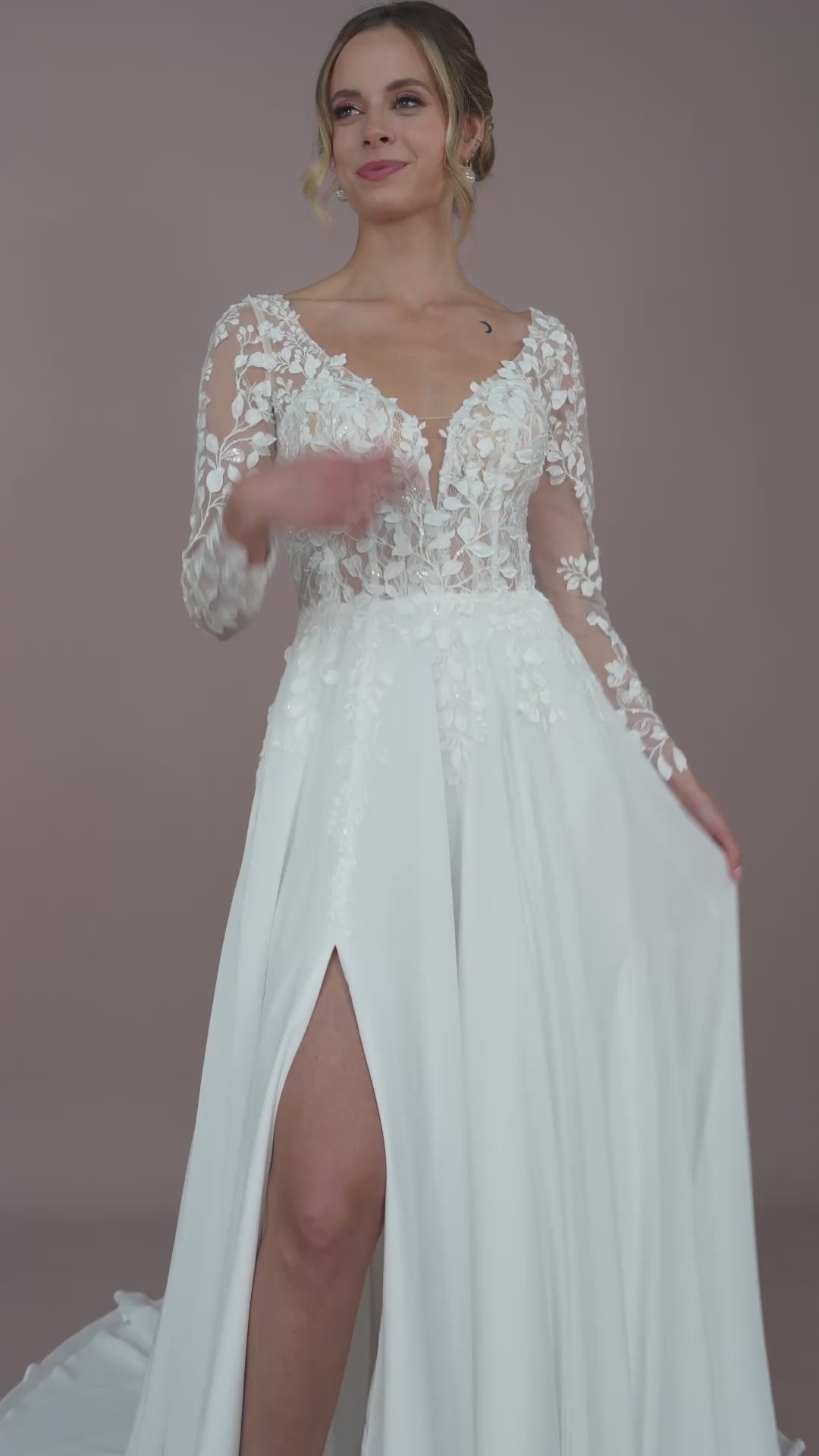 Das verspielte Design wird durch den raffinierten Schlitz ergänzt, der deinem Look eine Prise Extravaganz verleiht, ohne die zauberhafte, romantische Ausstrahlung zu beeinträchtigen. Die langen Ärmel bieten nicht nur Eleganz, sondern können bei Bedarf ganz einfach abgenommen werden, um deinen Look zu verändern und sich den Gegebenheiten deiner Hochzeitsfeier anzupassen – eine fantastische Funktion für wechselnde Temperaturen oder verschiedene Veranstaltungsorte.