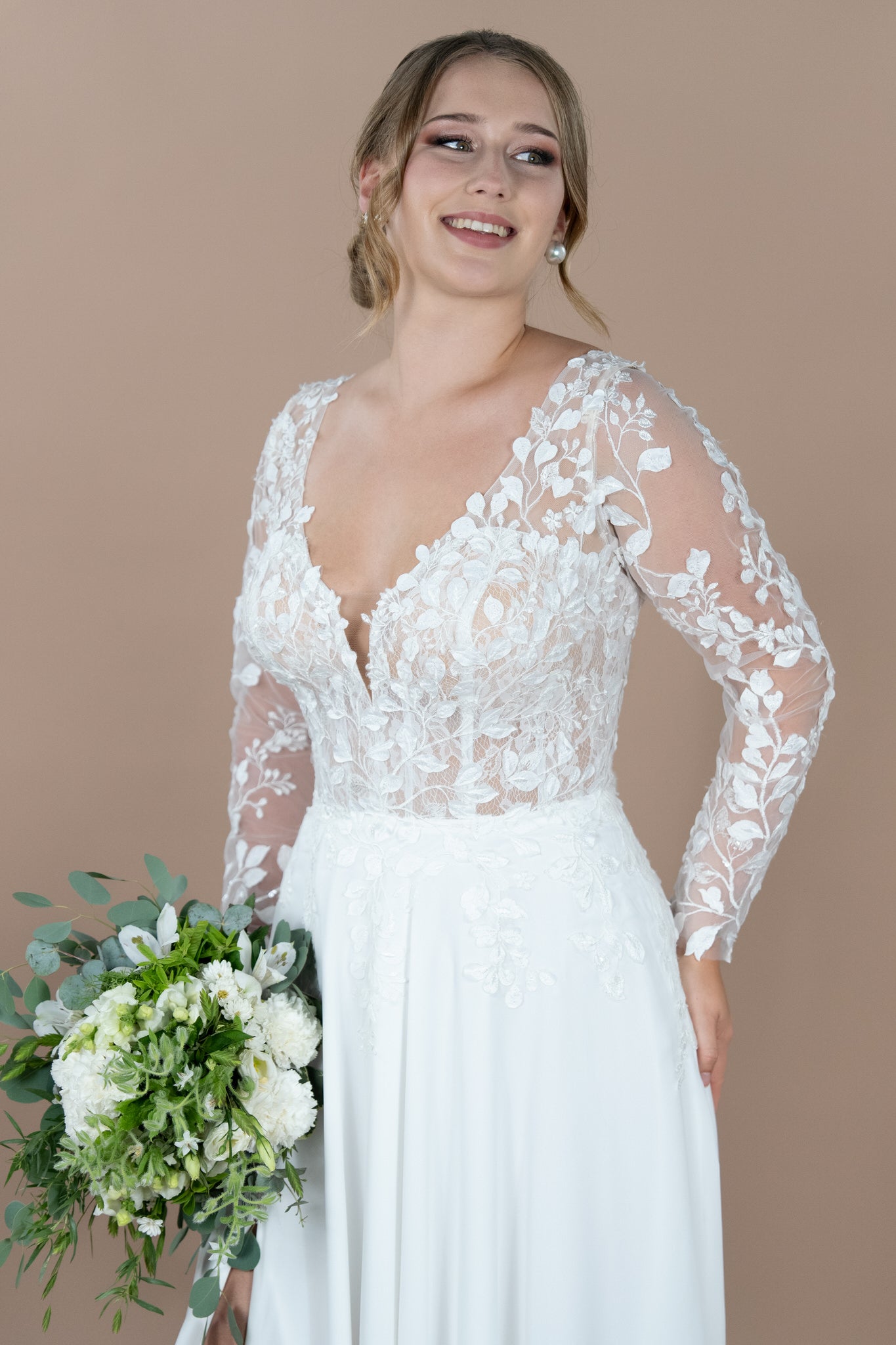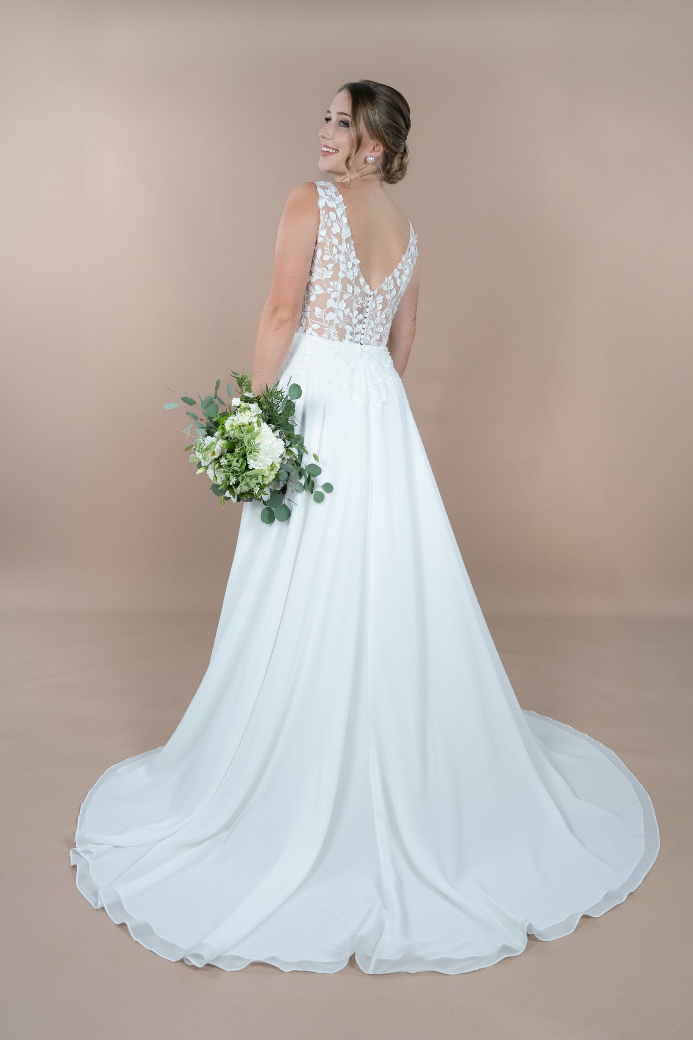 Hergestellt aus edlem Chiffon und zarter Chantilly-Spitze, schenkt dir das Brautkleid ein traumhaftes Tragegefühl. Die feine Blätterspitze setzt florale Akzente und verleiht dem Kleid eine romantische Note, die wunderbar zu den natürlichen Kulissen einer Gartenhochzeit oder dem maritimen Flair am Strand passt. Der Illusion-Tüll sorgt für einen illusionären Effekt, der deine Haut sanft umschmeichelt und dabei dennoch einen Hauch von Geheimnis um dich herum erzeugt.