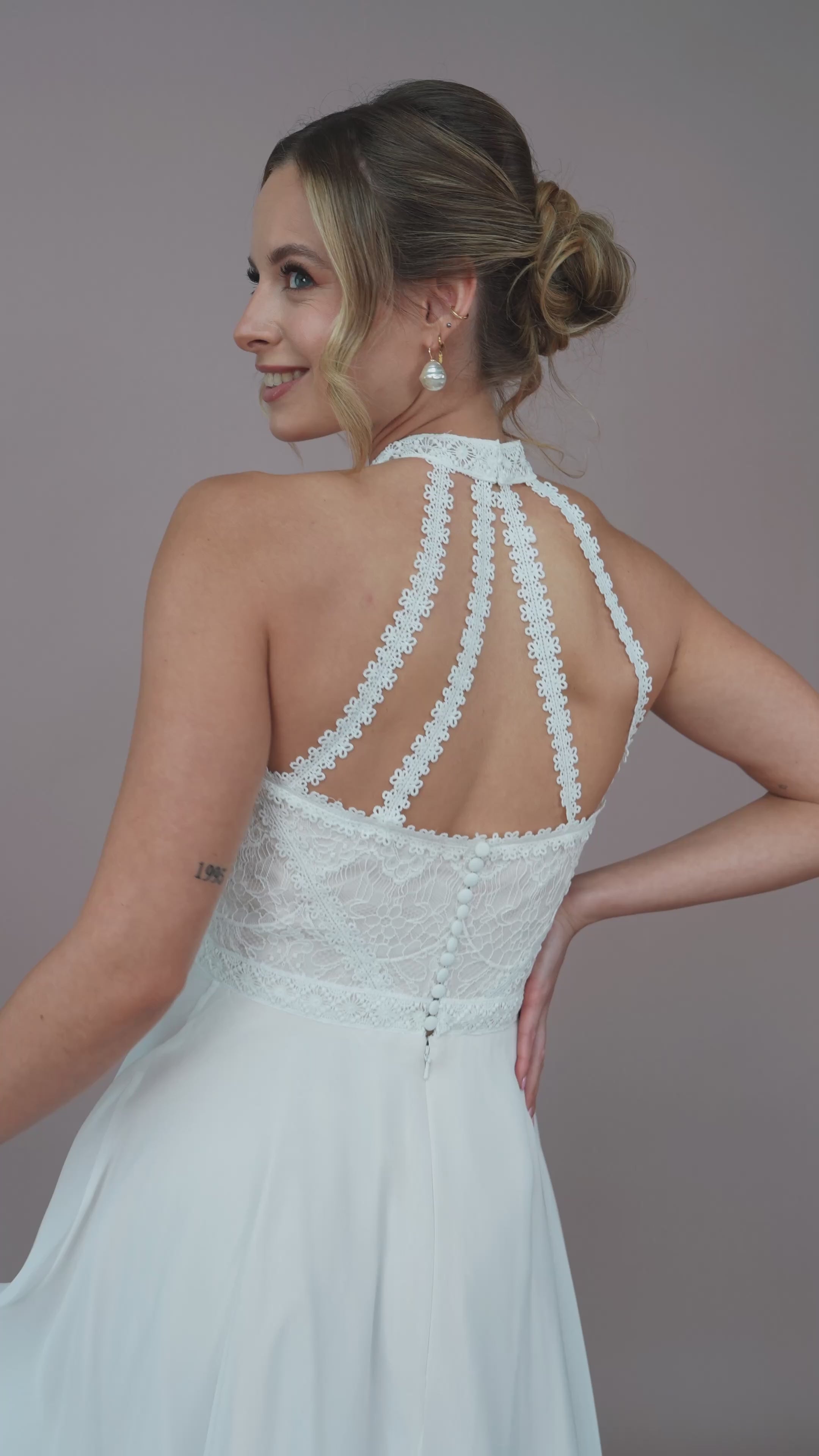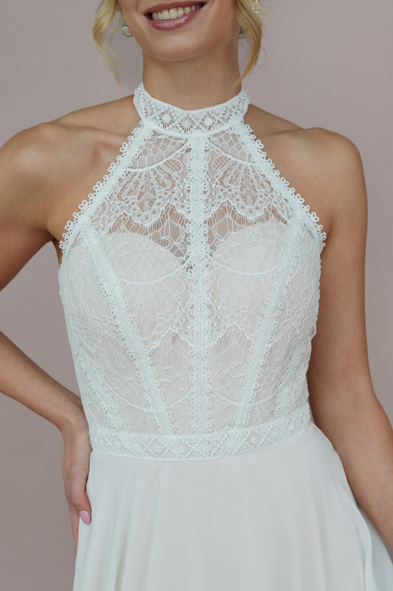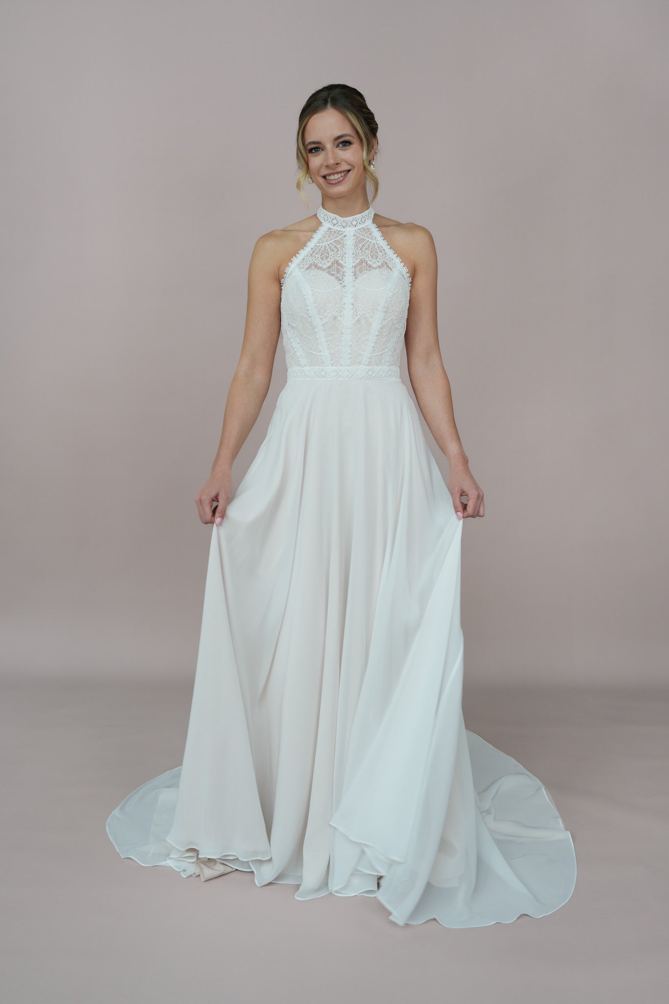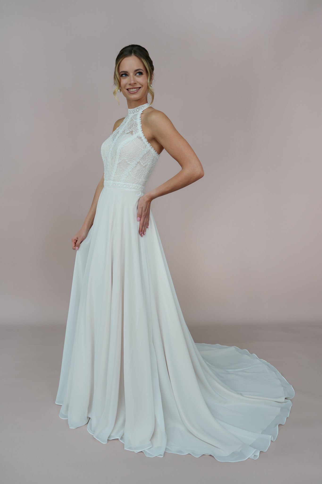 Ein besonderes Highlight sind die feinen Details aus zarter Spitze und edler Chantilly, die das Kleid mit romantischen, floralen Akzenten schmücken. Diese filigranen Elemente verleihen dem Kleid eine besondere Note, die an blühende Gärten und frische Sommerwiesen erinnert und die Weiblichkeit jeder Braut unterstreicht. Der Stoff aus leichtem Chiffon sorgt für einen sanften Fall und eine wunderschöne Bewegung, die bei jeder Gelegenheit zur Geltung kommt.