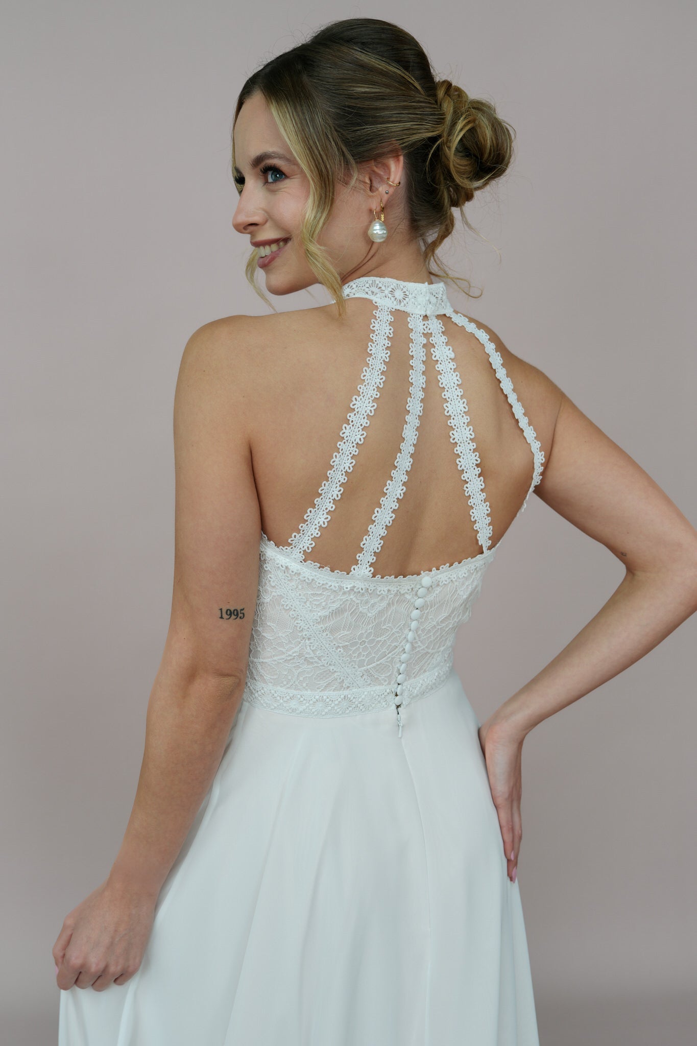 Die zarte Blush-Farbe des Kleides fügt sich perfekt in das gesamte Design ein und verleiht dem Kleid eine verspielte Leichtigkeit. Diese sanfte Farbnuance ist ideal für Bräute, die nach einem romantischen und zugleich modernen Look suchen, der sich gut für eine Vielzahl von Hochzeitslocations eignet, vom standesamtlichen Trauzimmer bis zur traumhaften Naturkulisse.