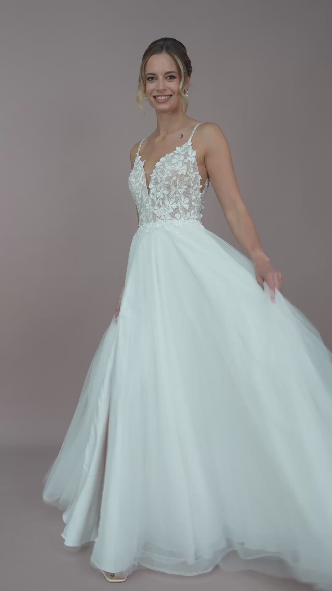 Die zarten Spaghetti-Träger sorgen nicht nur für optimalen Tragekomfort, sondern fügen sich auch harmonisch in das Gesamtbild des Kleides ein. Der feine Illusion-Tüll sorgt für einen Hauch von Magie, während die filigranen Cutouts, die geschickt platziert sind, dem Kleid eine aufregende Note verleihen und für einen einzigartigen Look sorgen.