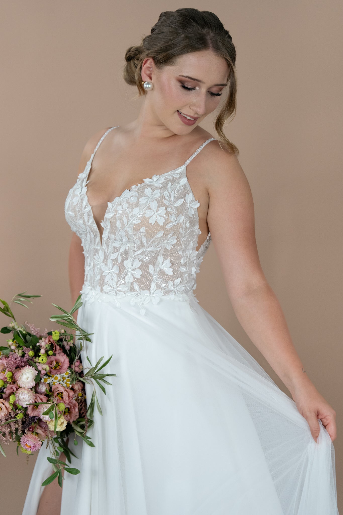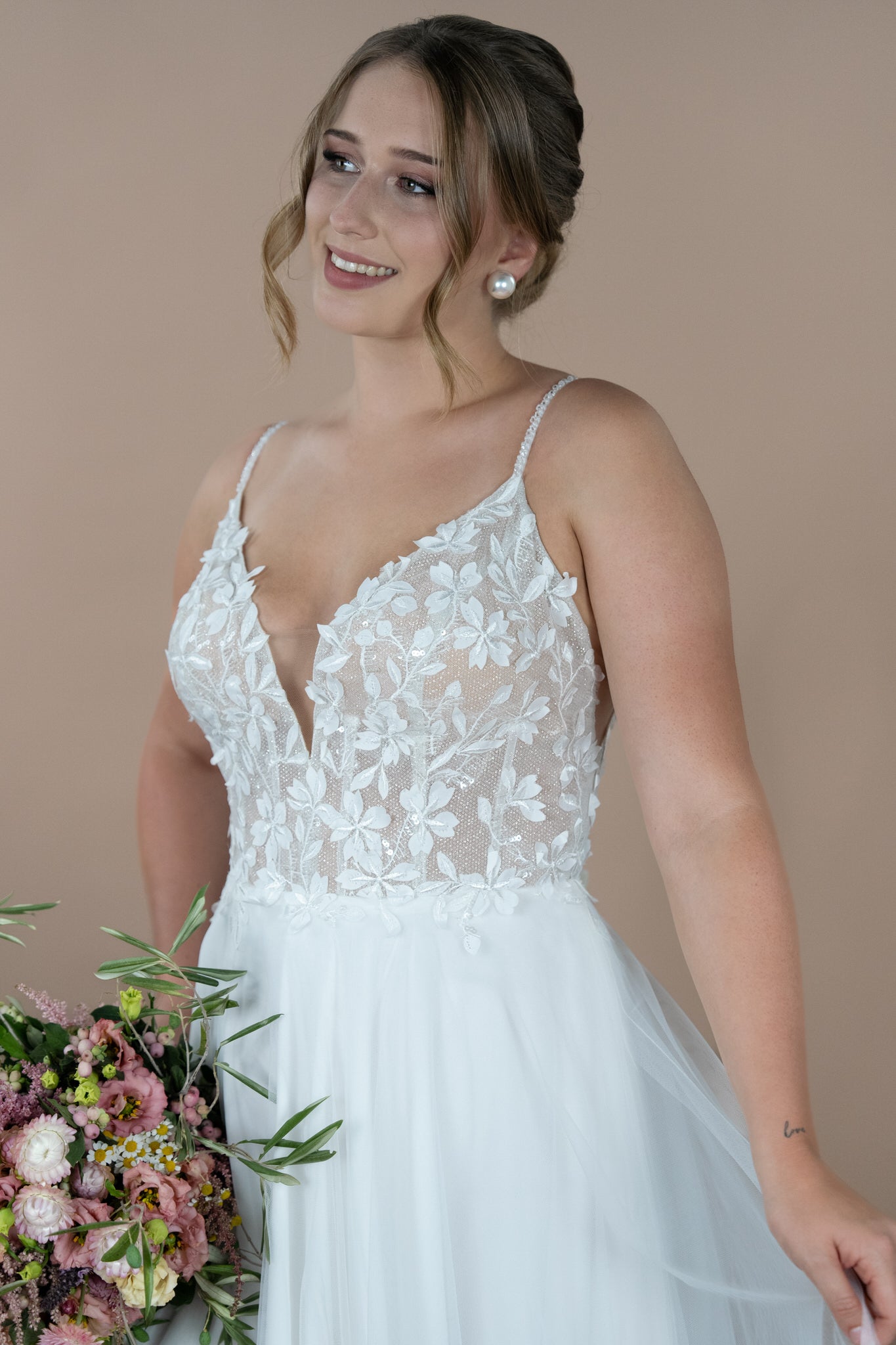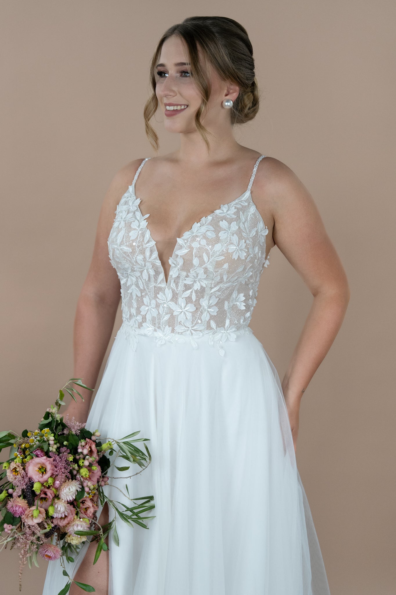 Die Möglichkeit, den Rock mit oder ohne Glitzer-Tüll zu wählen, bietet dir zudem die Flexibilität, deinen persönlichen Stil zu unterstreichen. Der hohe Schlitz verleiht zusätzlich eine verführerische Note und sorgt dafür, dass du dich an deinem besonderen Tag frei und selbstbewusst fühlen kannst.