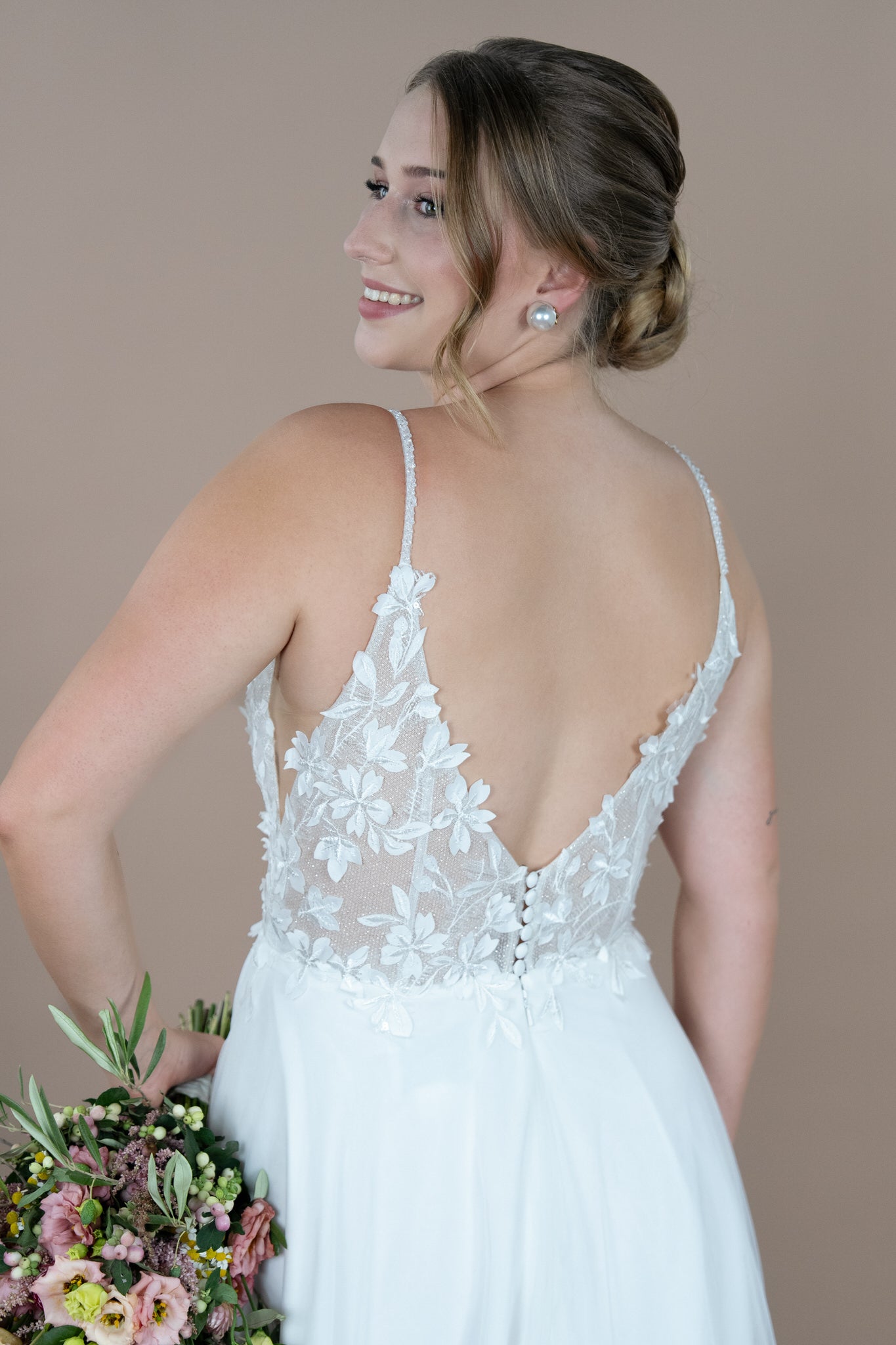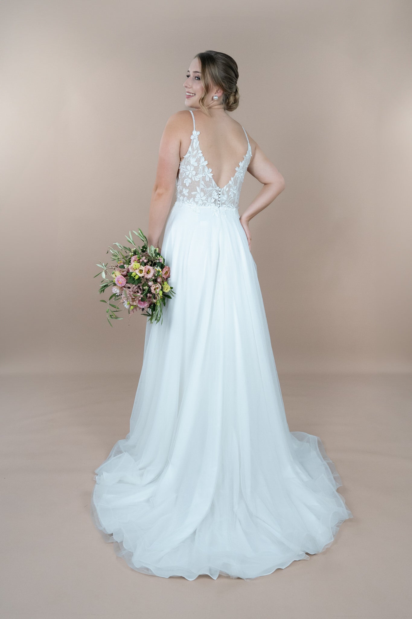 Die schmeichelhafte A-Linie umspielt die Figur der Braut auf eine traumhafte Weise und sorgt für eine anmutige Silhouette, die alle Blicke auf sich zieht. Der V-Ausschnitt betont dezent dein Dekolleté und verleiht deinem Look eine feminine Note, während der V-Rücken für einen eleganten Rückenausschnitt sorgt, der das Kleid von hinten ebenso beeindruckend erscheinen lässt.