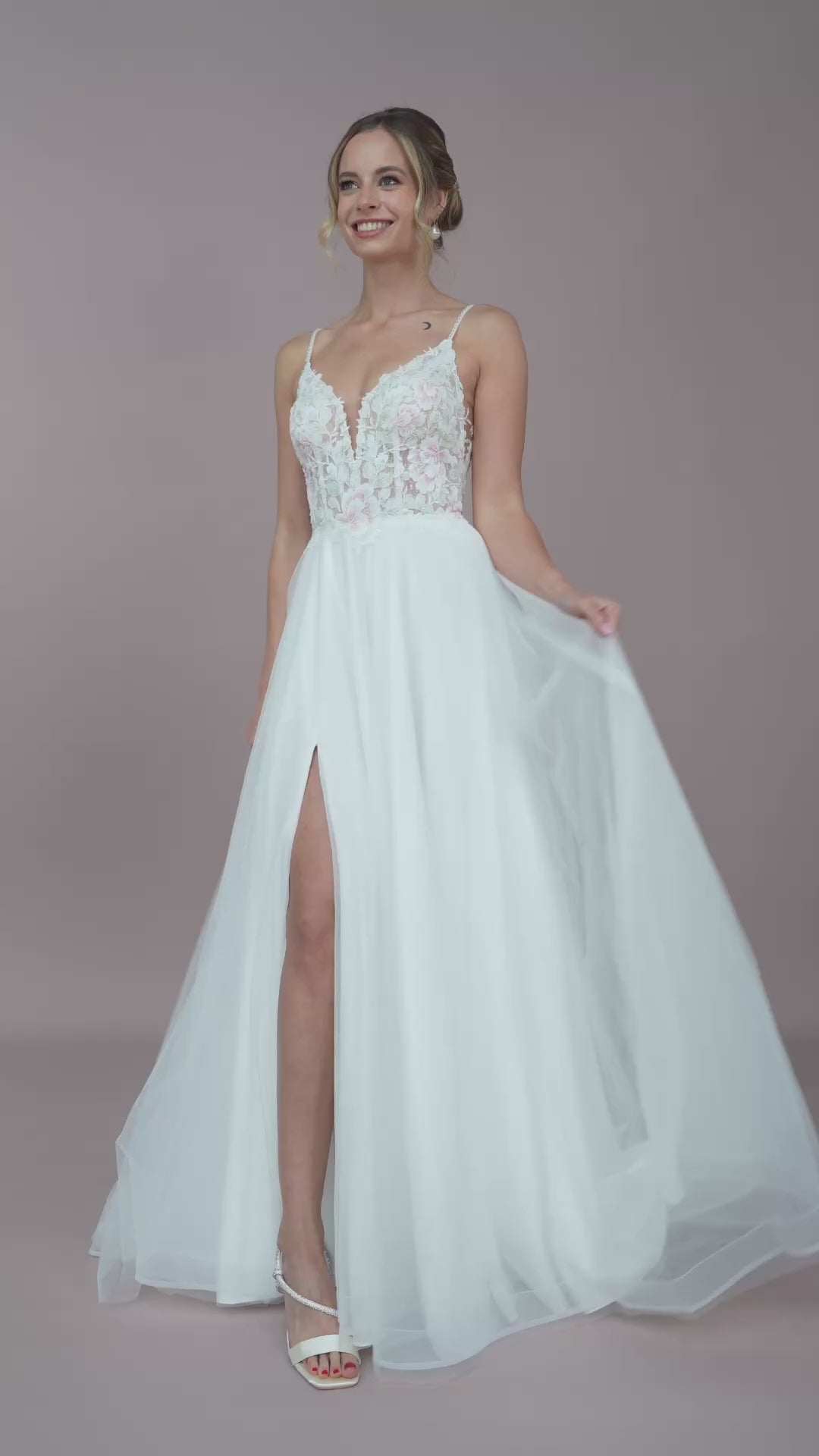 Die A-Linien-Silhouette dieses Kleides schmeichelt jeder Figur und bietet einen weichen, fließenden Fall, der das Gesamtbild harmonisch abgerundet. Der tiefe V-Ausschnitt ist ein markantes Designelement, das das Dekolleté schön zur Geltung bringt und eine elegante, feminine Ausstrahlung vermittelt. Er verleiht dem Kleid einen Hauch von Verführung und Modernität, die jede Braut begeistern wird.