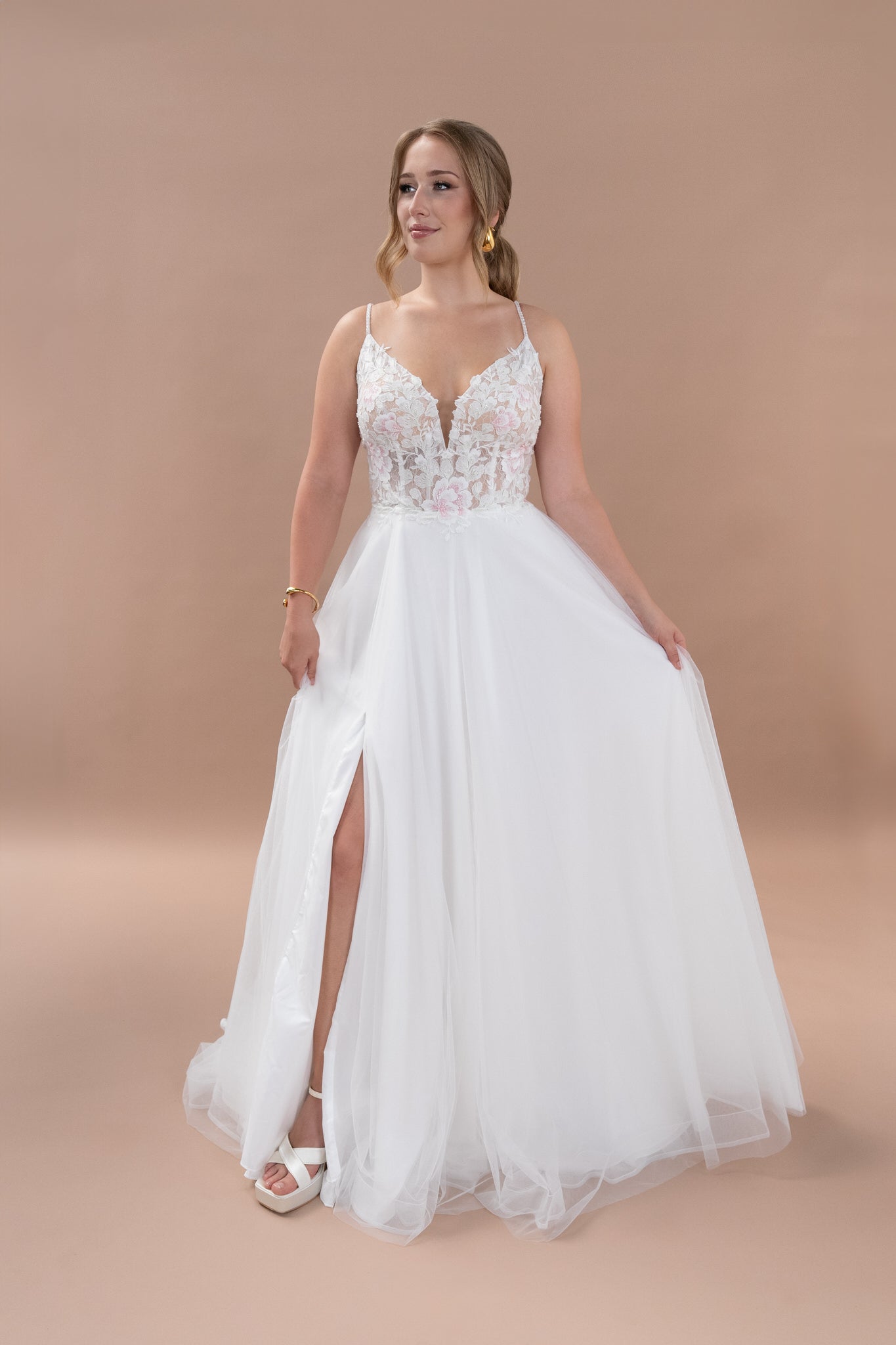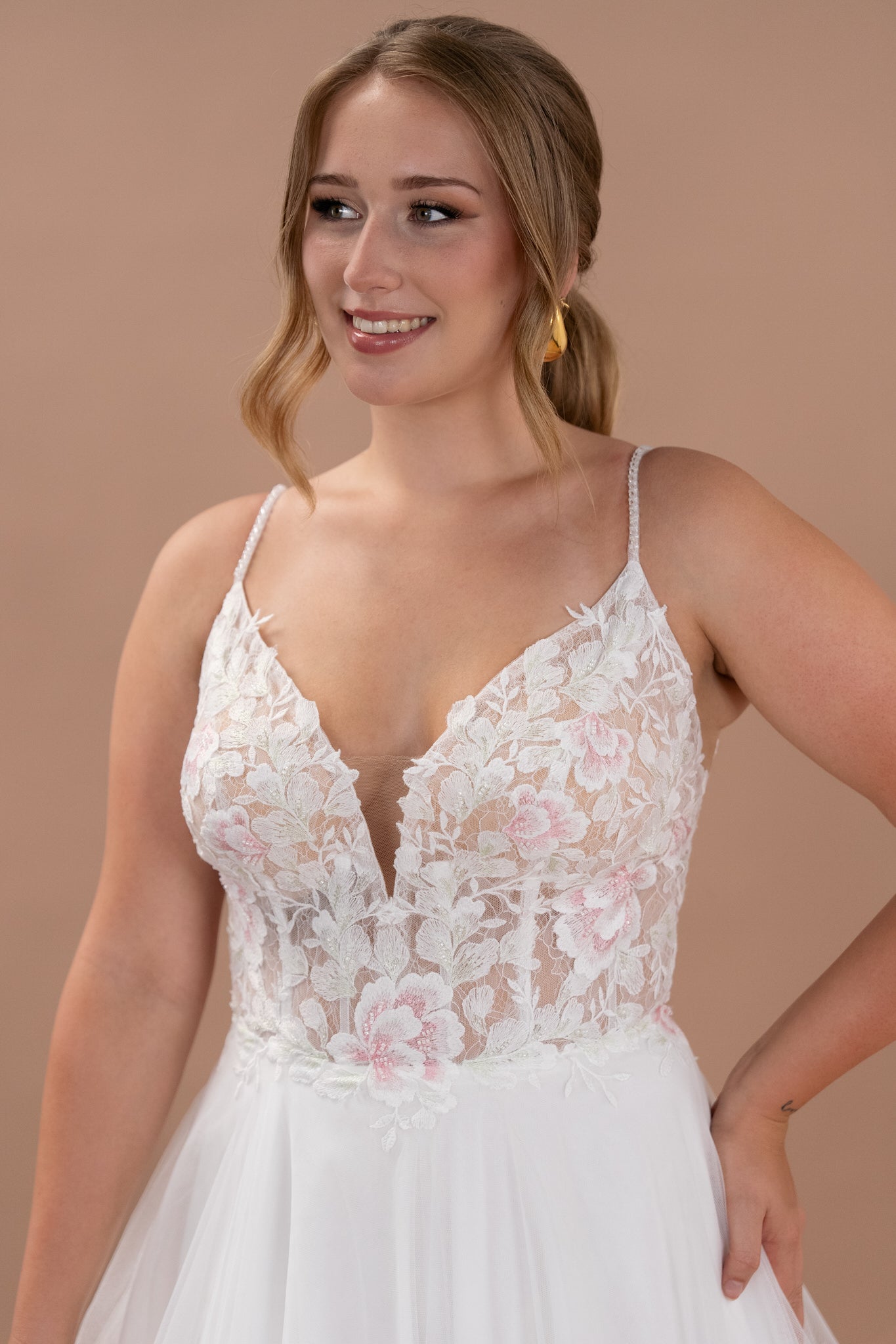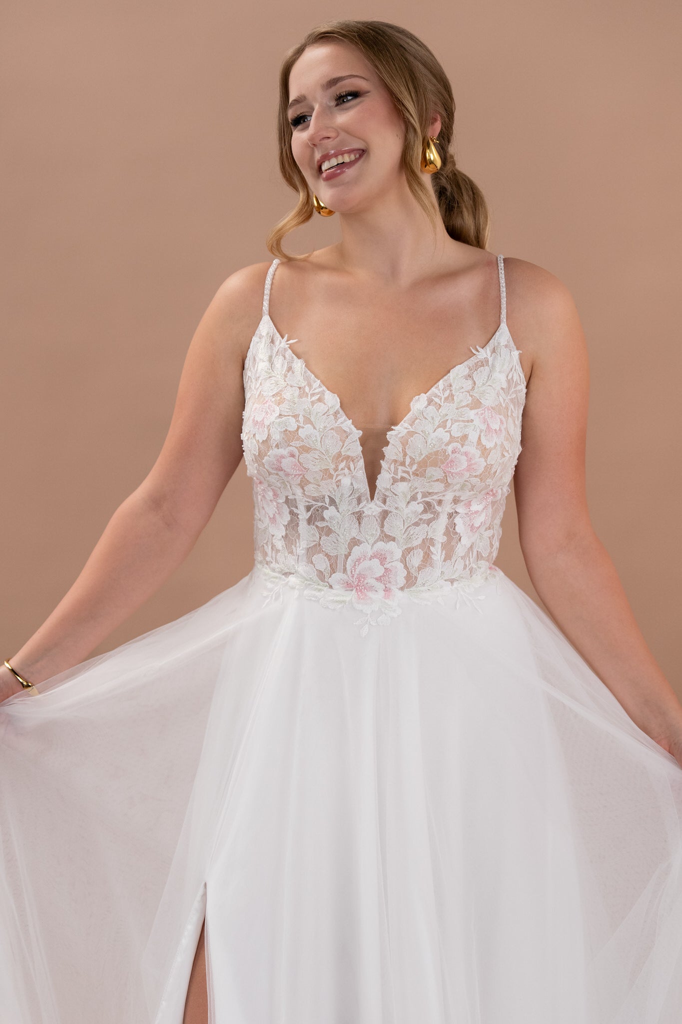 Die florale Spitze im Oberteil fügt eine romantische und feminine Ausstrahlung hinzu. Diese filigranen Details verleihen dem Kleid eine brillante Textur und tragen dazu bei, dass du dich an deinem besonderen Tag einzigartig fühlst.