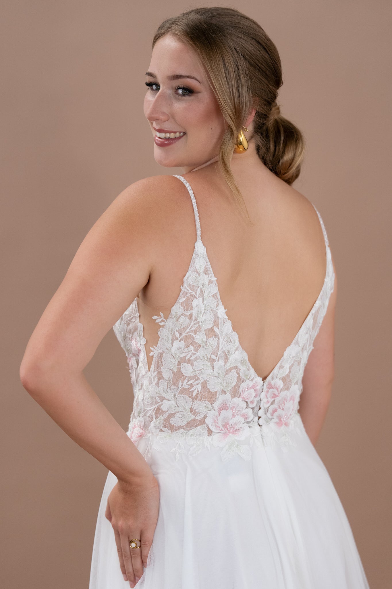 Ein weiteres Highlight ist der tiefe V-Ausschnitt am Rücken, der eine anspruchsvolle Sicht von hinten bietet und gleichzeitig das sanfte, luftige Design des Kleides betont. Diese Kombination aus vorderem und rückseitigem V-Ausschnitt kreiert eine ansprechende Silhouette und sorgt dafür, dass die Braut in jeder Sichtweise glänzt.