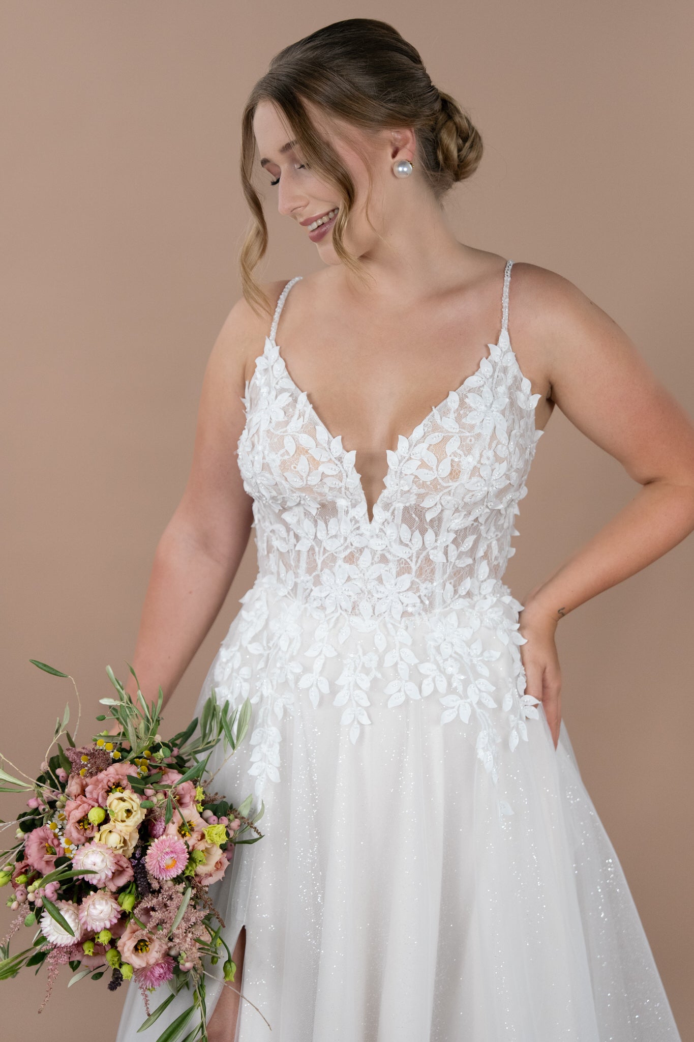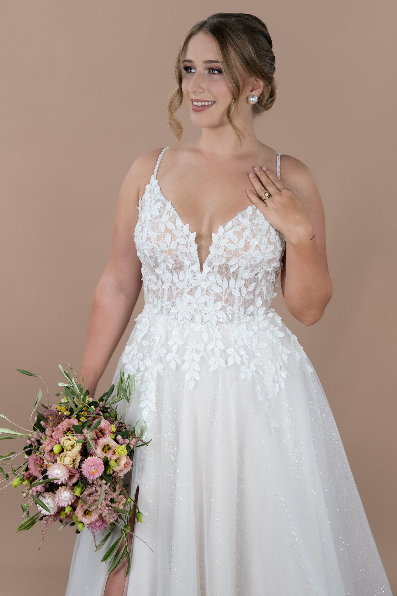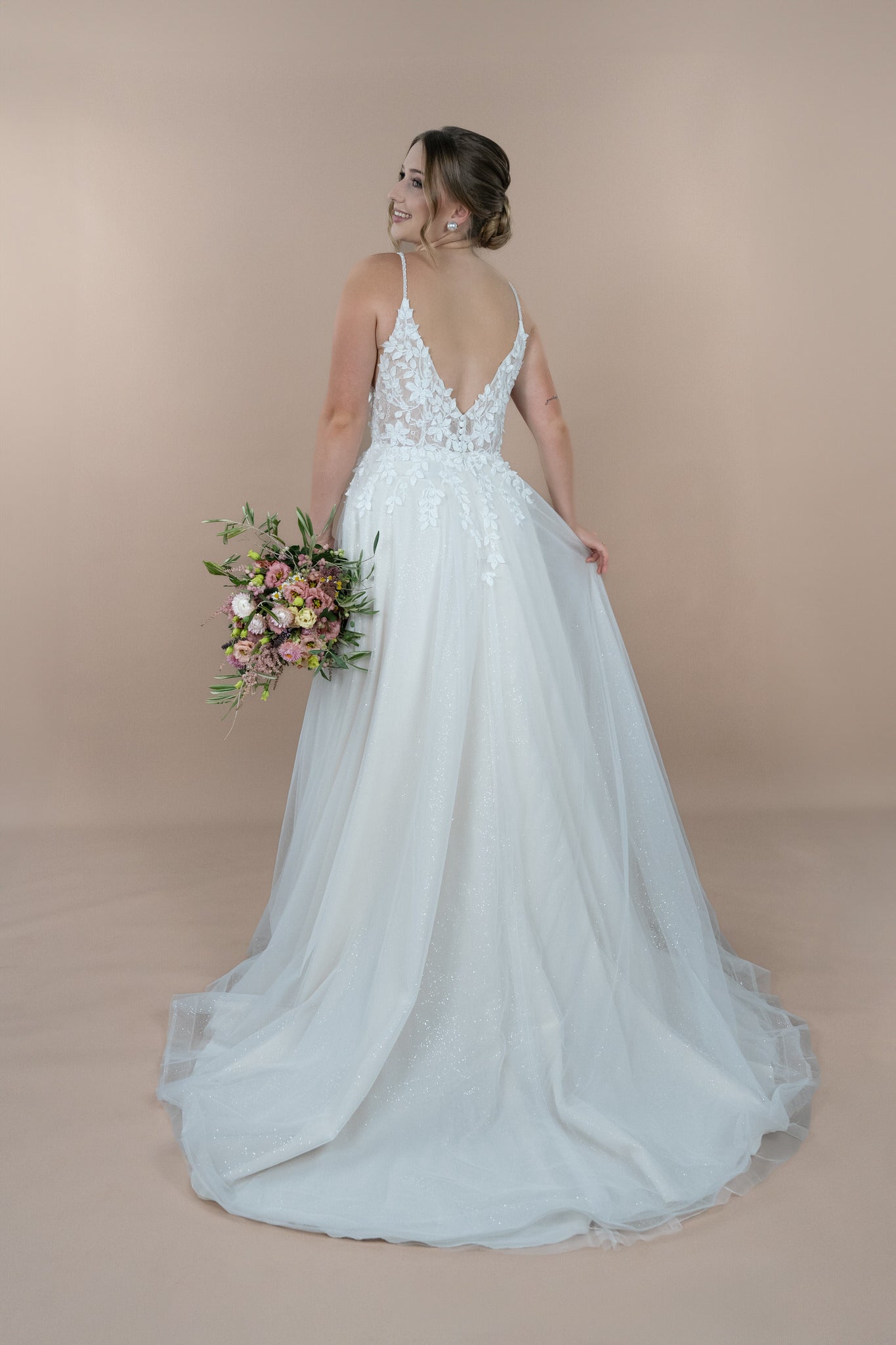 Hergestellt aus zarter Chantilly-Spitze und verziert mit süßen Blätterstickereien, trägt das Brautkleid eine romantische und florale Note in sich. Die kunstvolle Bestickung und funkelnden Glitzerakzente, kombiniert mit Pailletten, lassen das Kleid bei jedem Schritt strahlen und sorgen dafür, dass du im Rampenlicht stehst. Der edle Illusion-Tüll sorgt für einen Hauch von Magie, indem er die Transition zwischen Haut und Stoff perfekt in Szene setzt – ideal für all jene, die das Besondere lieben. Außerdem kannst du dieses Kleid wahlweise mit oder ohne Glitzer-Tüll im Rock wählen, um deinen persönlichen Stil optimal zu unterstreichen.