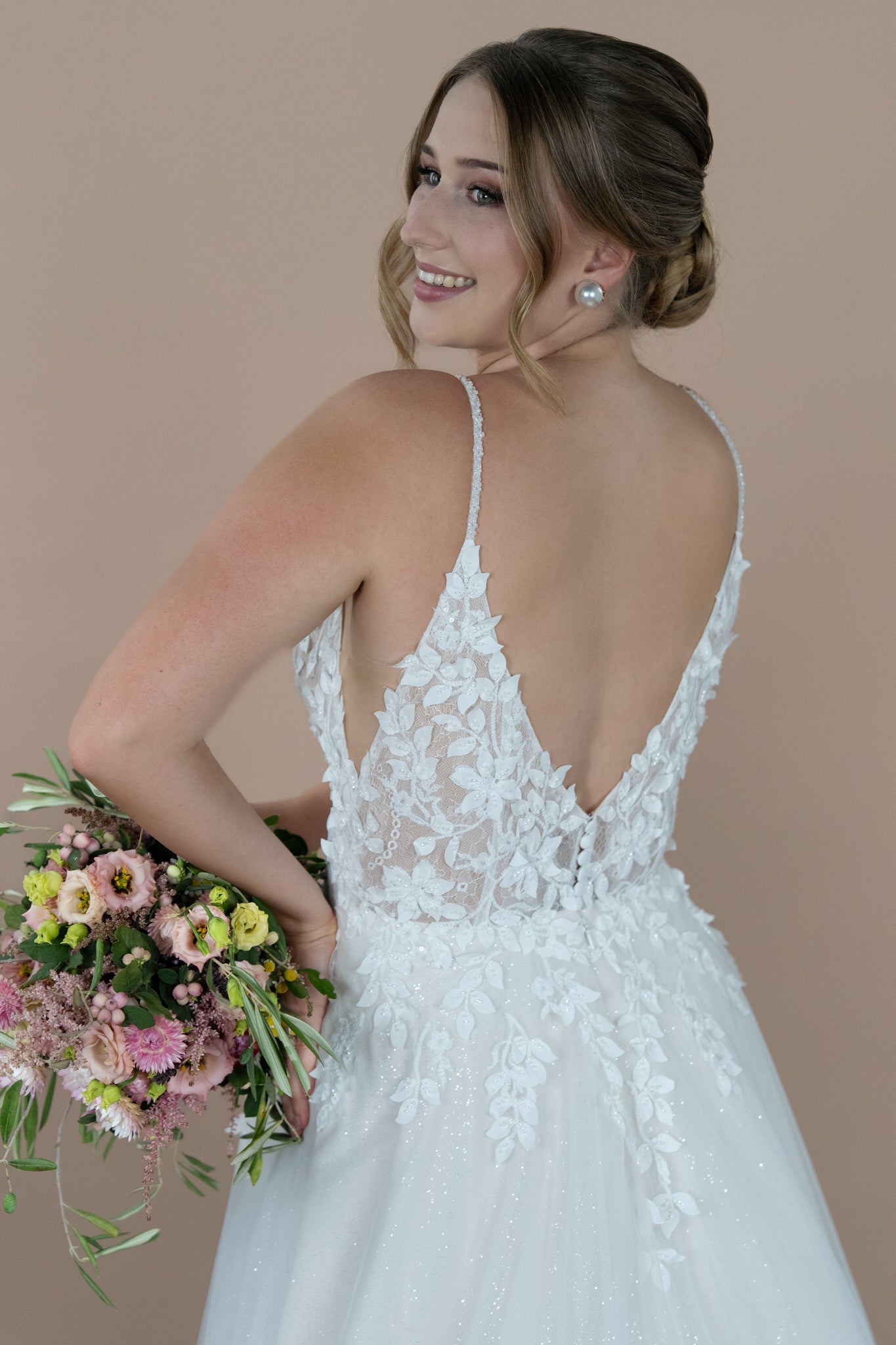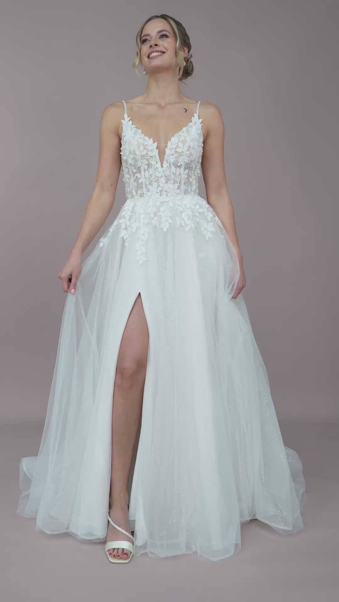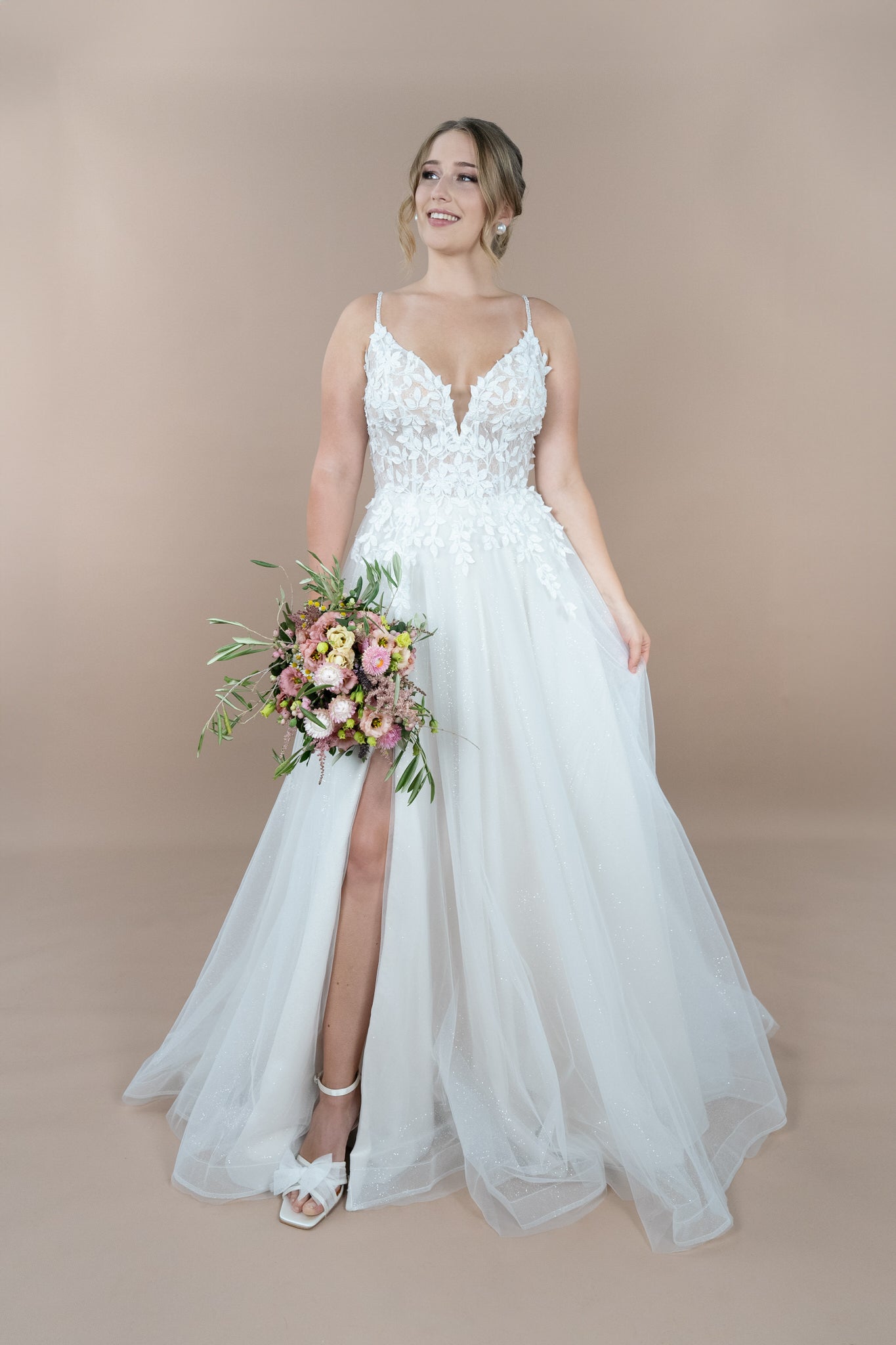 Hergestellt aus zarter Chantilly-Spitze und verziert mit süßen Blätterstickereien, trägt das Brautkleid eine romantische und florale Note in sich. Die kunstvolle Bestickung und funkelnden Glitzerakzente, kombiniert mit Pailletten, lassen das Kleid bei jedem Schritt strahlen und sorgen dafür, dass du im Rampenlicht stehst. Der edle Illusion-Tüll sorgt für einen Hauch von Magie, indem er die Transition zwischen Haut und Stoff perfekt in Szene setzt – ideal für all jene, die das Besondere lieben. Außerdem kannst du dieses Kleid wahlweise mit oder ohne Glitzer-Tüll im Rock wählen, um deinen persönlichen Stil optimal zu unterstreichen.