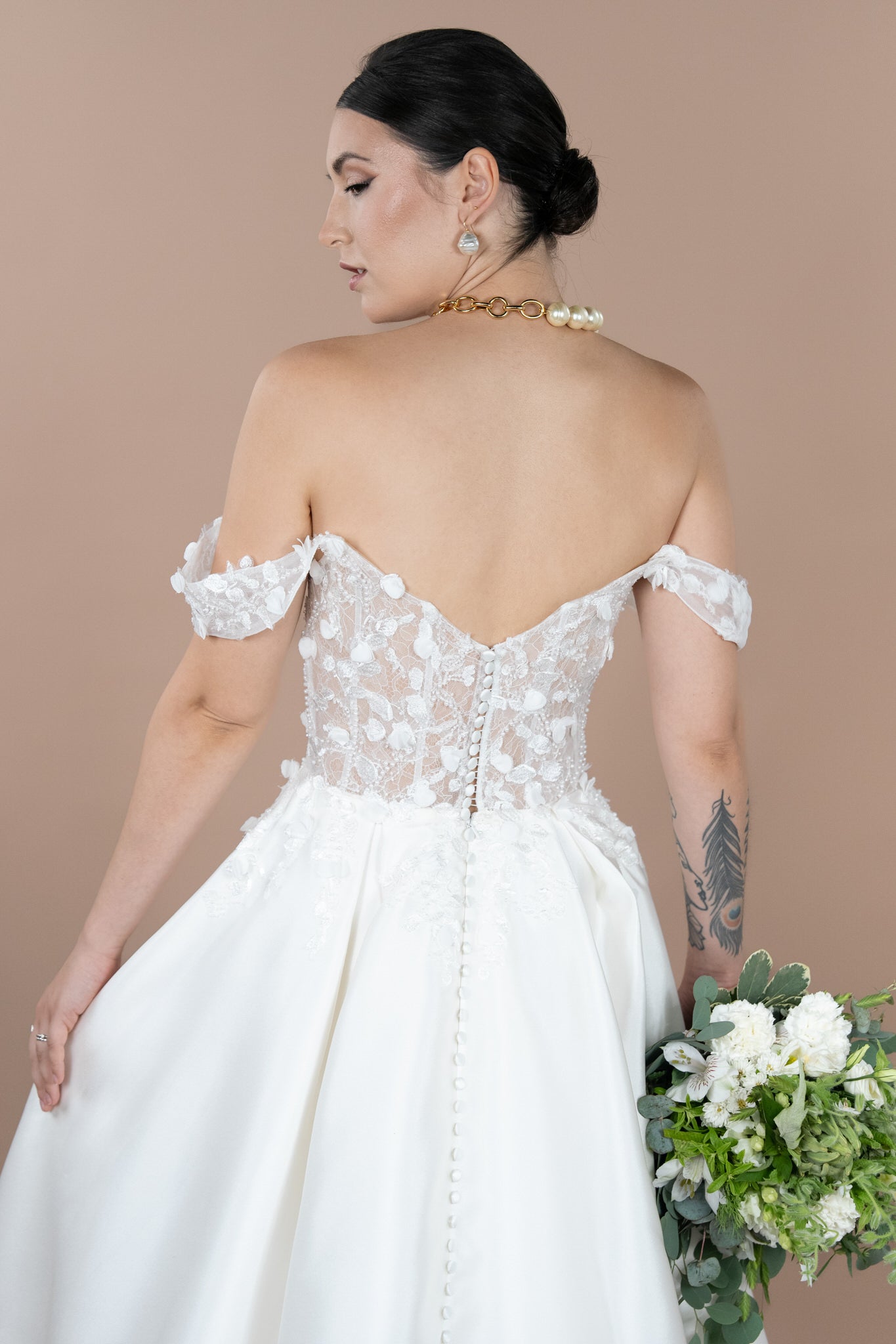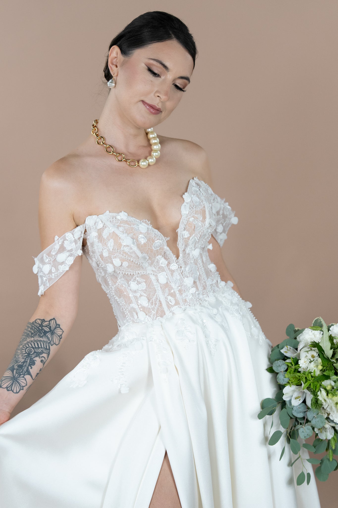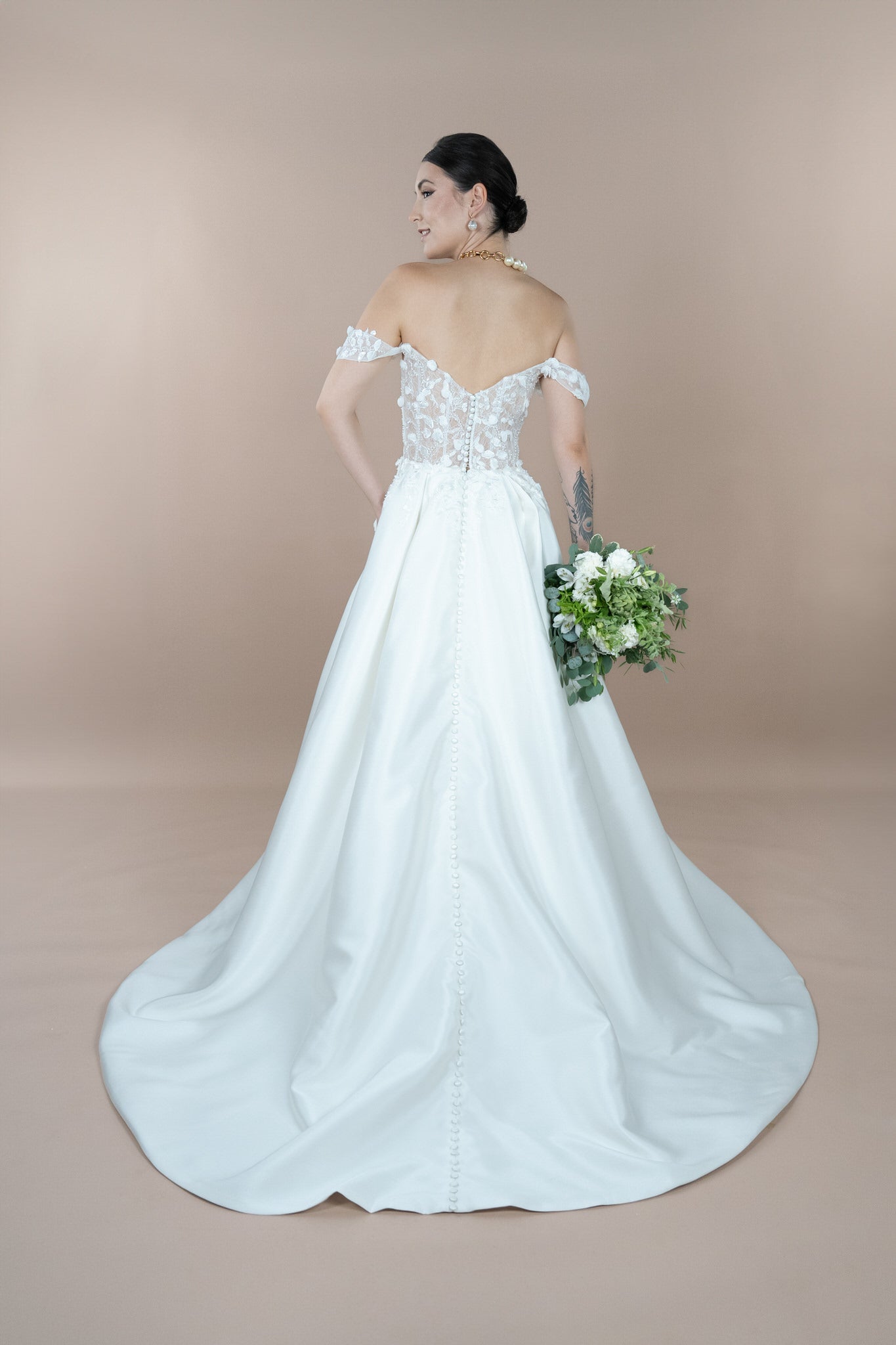 Die A-Linie Kreation des Bridonista V25-27 schmeichelt jeder Silhouette. Der Carmen-Ausschnitt umschmeichelt sanft deine Schultern und verleiht deinem Look eine romantische Note. Durch den off-the-shoulder Stil fühlst du dich nicht nur elegant, sondern auch modern und selbstbewusst. Die raffinierte Knopfleiste entlang des Rückens betont deinen Rücken auf traumhafte Weise und sorgt für einen Hauch von Tradition im angesagten Hochzeitslook.