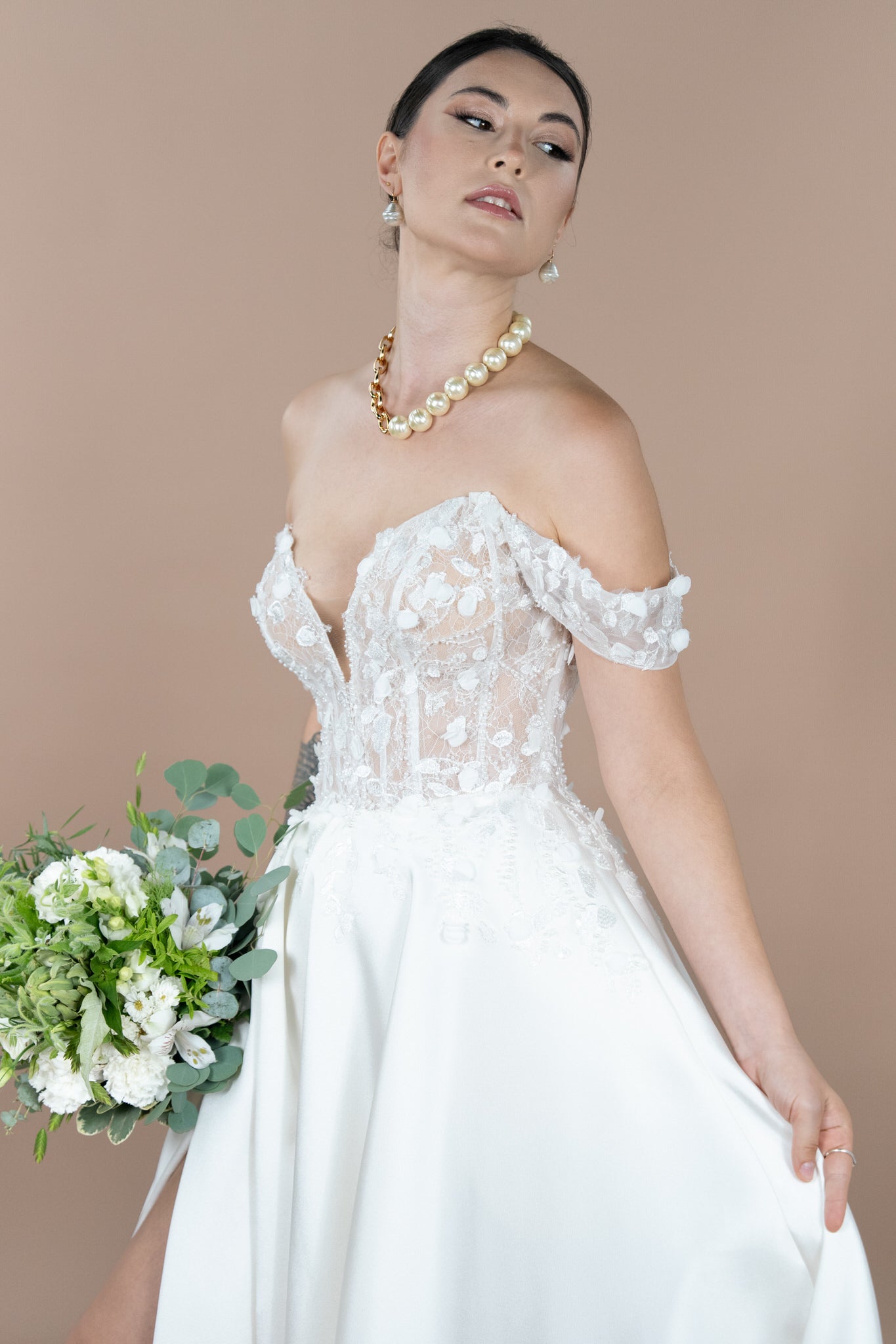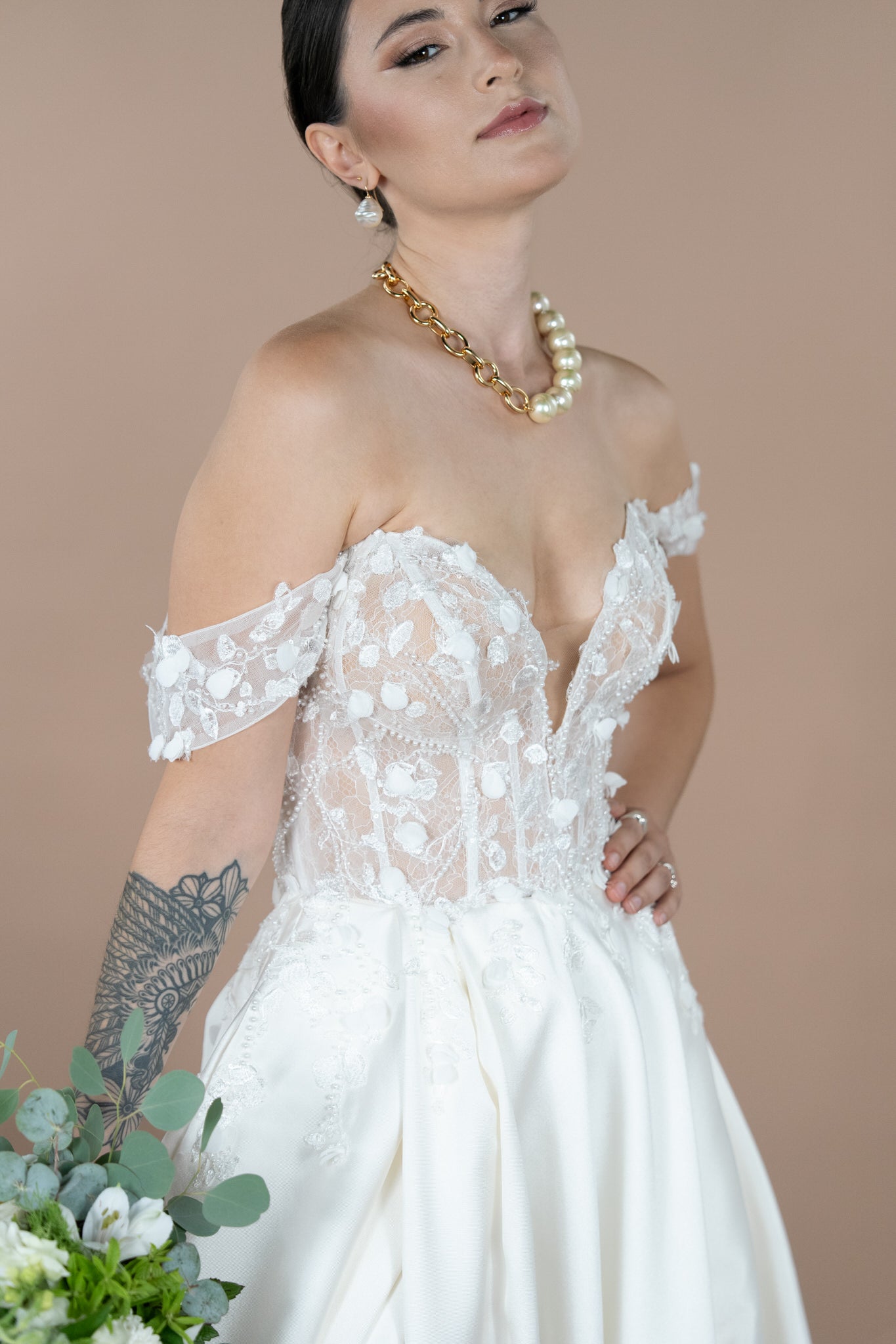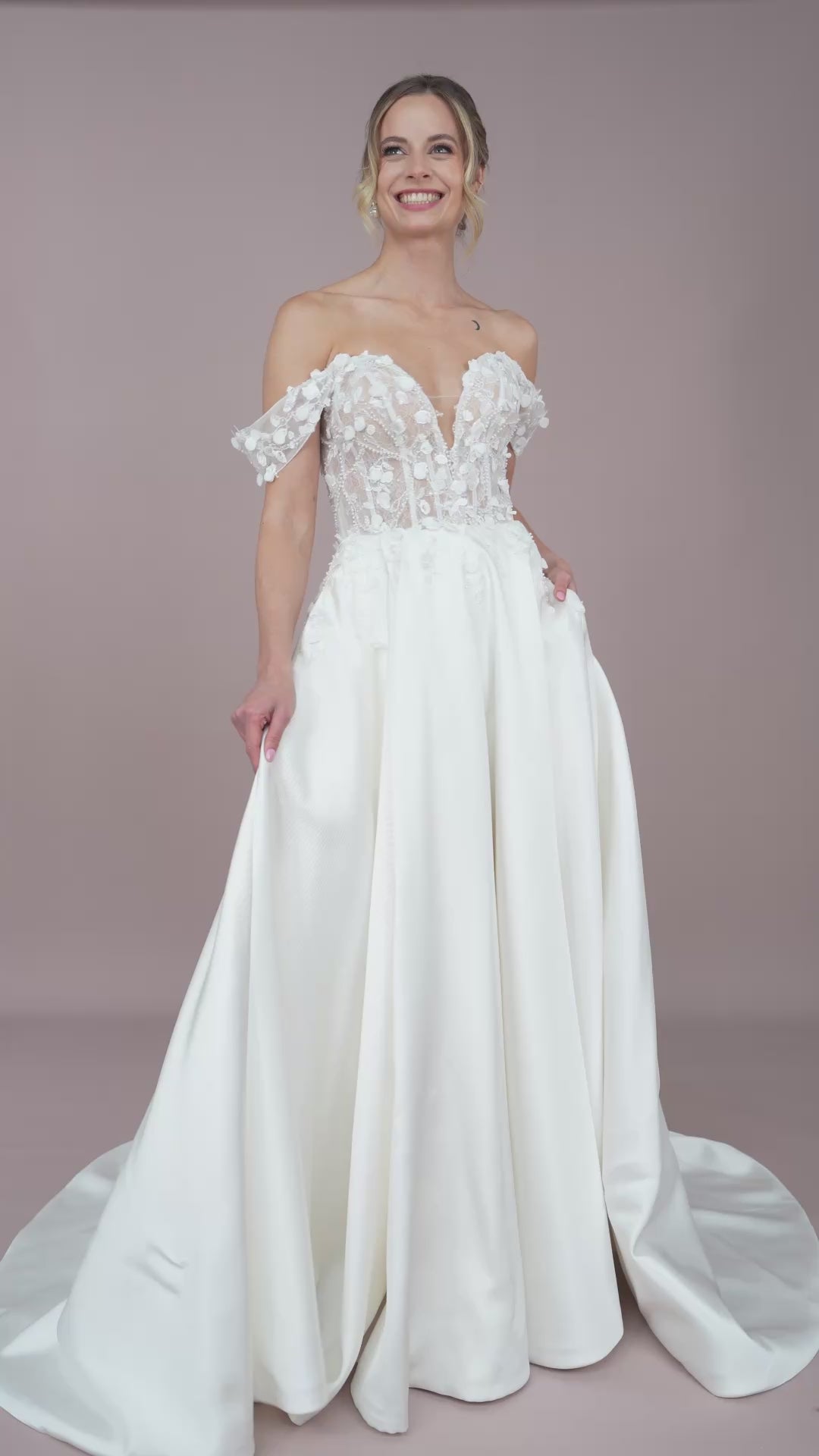 Die A-Linie Kreation des Bridonista V25-27 schmeichelt jeder Silhouette. Der Carmen-Ausschnitt umschmeichelt sanft deine Schultern und verleiht deinem Look eine romantische Note. Durch den off-the-shoulder Stil fühlst du dich nicht nur elegant, sondern auch modern und selbstbewusst. Die raffinierte Knopfleiste entlang des Rückens betont deinen Rücken auf traumhafte Weise und sorgt für einen Hauch von Tradition im angesagten Hochzeitslook.
