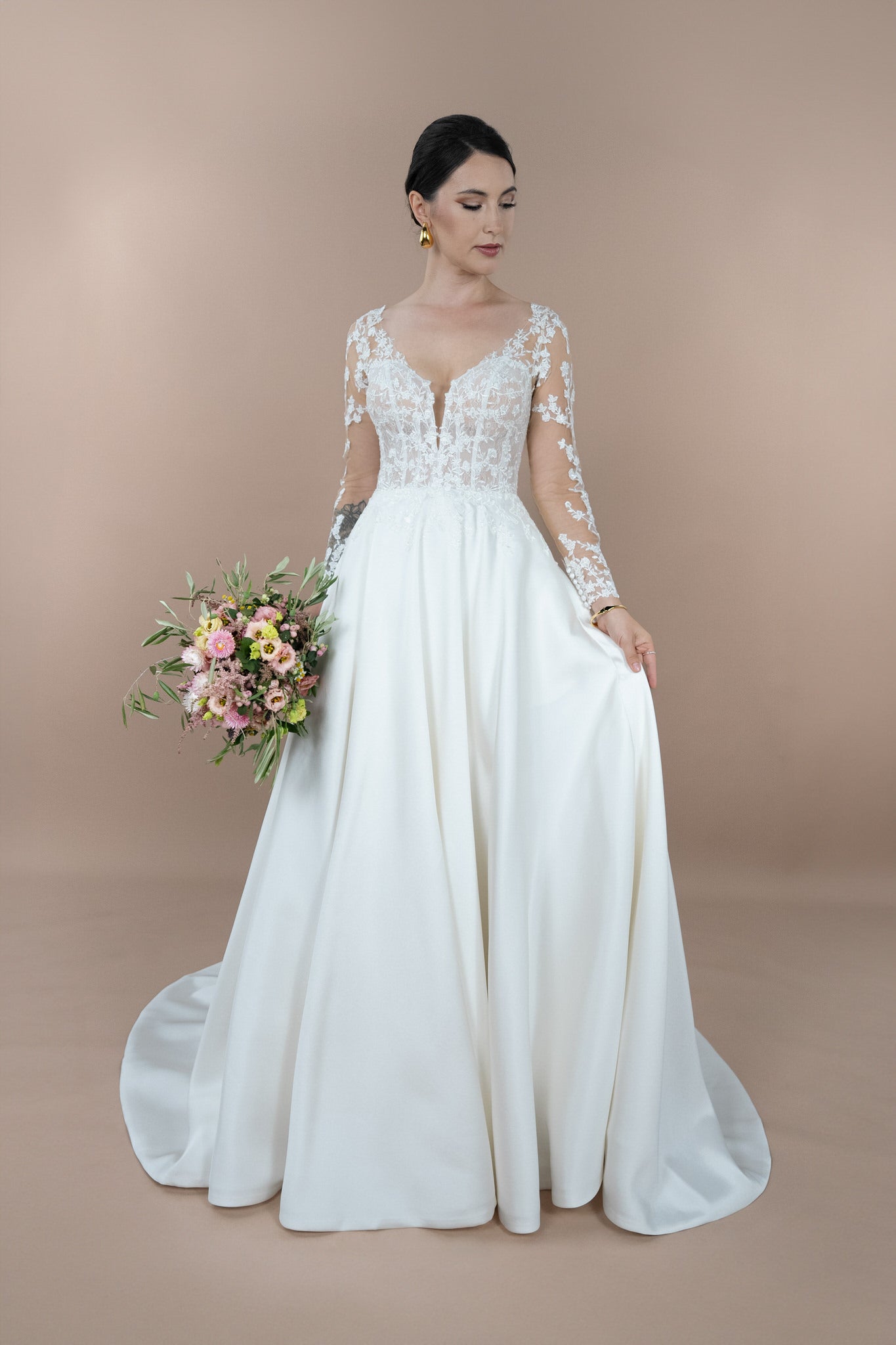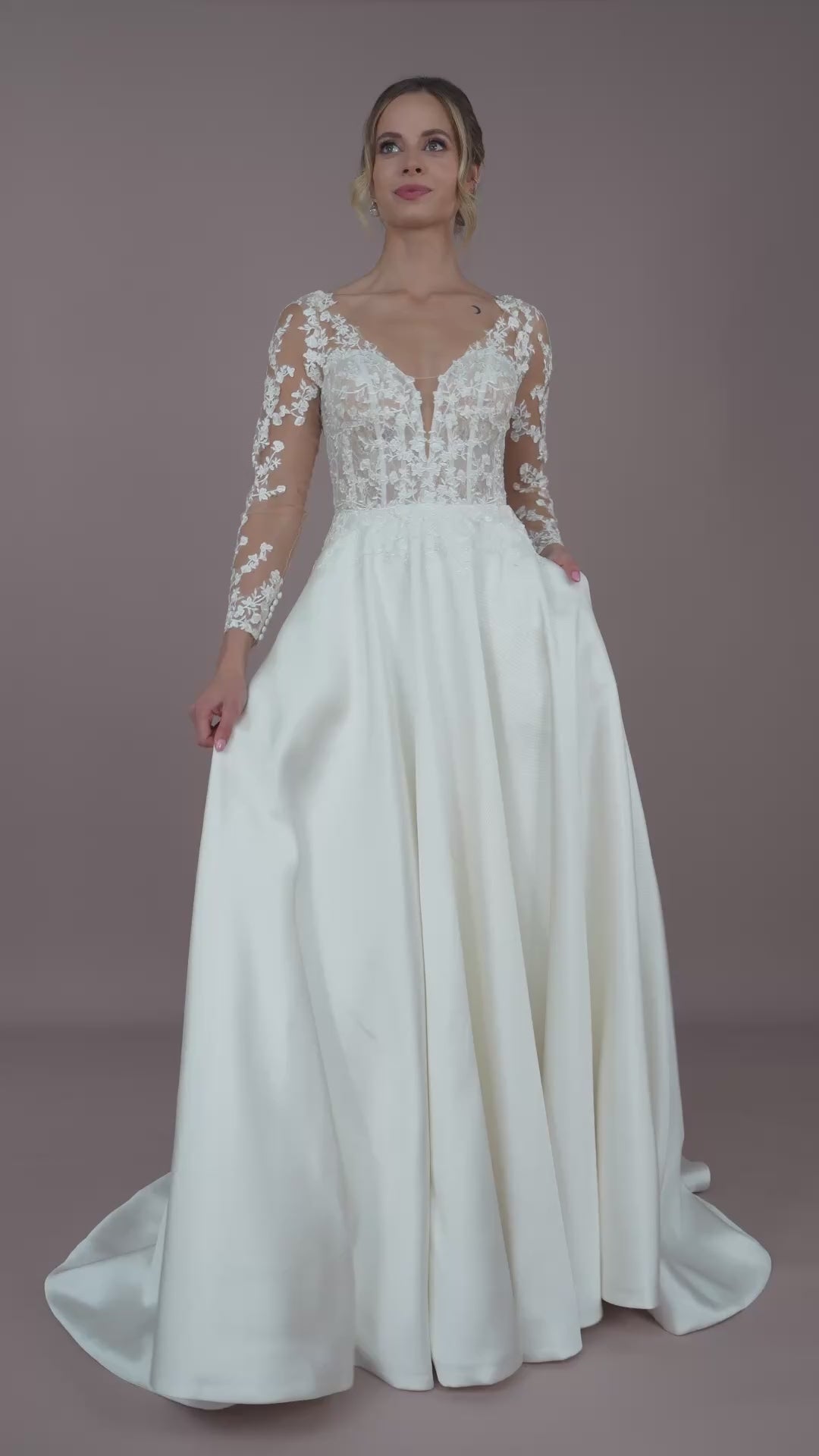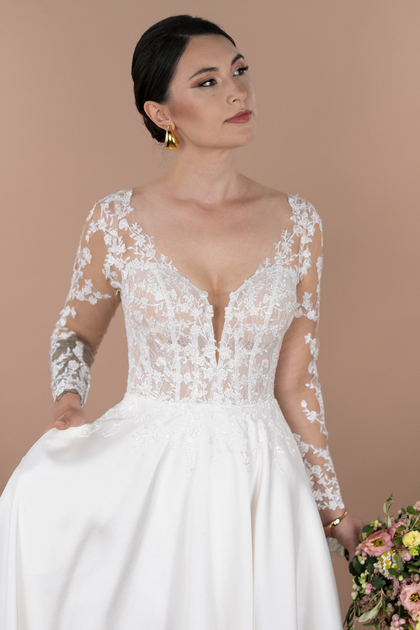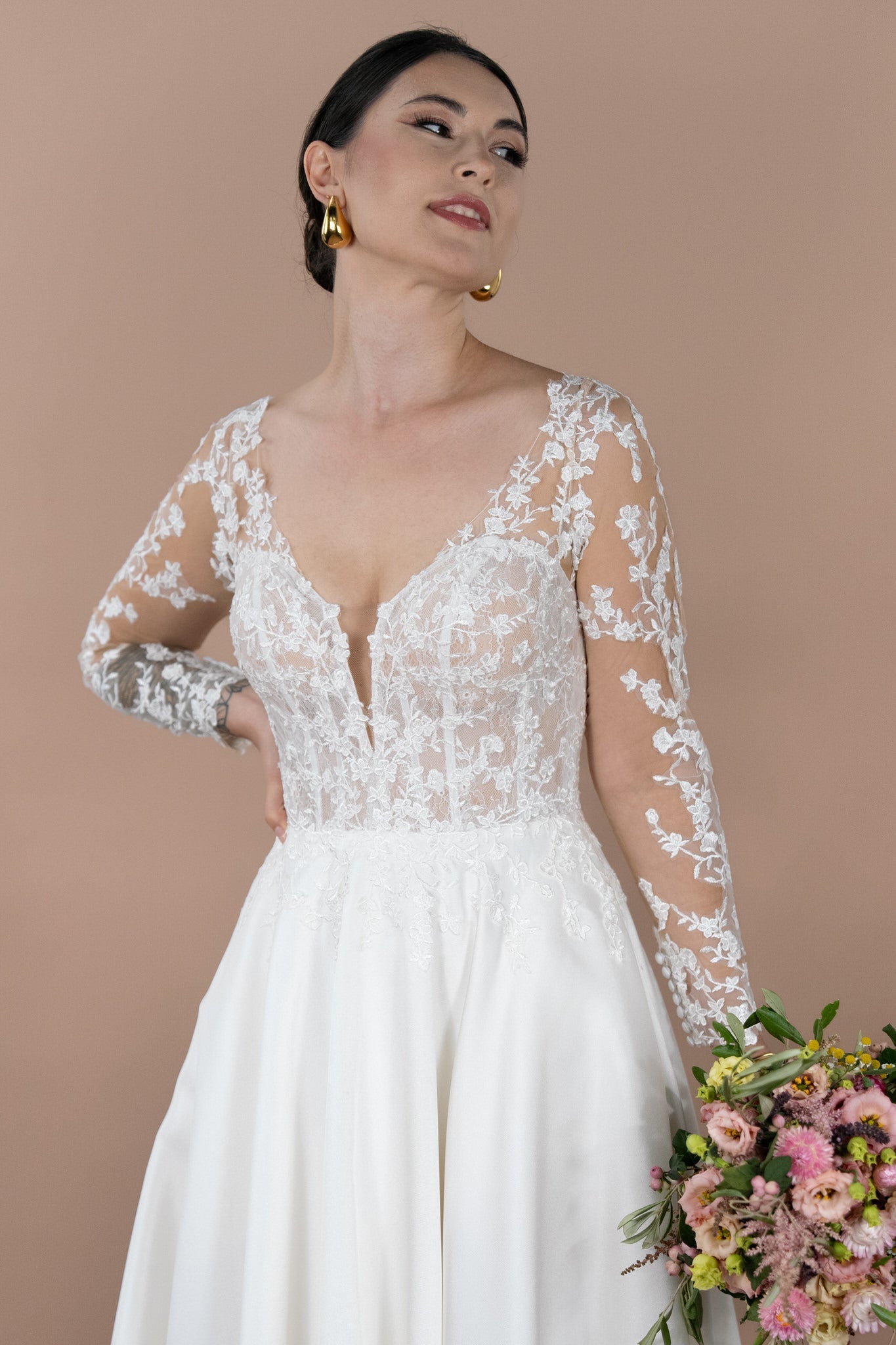 Die A-Linien-Silhouette des Bridonista V25-28 schmeichelt jeder Figur und bietet eine sanfte, flatternde Passform, die dich während der gesamten Hochzeitsfeier umhüllt. Der elegante V-Ausschnitt setzt dein Dekolleté wunderschön in Szene und sorgt für eine zeitlose Anmut. Die langärmelige Ausführung in Kombination mit zarter Spitze verleiht dem Kleid eine romantische Note und zeigt stilvoll die feminine Seite jeder Braut. Die abnehmbaren Ärmel bieten dir die Flexibilität, je nach Stimmung und Anlass zwischen einem eleganten und einem lässigen Look zu wechseln.