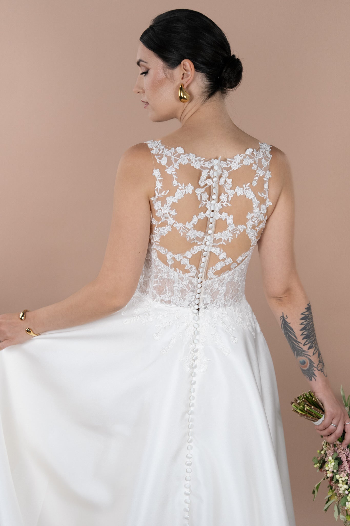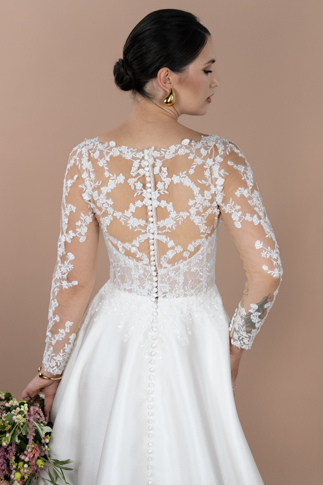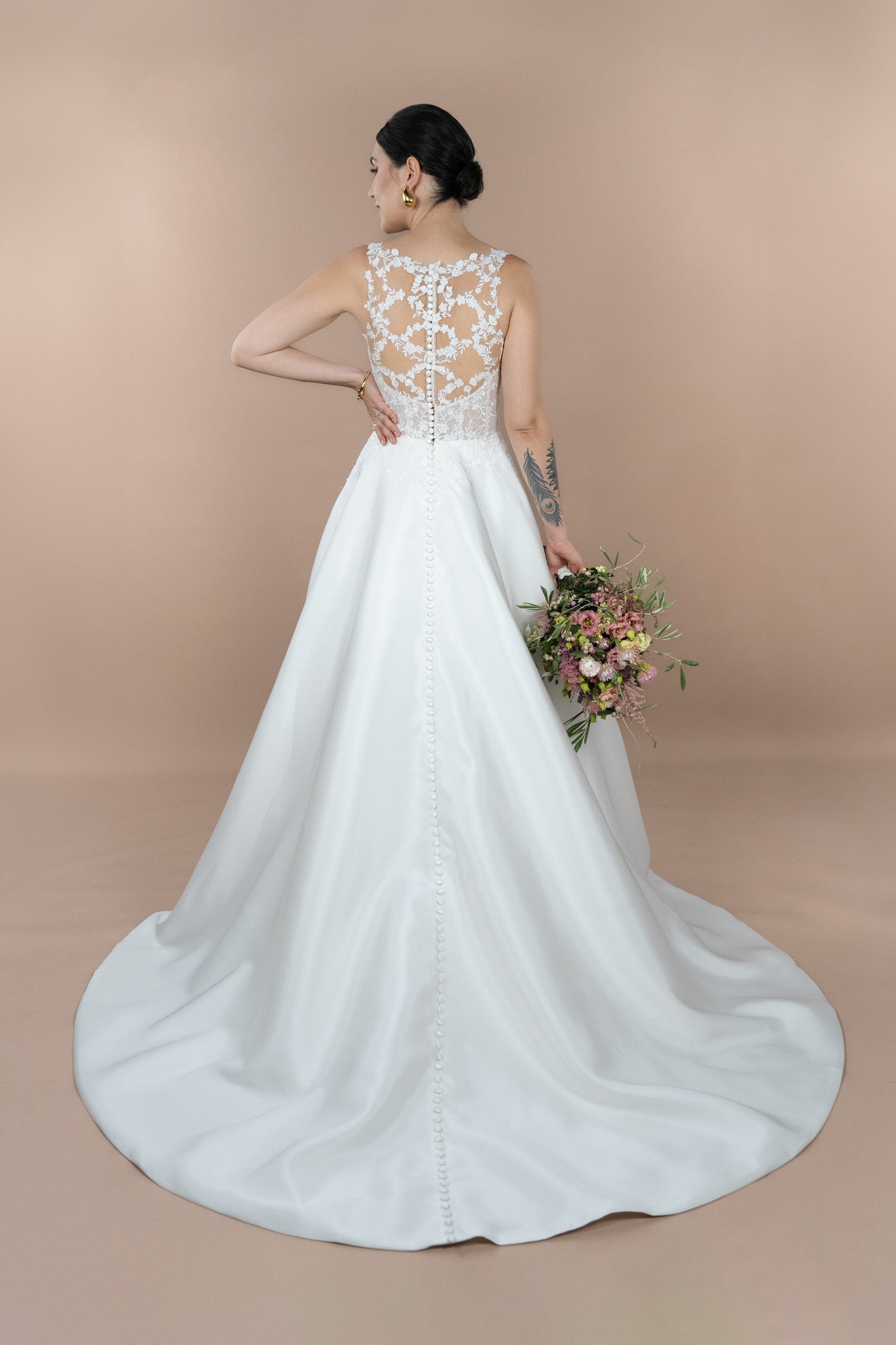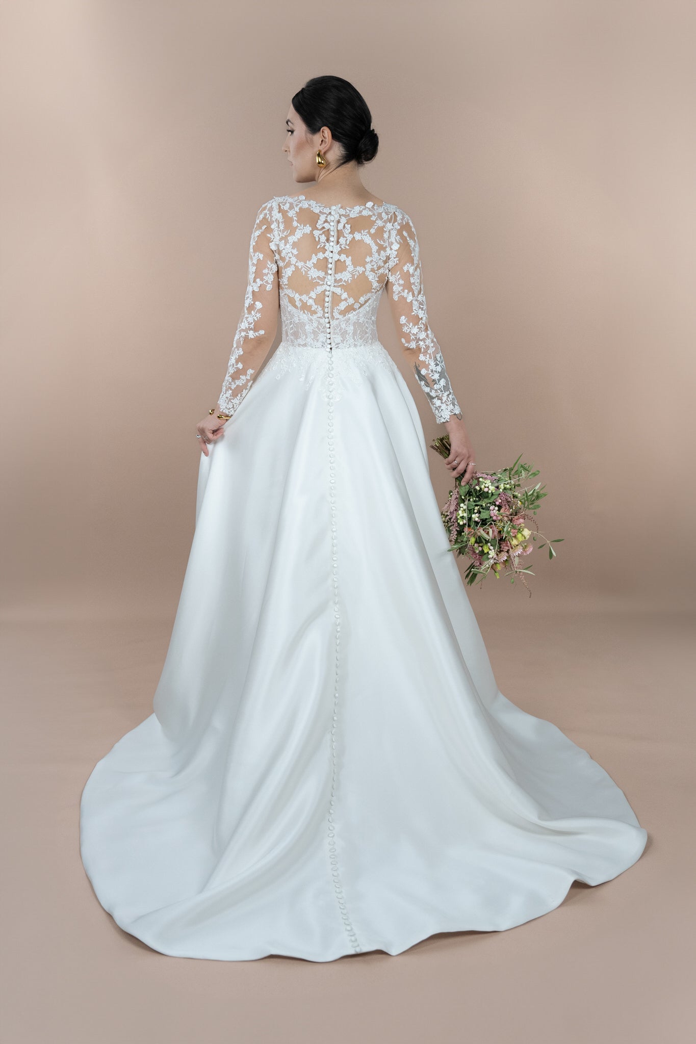 Hergestellt aus hochwertigem Mikado, bietet das Kleid nicht nur einen luxuriösen Glanz, sondern auch einen hervorragenden Tragekomfort. Die feine Chantilly-Spitze sorgt in Kombination mit dem charmanten Tattoo-Effekt an den Ärmeln für einen faszinierenden Blickfänger. Die glitzernden Akzente verleihen dem Kleid eine zusätzliche Dimension und lässt dich bei jeder Bewegung strahlen. Eine elegante Knopfleiste entlang des Rückens wertet das Design wunderbar auf und macht es gleichzeitig zu einem besonderen Detail, das die Rückansicht optimal betont.