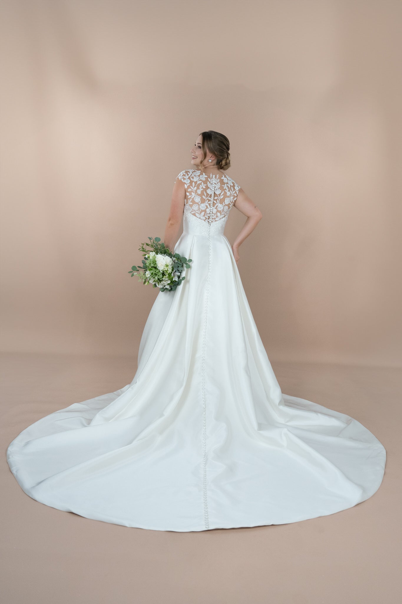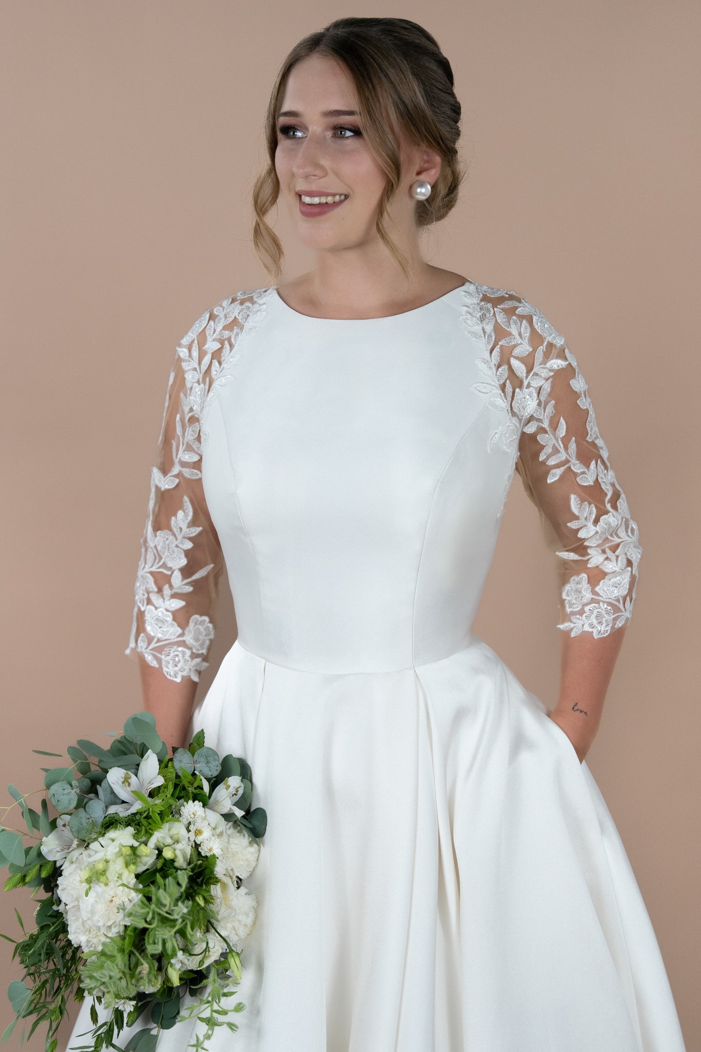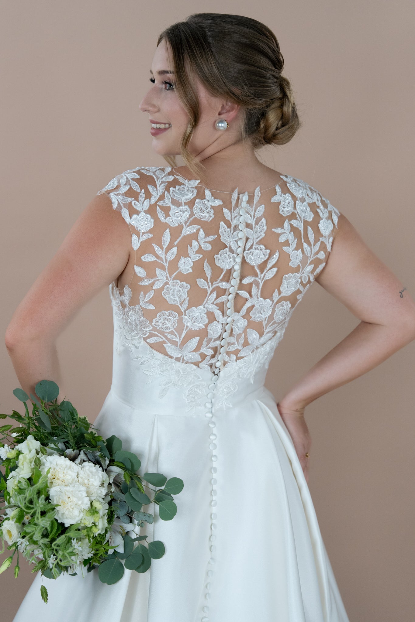 Die Verwendung von edlem Mikado verleiht dem Kleid einen luxuriösen Glanz und sorgt gleichzeitig für einen angenehmen Tragekomfort. Dieser hochwertige Stoff bietet ein erstklassiges Gefühl und fügt dem Kleid einen leichten, strukturierten Fall hinzu. Zusätzliche Raffinesse erhält das Design durch zarte Spitze und den anmutigen Illusion-Tüll, der einen bezaubernden Tattoo-Effekt erzeugt. Diese Details sorgen für eine moderne Note und setzen romantische Akzente, die das Kleid einzigartig machen.