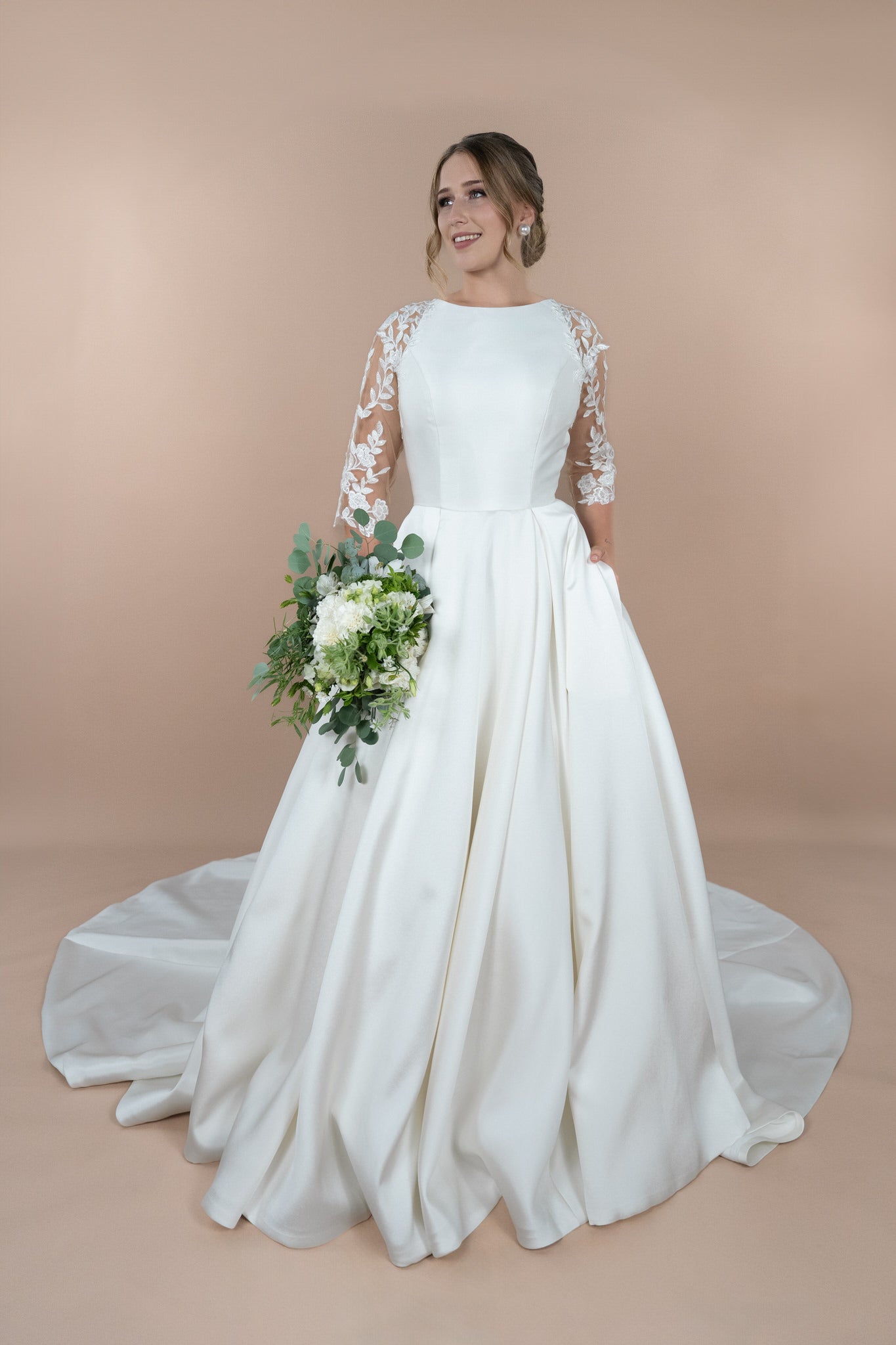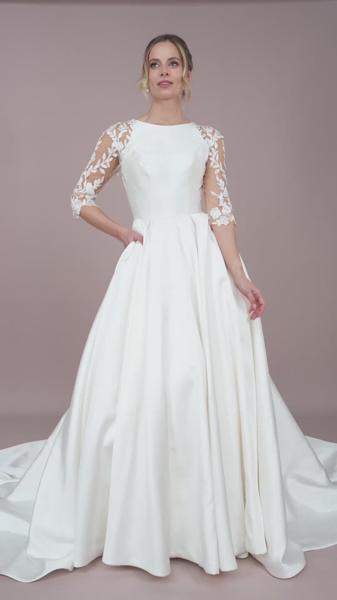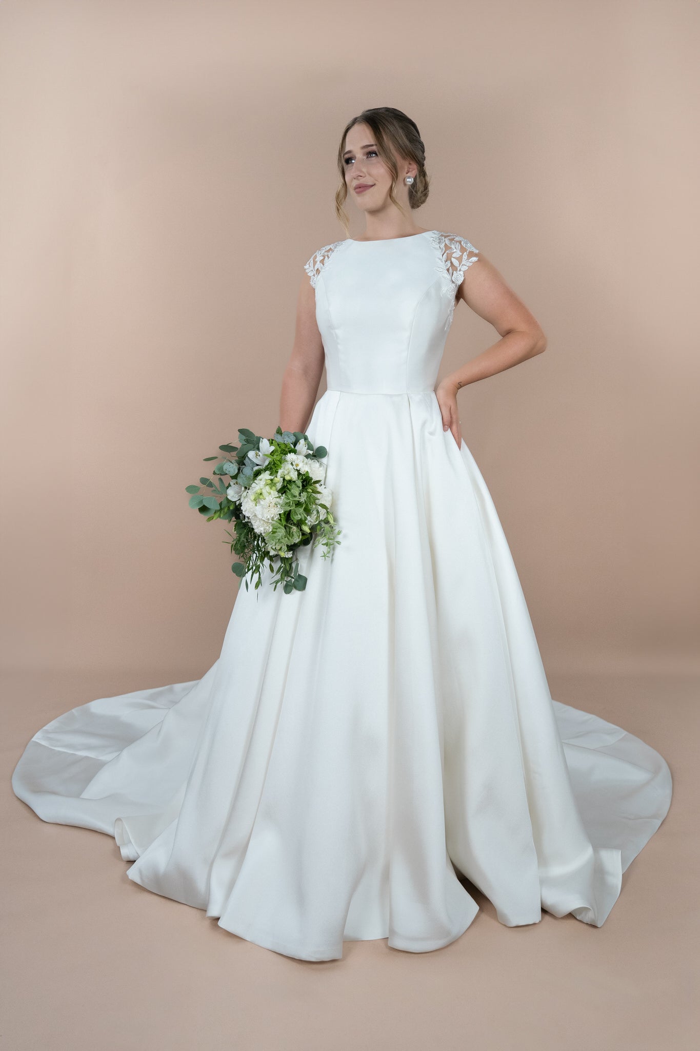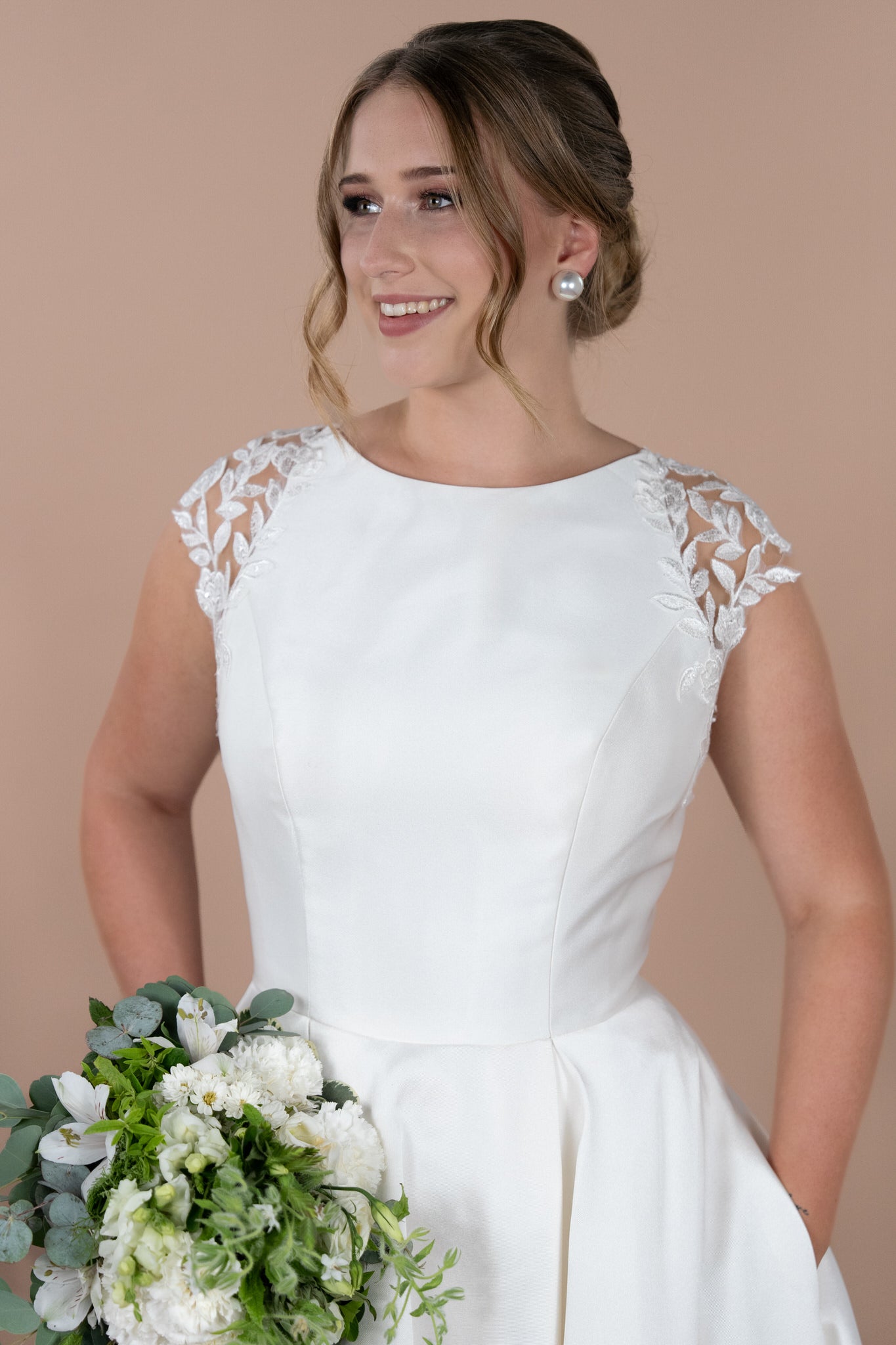 Die Verwendung von edlem Mikado verleiht dem Kleid einen luxuriösen Glanz und sorgt gleichzeitig für einen angenehmen Tragekomfort. Dieser hochwertige Stoff bietet ein erstklassiges Gefühl und fügt dem Kleid einen leichten, strukturierten Fall hinzu. Zusätzliche Raffinesse erhält das Design durch zarte Spitze und den anmutigen Illusion-Tüll, der einen bezaubernden Tattoo-Effekt erzeugt. Diese Details sorgen für eine moderne Note und setzen romantische Akzente, die das Kleid einzigartig machen.