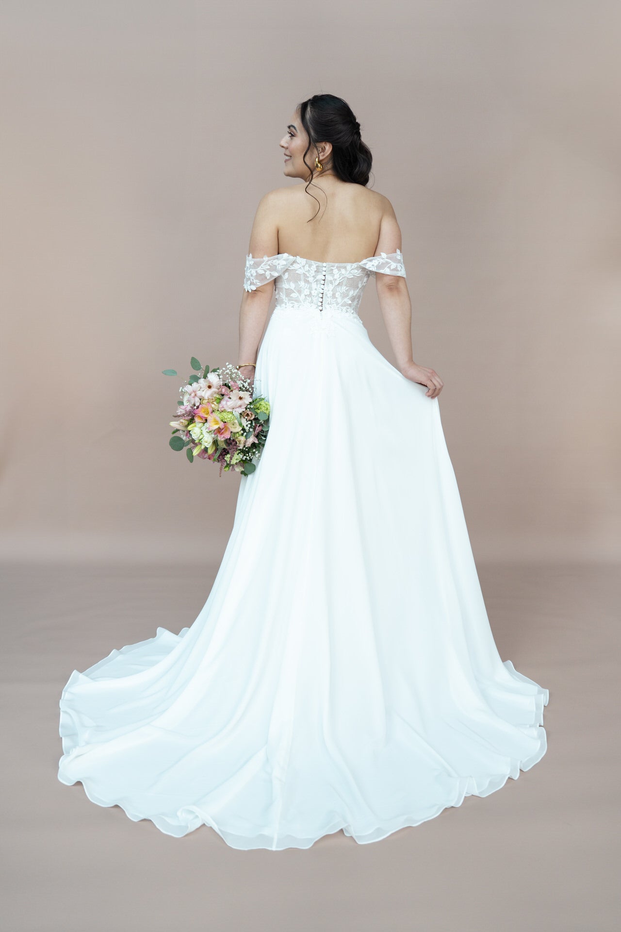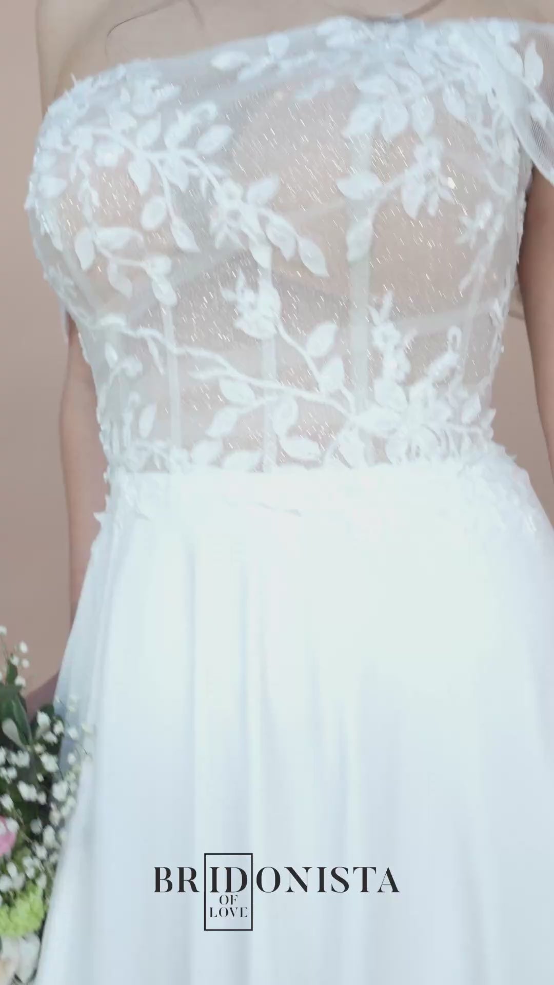 Verleihe Deinem großen Tag eine zauberhafte Note mit dem Bridonista V26-A01 Hochzeitskleid – einem eleganten A-Linien-Kleid, das die Leichtigkeit des Boho- und Vintage-Stils mit einem glamourösen Lingerie-Look vereint. Dieses traumhafte Brautkleid besticht durch zarten Chiffon, funkelnde Glitzerelemente und kunstvolle Blätterspitze, die ihm eine feminine und romantische Ausstrahlung verleihen.
