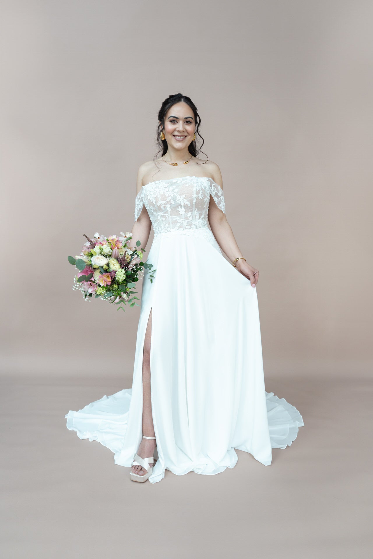 Der fließende Rock mit mittellanger Schleppe und verführerischem Schlitz sorgt für anmutige Bewegungen und eine elegante Silhouette, die bei jedem Schritt alle Blicke auf sich zieht. Die liebevollen Bestickungen und der dezente Glitzer verleihen dem Kleid eine funkelnde Note, die Deinen Auftritt unvergesslich macht.