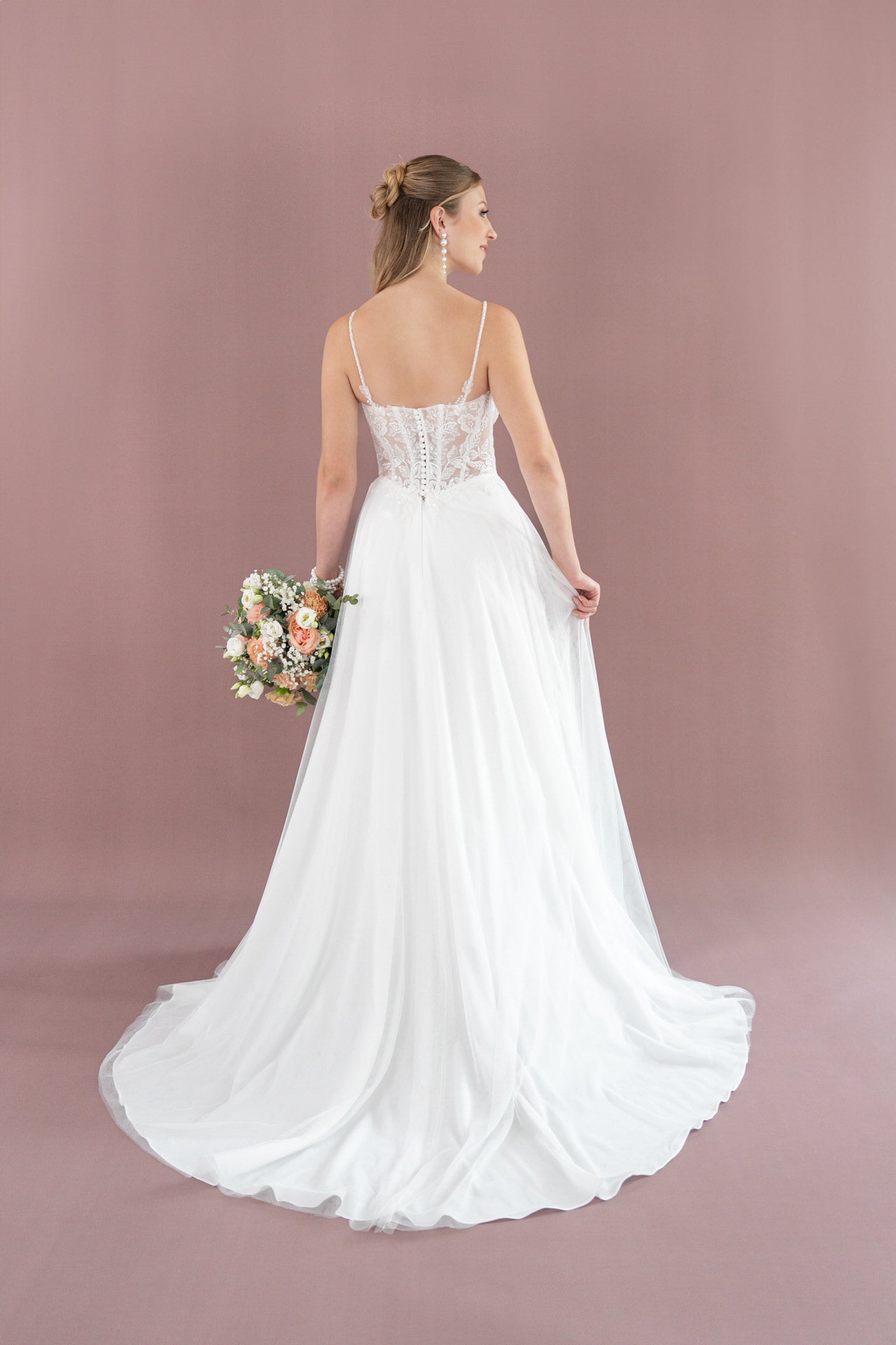 Der gerade Rücken mit eleganter Knopfleiste unterstreicht die feine Handwerkskunst und sorgt für einen stilvollen Akzent. Der fließende Rock mit mittellanger Schleppe und verführerischem Schlitz schenkt Dir Bewegungsfreiheit und eine anmutige Silhouette, die bei jedem Schritt alle Blicke auf sich zieht.