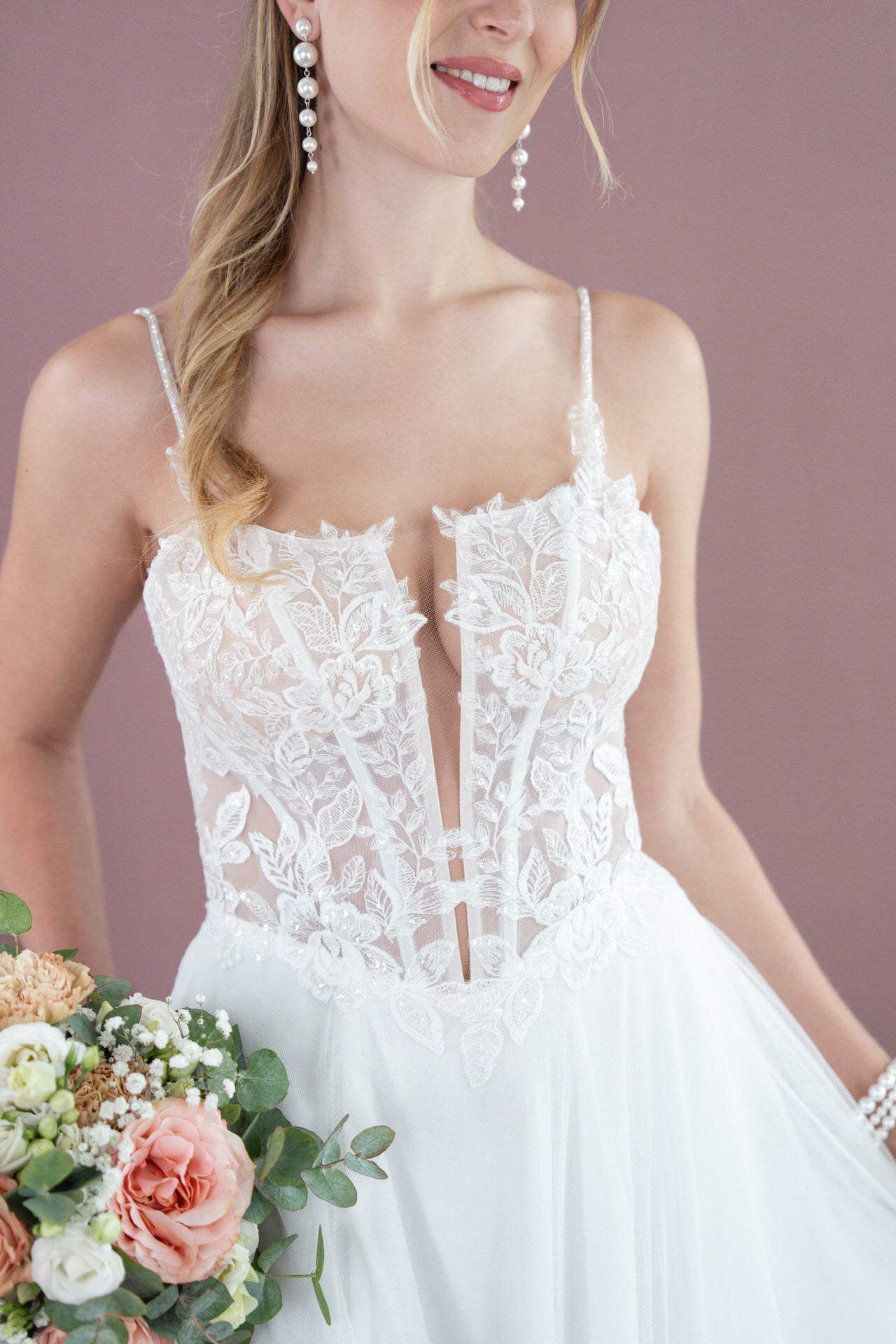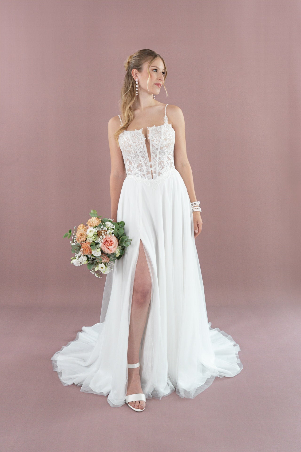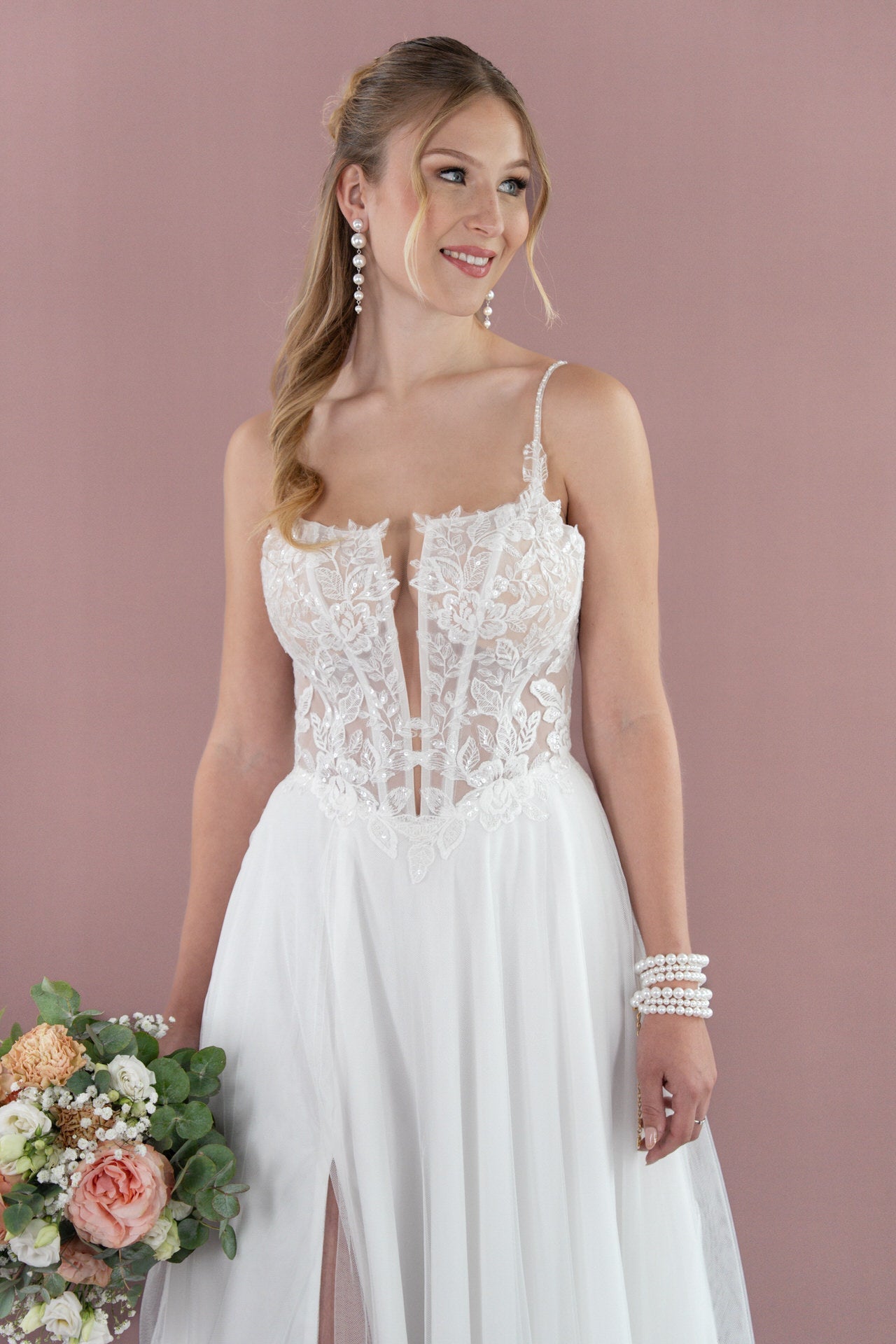 Tauche ein in die zauberhafte Welt des Bridonista V26-A14 Hochzeitskleides – ein elegantes A-Linien-Brautkleid, das die perfekte Balance zwischen romantischem Boho-Charme und sinnlichem Lingerie-Look schafft. Dieses traumhafte Kleid verführt mit seiner femininen Silhouette und liebevollen Details, die Deinen großen Tag zu einem unvergesslichen Erlebnis machen.