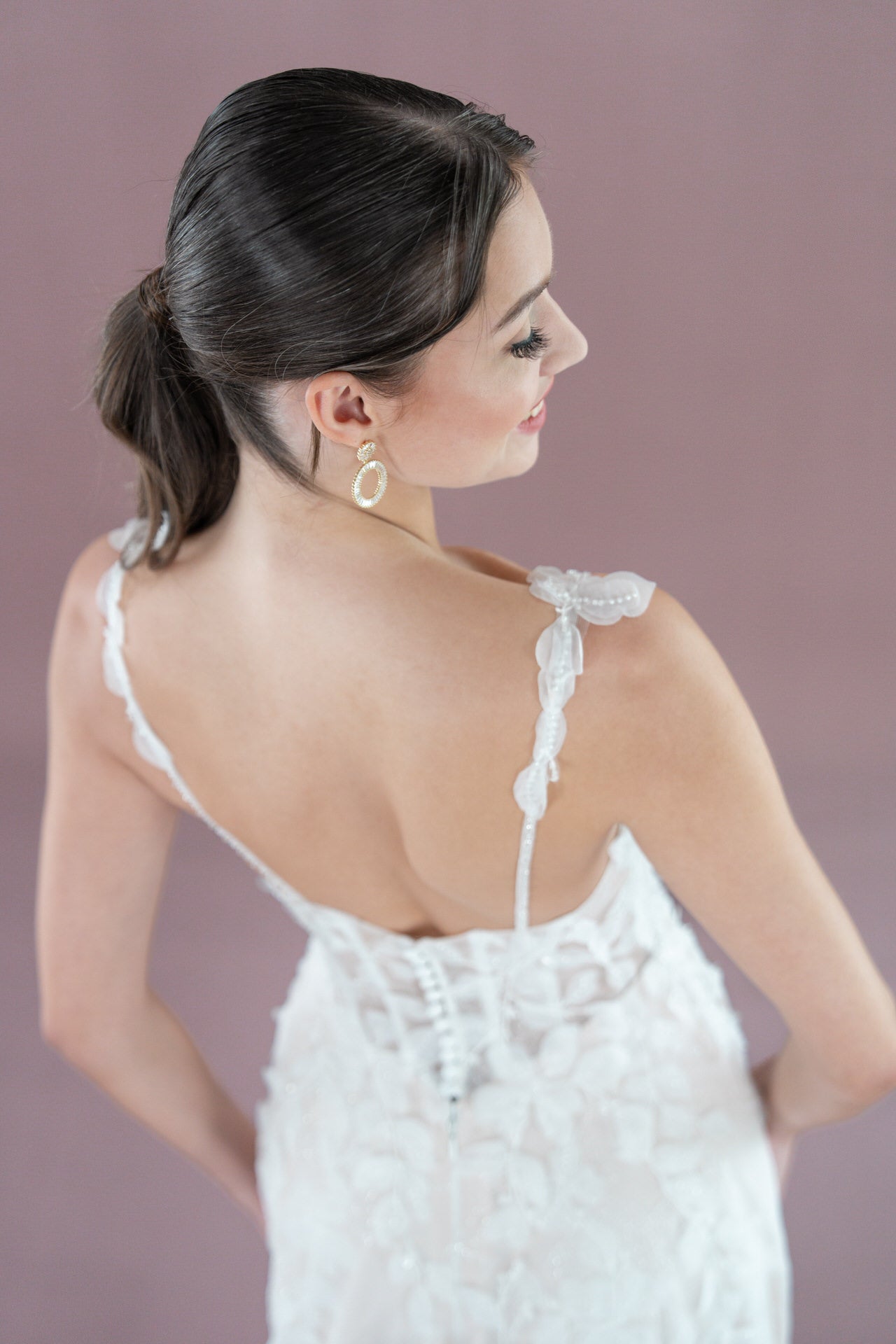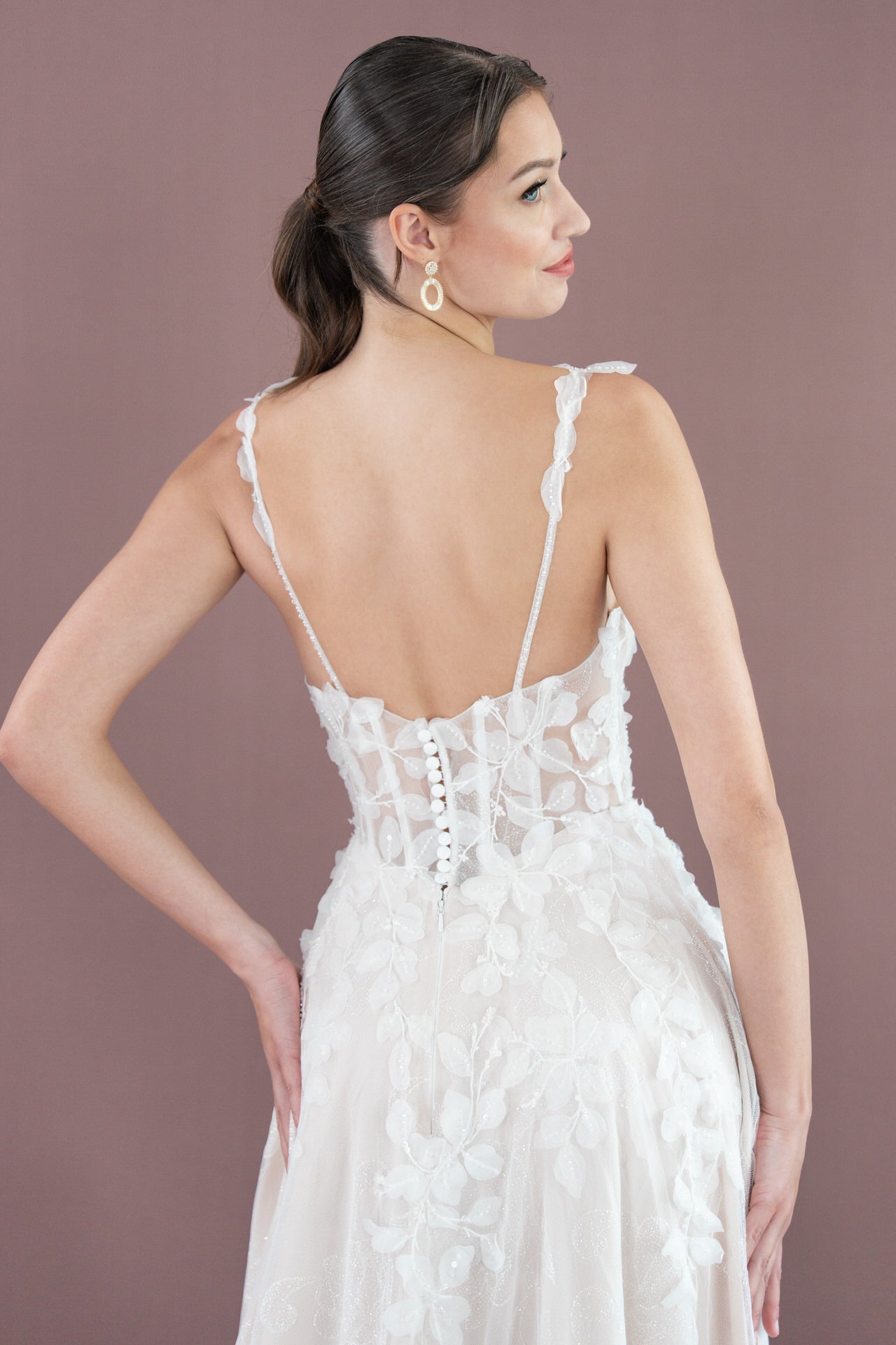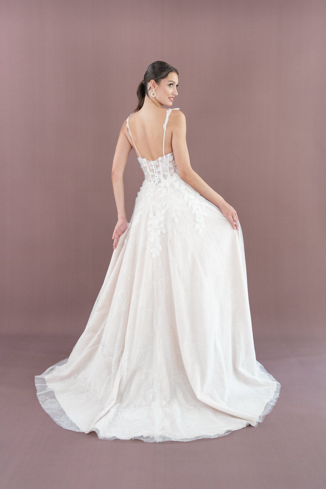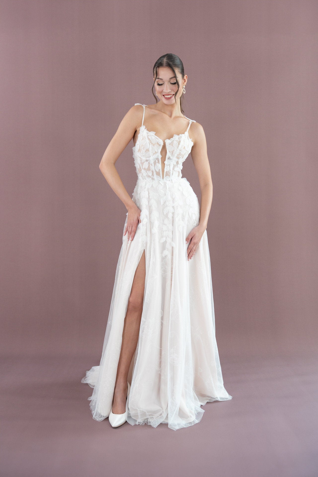 Der fließende Rock mit mittellanger Schleppe und elegantem Schlitz sorgt für eine anmutige Bewegung und verleiht Dir bei jedem Schritt eine unvergessliche Silhouette. Der Illusion-Tüll mit stilvoller Knopfleiste rundet das Design mit einem raffinierten, romantischen Detail ab.