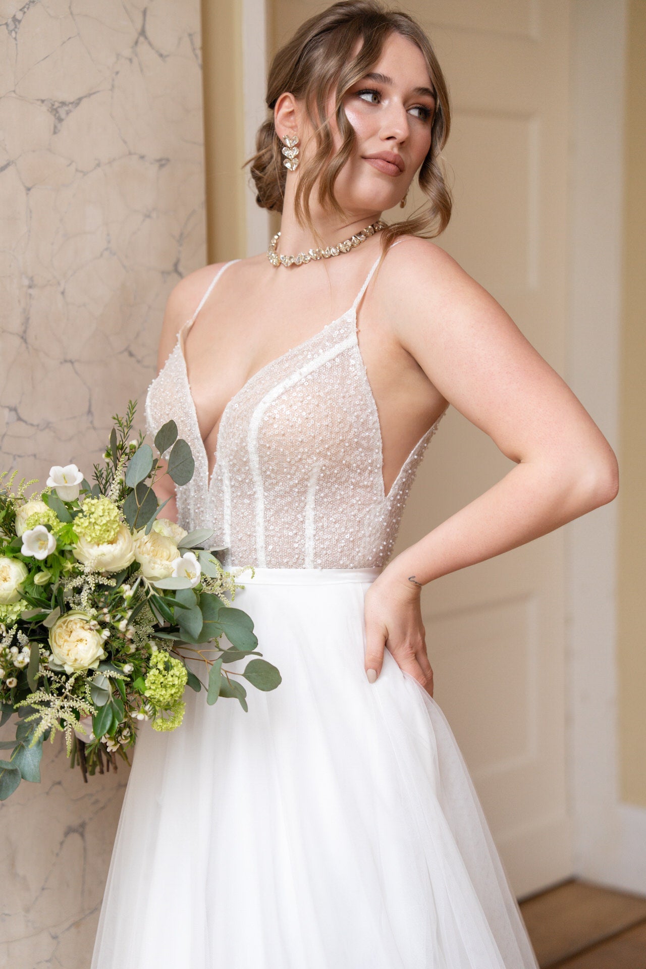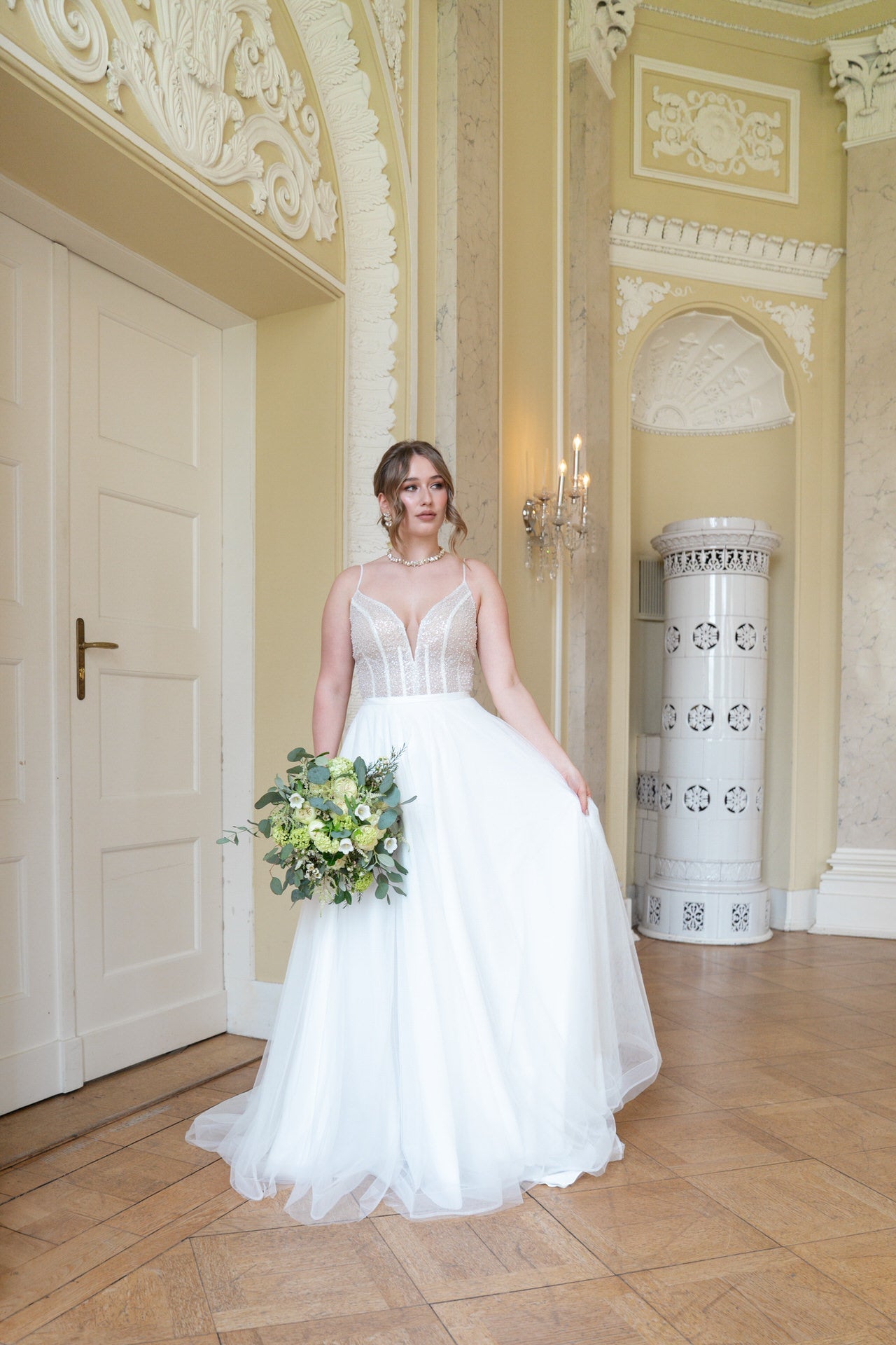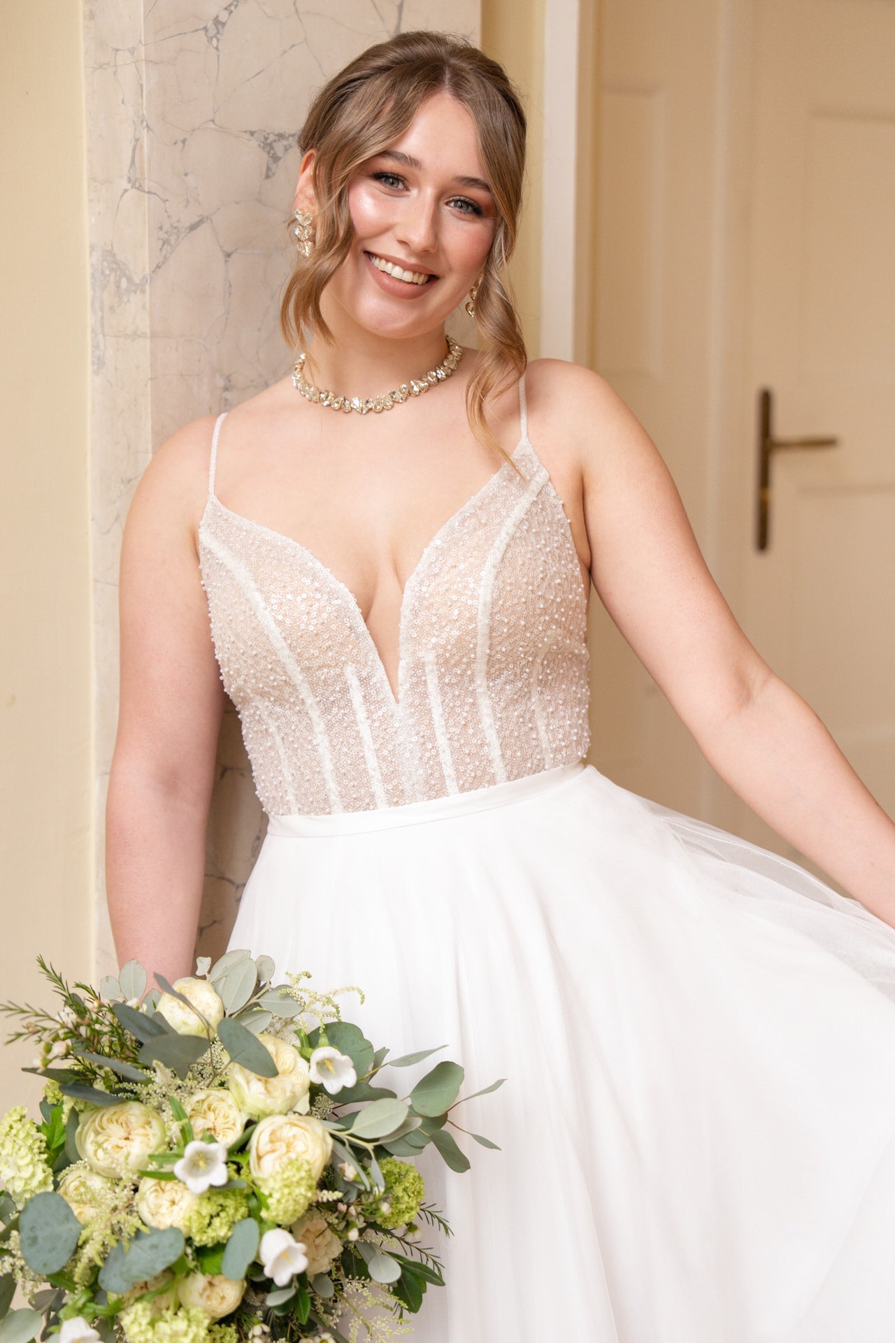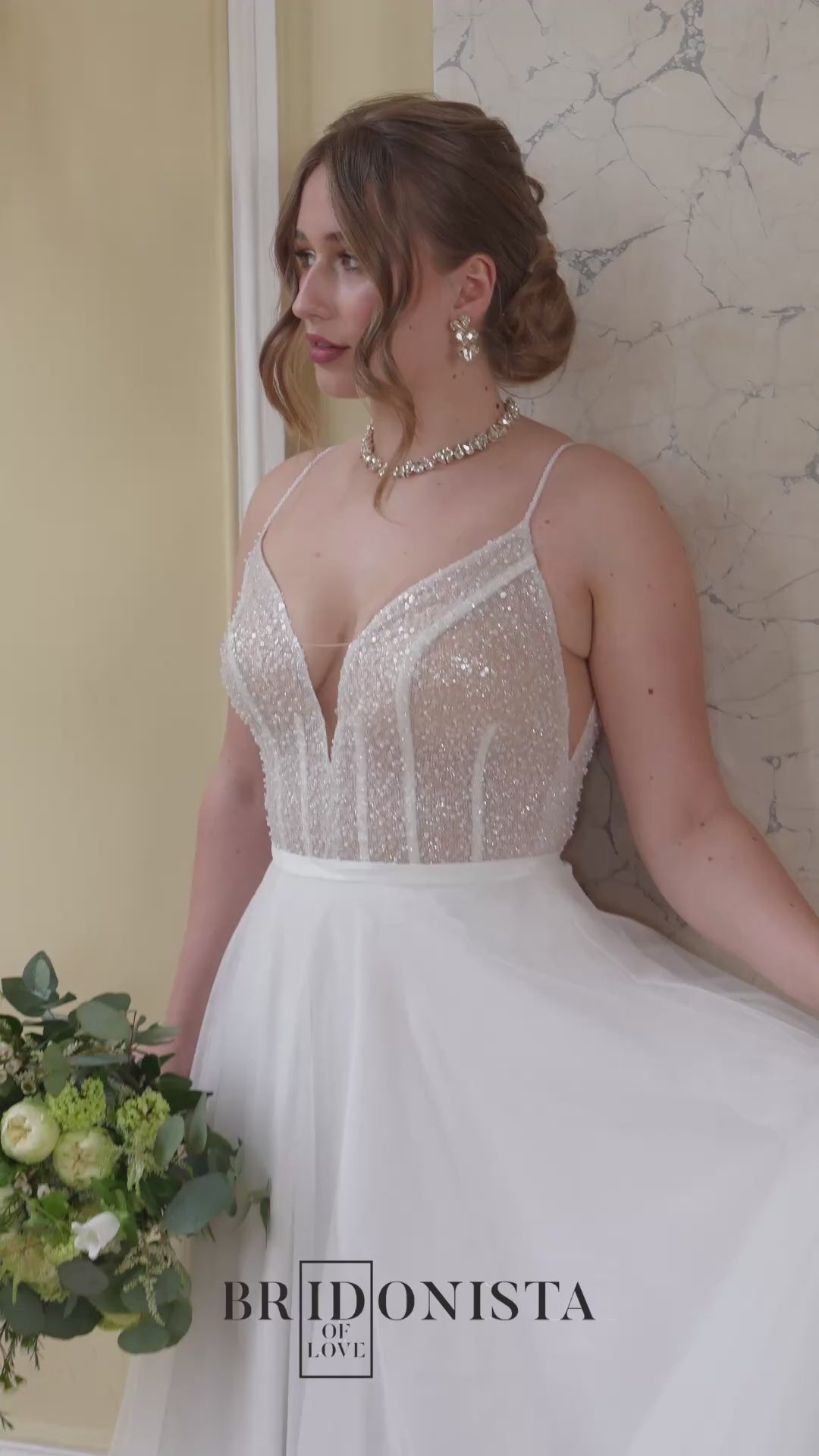 Strahle an Deinem großen Tag mit dem Bridonista V26-A23 Hochzeitskleid – einem eleganten A-Linien-Kleid, das Boho- und Vintage-Elemente mit einem glamourösen Lingerie-Look vereint. Dieses traumhafte Brautkleid begeistert mit zartem Tüll, funkelnden Pailletten und kunstvollen Bestickungen, die ihm eine magische Ausstrahlung verleihen.