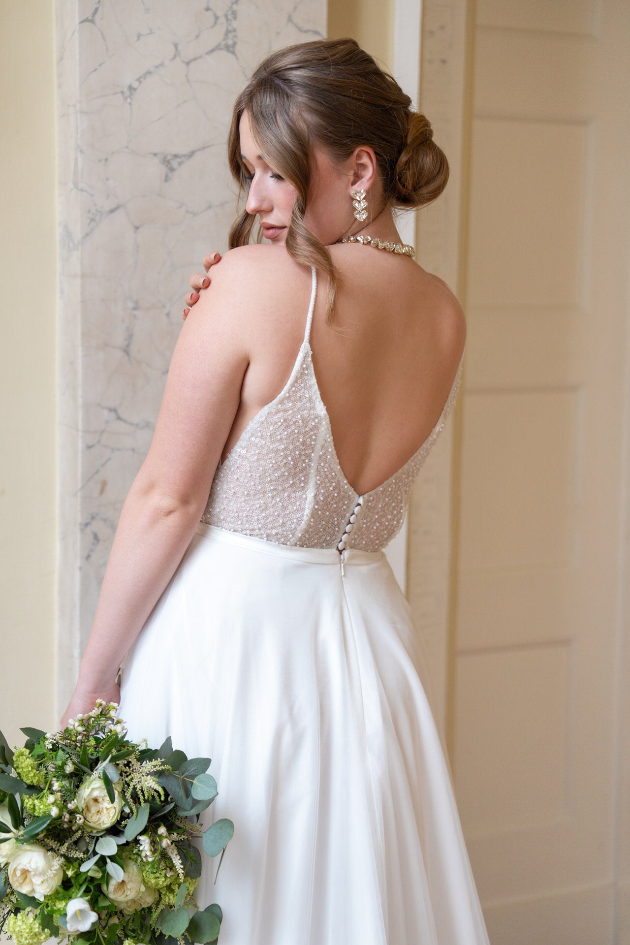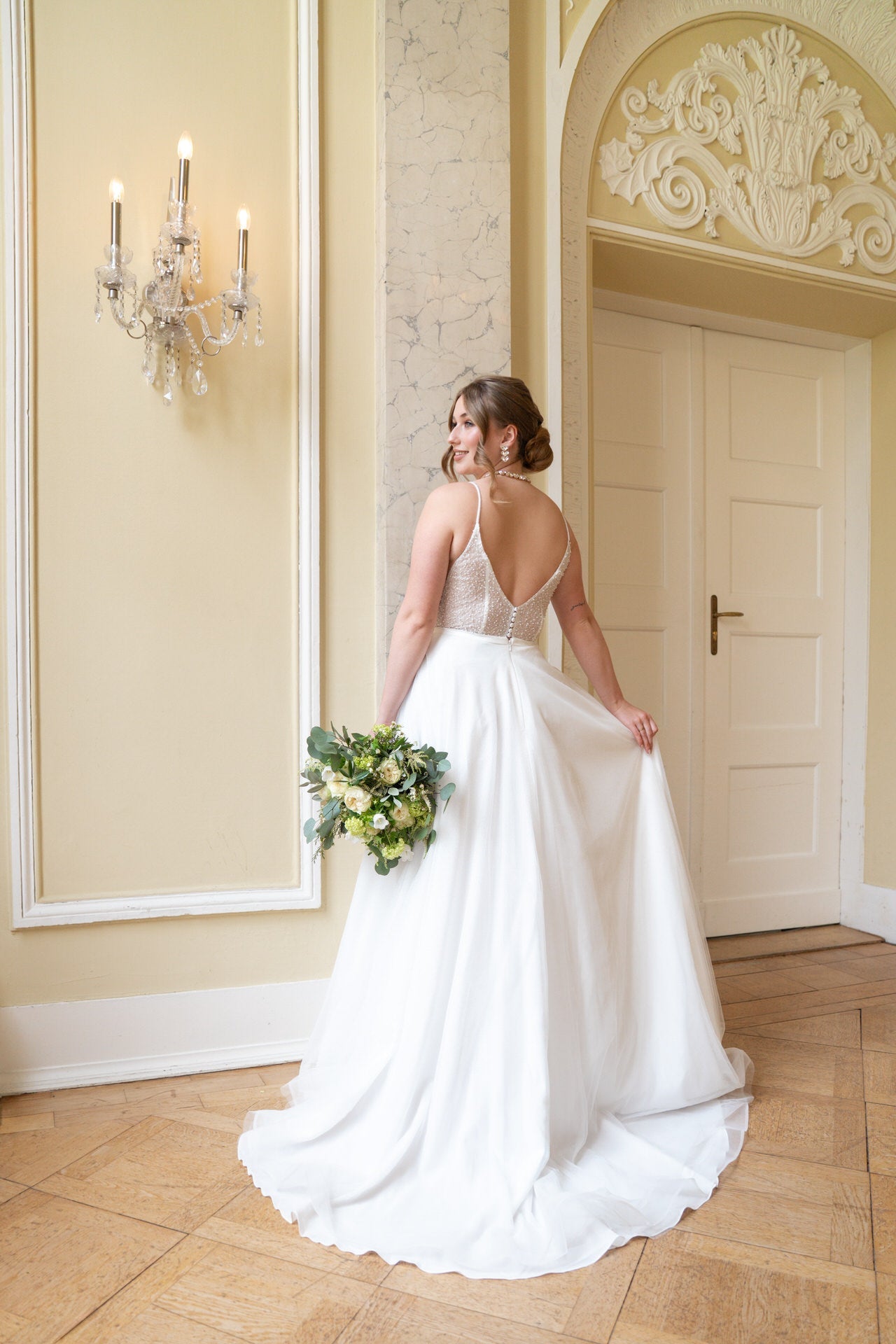 Der fließende Rock mit mittellanger Schleppe und elegantem Schlitz schenkt Dir Bewegungsfreiheit und eine anmutige Silhouette, die bei jedem Schritt bezaubert. Der glitzernde Stoff sorgt für einen funkelnden Auftritt, der alle Blicke auf sich zieht.