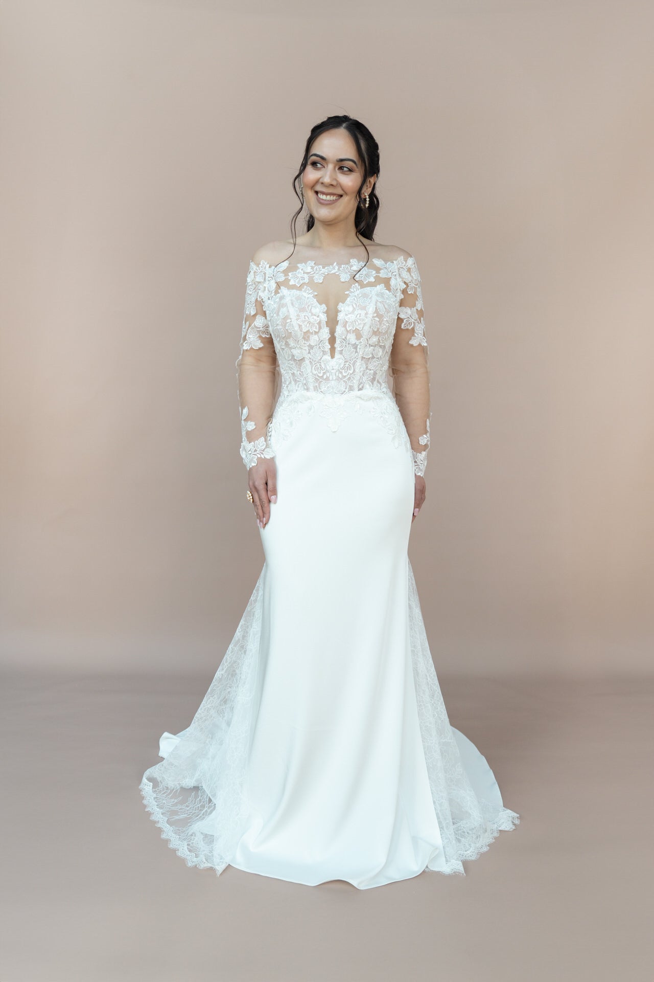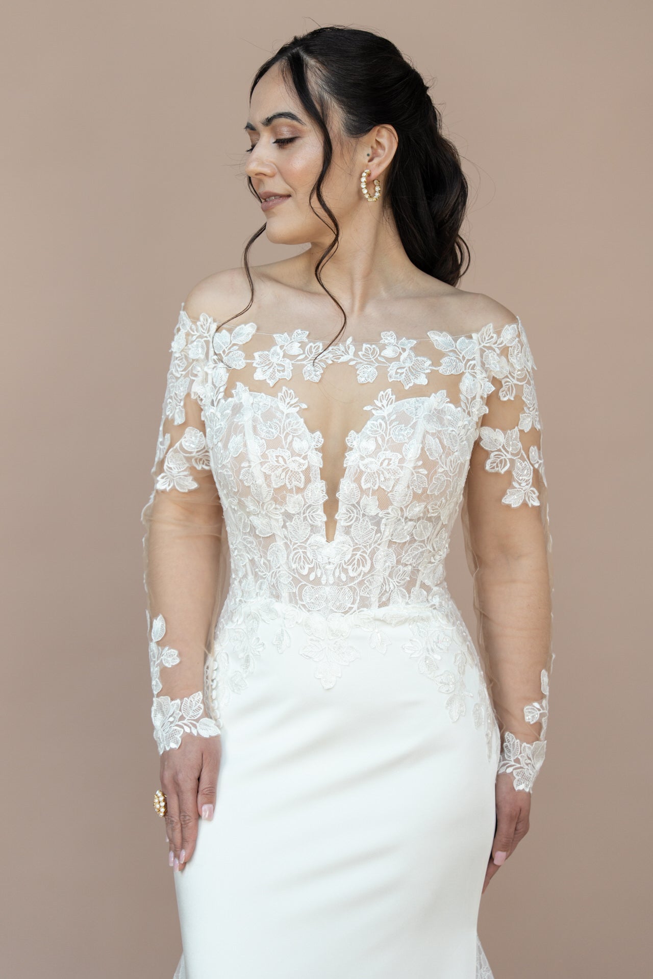 Gefertigt aus zarter Blätterspitze und kunstvoll besticktem Stoff, umhüllt Dich das Kleid mit einer leichten, fließenden Eleganz. Die abnehmbaren, langärmeligen Ärmel aus Illusion-Tüll mit Tattoo-Effekt schenken Dir vielseitige Stylingmöglichkeiten – ob elegant bedeckt oder verführerisch offen, Du entscheidest.