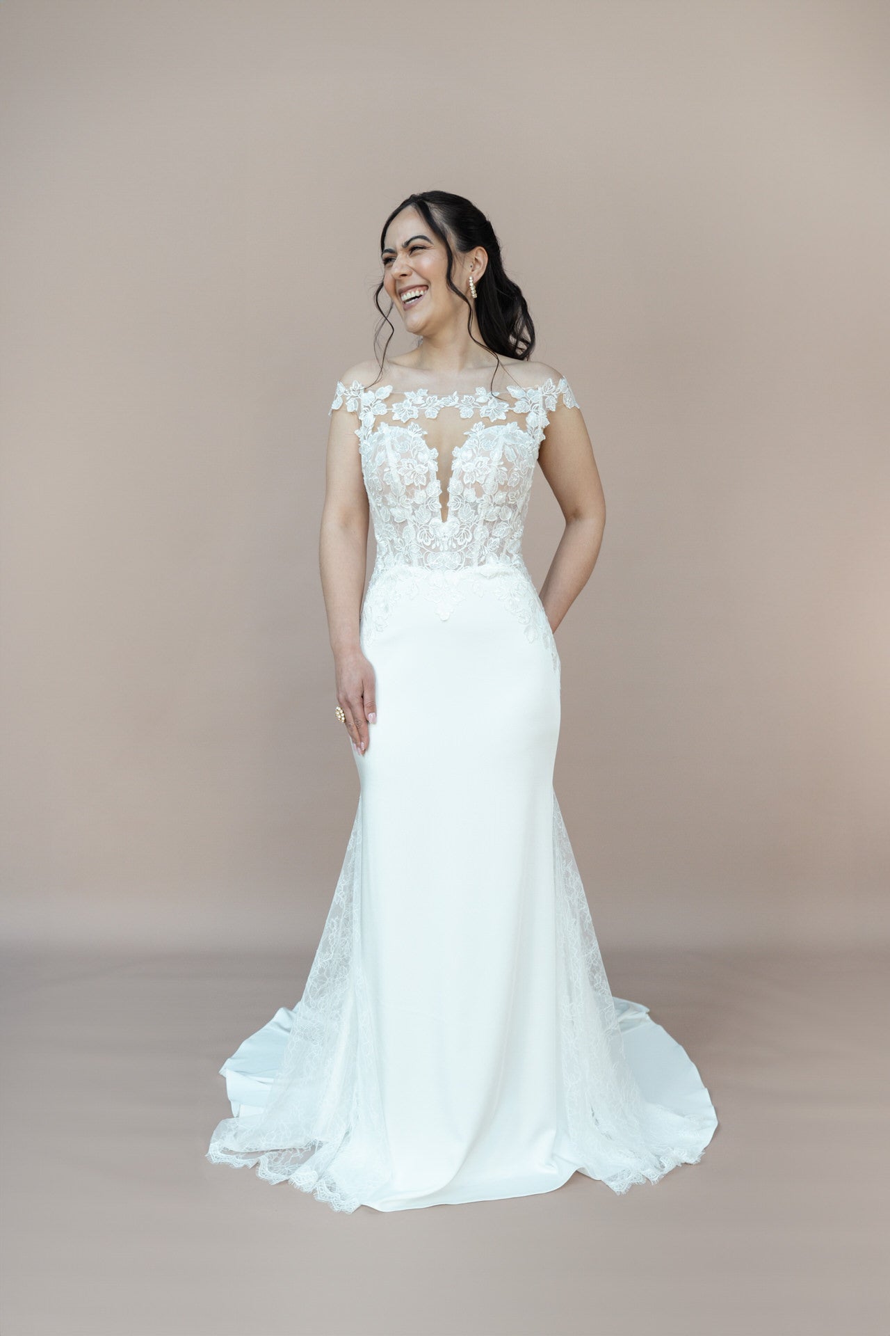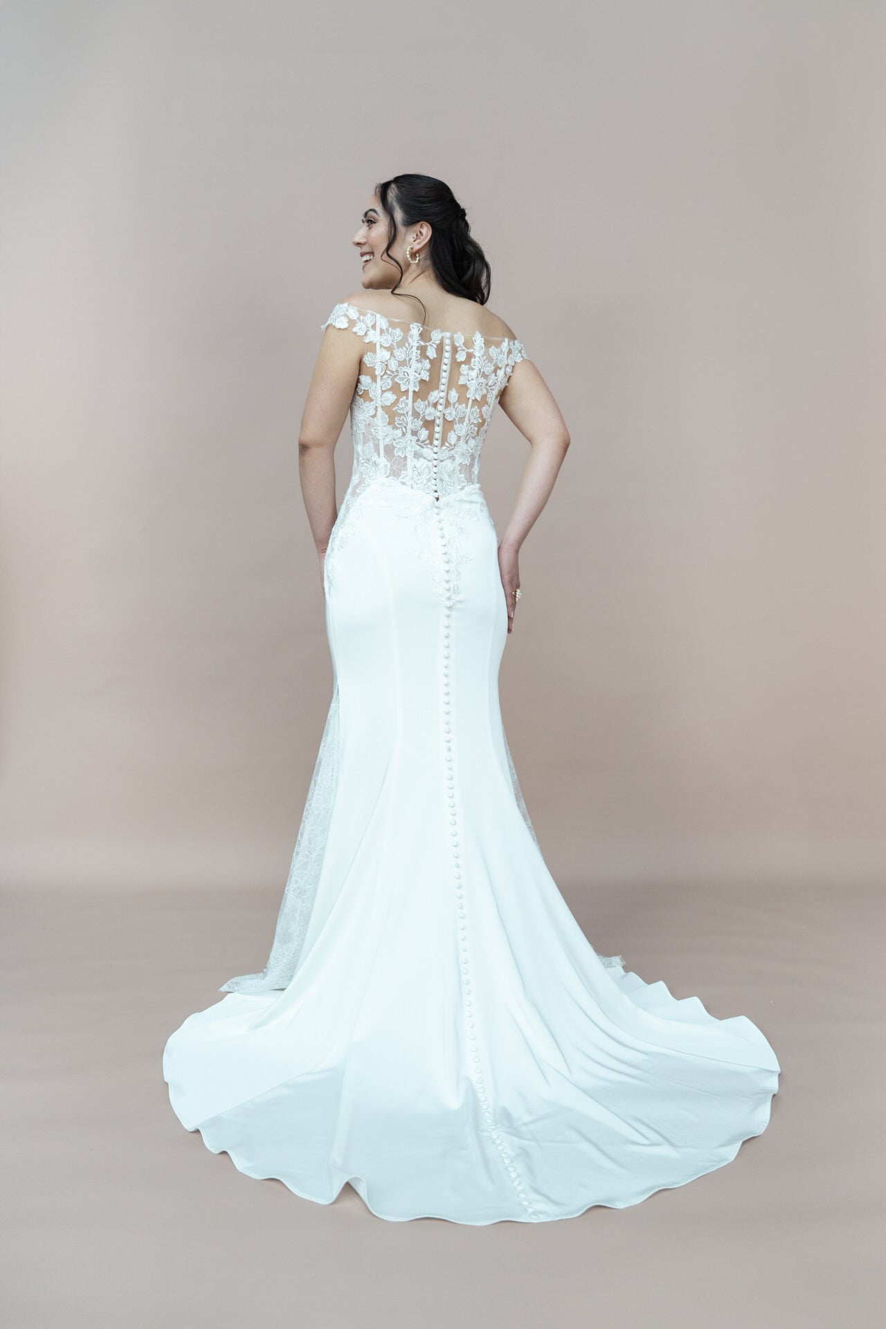 Die mittellange Schleppe sorgt für einen majestätischen Auftritt und begleitet Dich bei jedem Schritt mit anmutiger Leichtigkeit. Der figurbetonte Fit-and-Flare-Schnitt betont Deine Kurven auf wunderbare Weise und schafft eine perfekte Balance zwischen Komfort und Glamour.