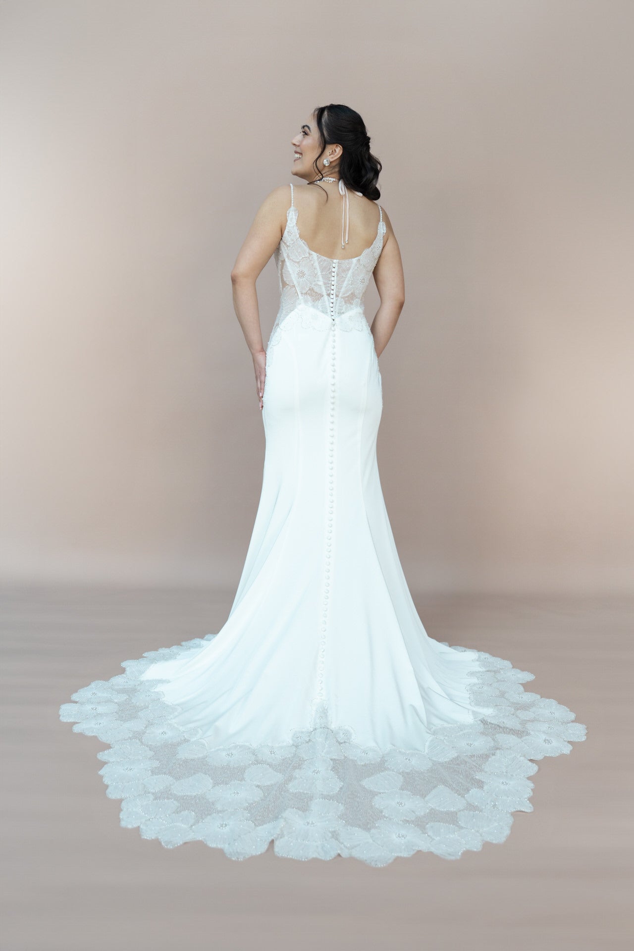 Die elegante Knopfleiste am Rücken rundet das Design stilvoll ab und unterstreicht die hochwertige Verarbeitung. Die mittellange Schleppe verleiht dem Kleid eine majestätische Eleganz und begleitet Dich bei jedem Schritt mit anmutiger Leichtigkeit.