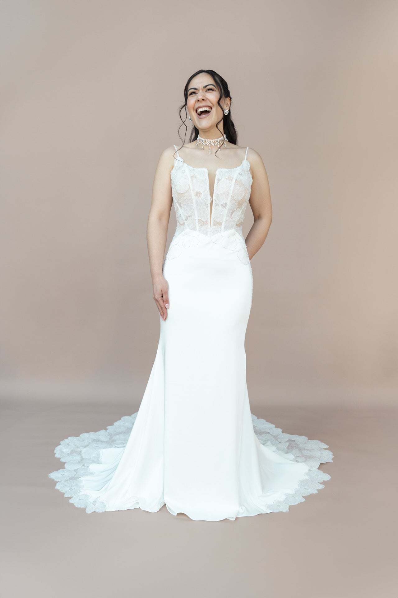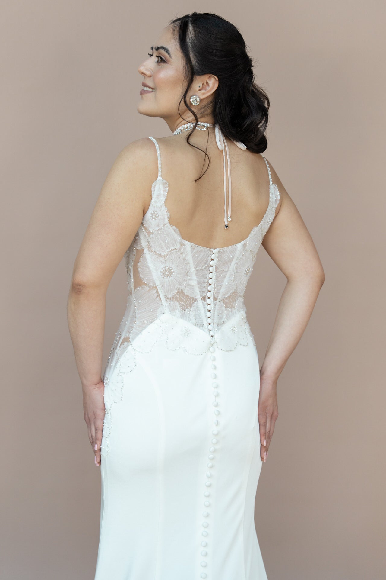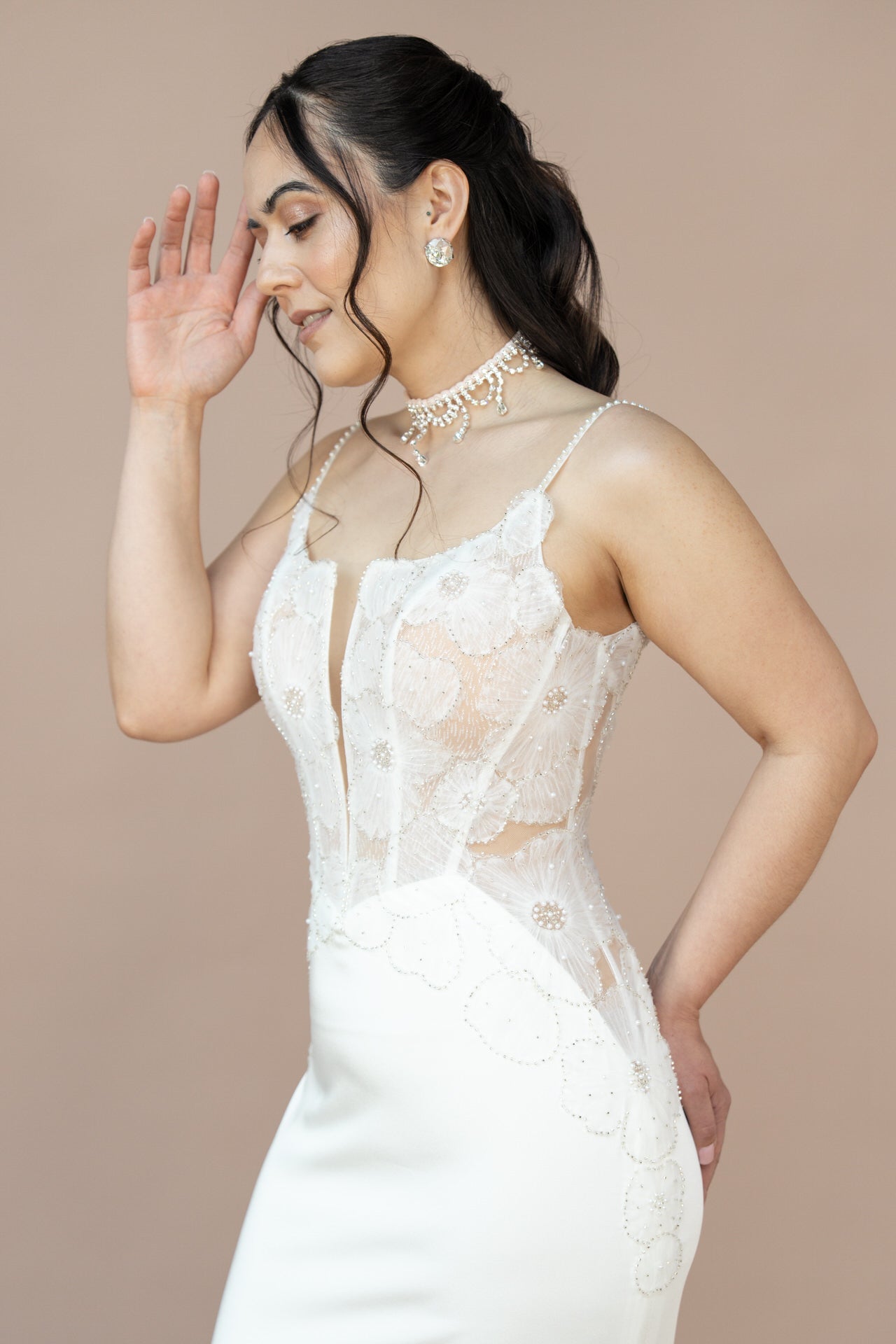 Erlebe die perfekte Kombination aus zeitloser Eleganz und sinnlicher Raffinesse mit dem Bridonista V26-F08 Hochzeitskleid – einem atemberaubenden Fit-and-Flare-Kleid, das den Boho- und Vintage-Stil mit glamourösen Details und einem modernen Lingerie-Look vereint. Dieses Kleid ist die ideale Wahl für die Braut, die an ihrem großen Tag mit Stil, Selbstbewusstsein und einem Hauch von Sexiness begeistern möchte.