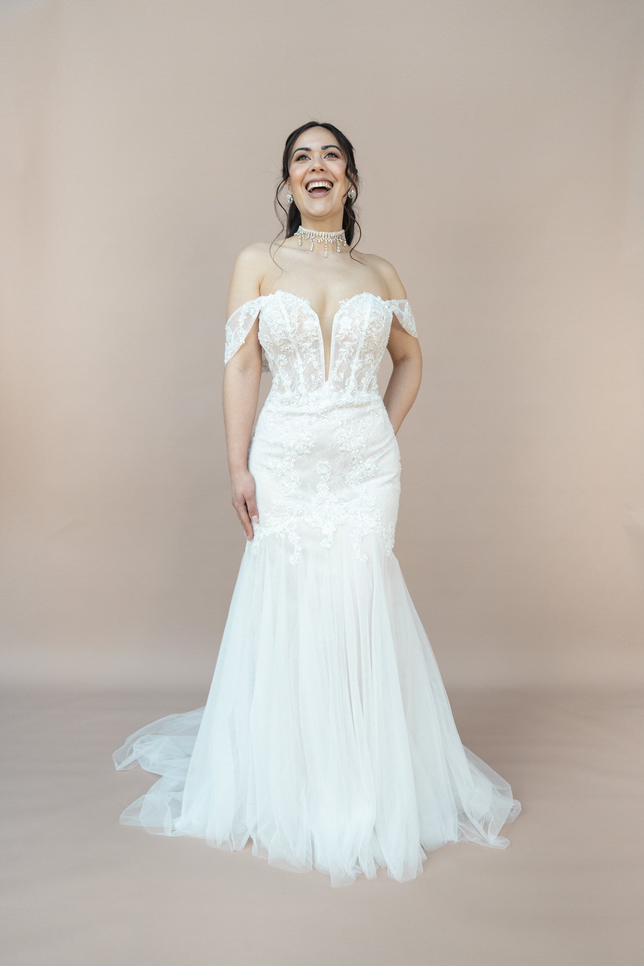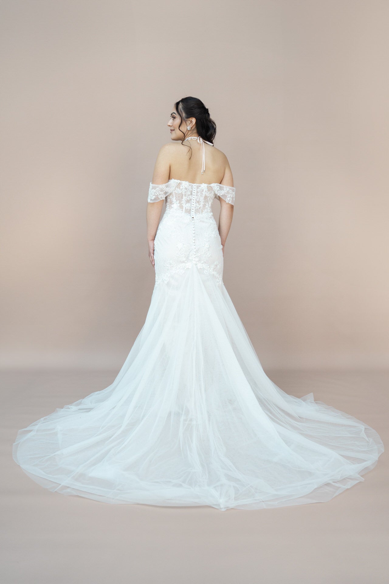 Die mittellange Schleppe rundet das Design majestätisch ab und begleitet Dich bei jedem Schritt mit anmutiger Eleganz. Der figurbetonte Mermaid-Schnitt betont Deine Kurven auf wunderbare Weise und verleiht Dir eine selbstbewusste, sexy Ausstrahlung.