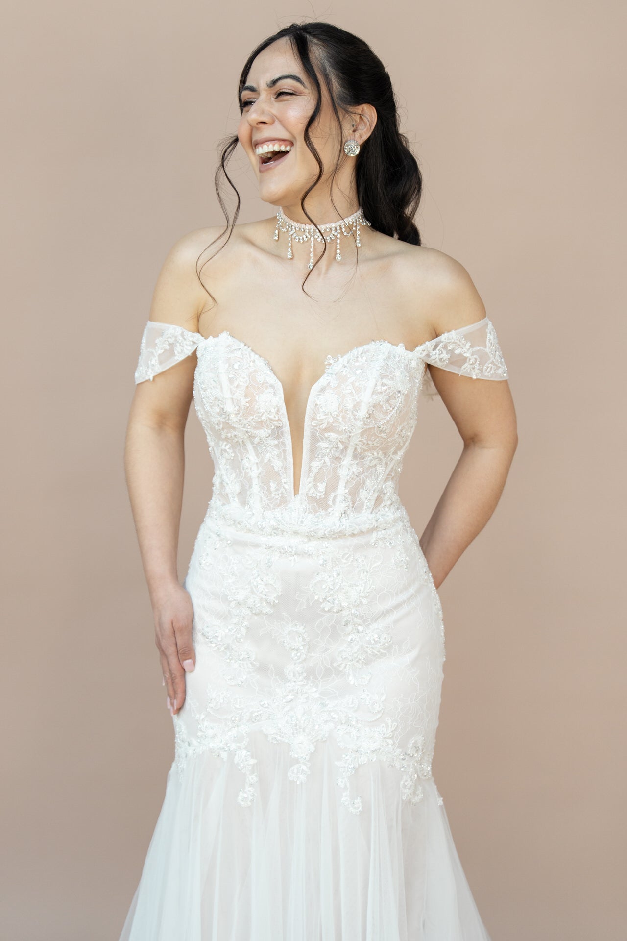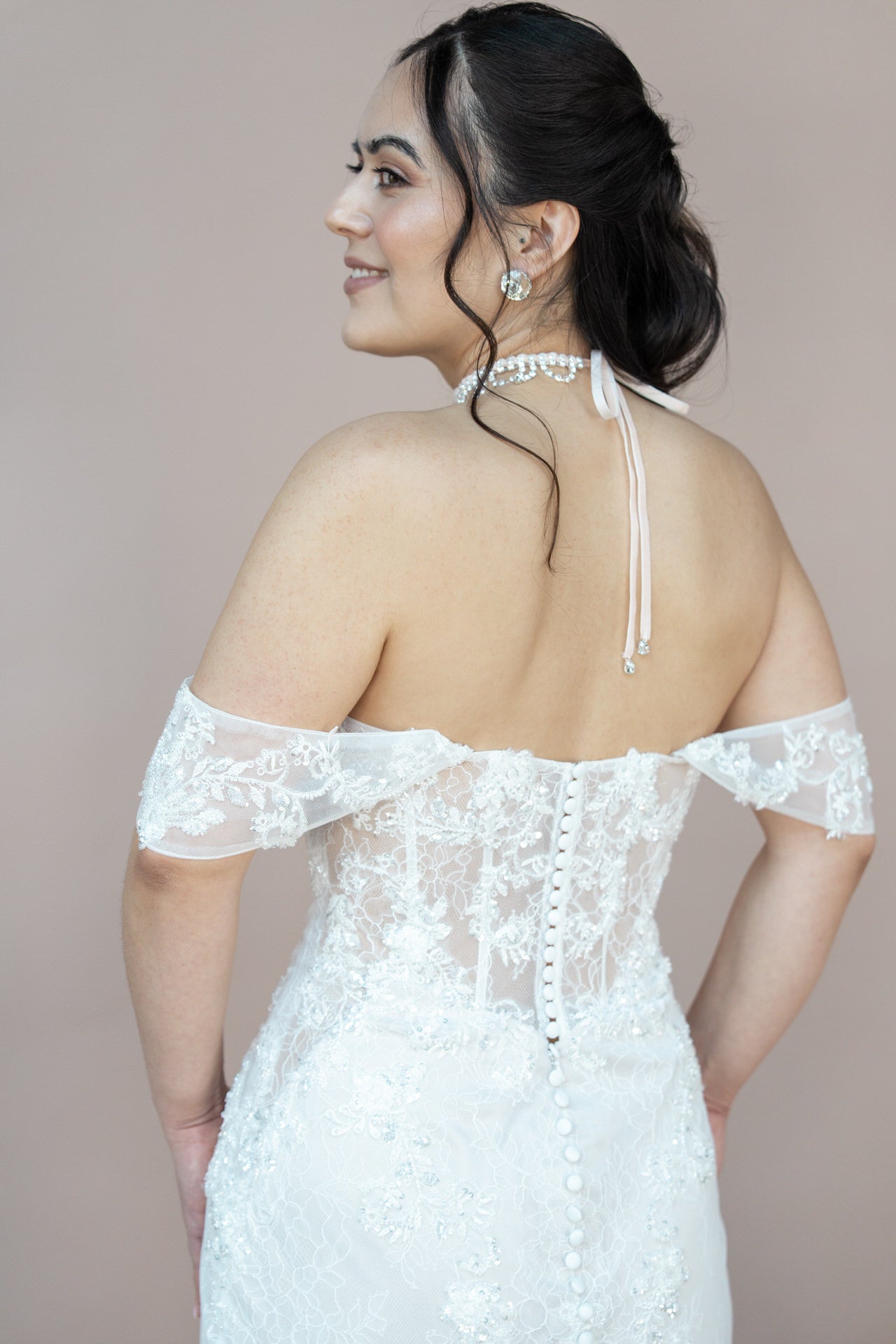 Der herzförmige Ausschnitt setzt Dein Dekolleté verführerisch in Szene und unterstreicht Deine feminine Silhouette. Der Carmen-Ausschnitt verleiht dem Design eine romantische Note, während der gerade Rücken mit Illusion-Tüll und eleganter Knopfleiste für einen stilvollen Akzent sorgt.